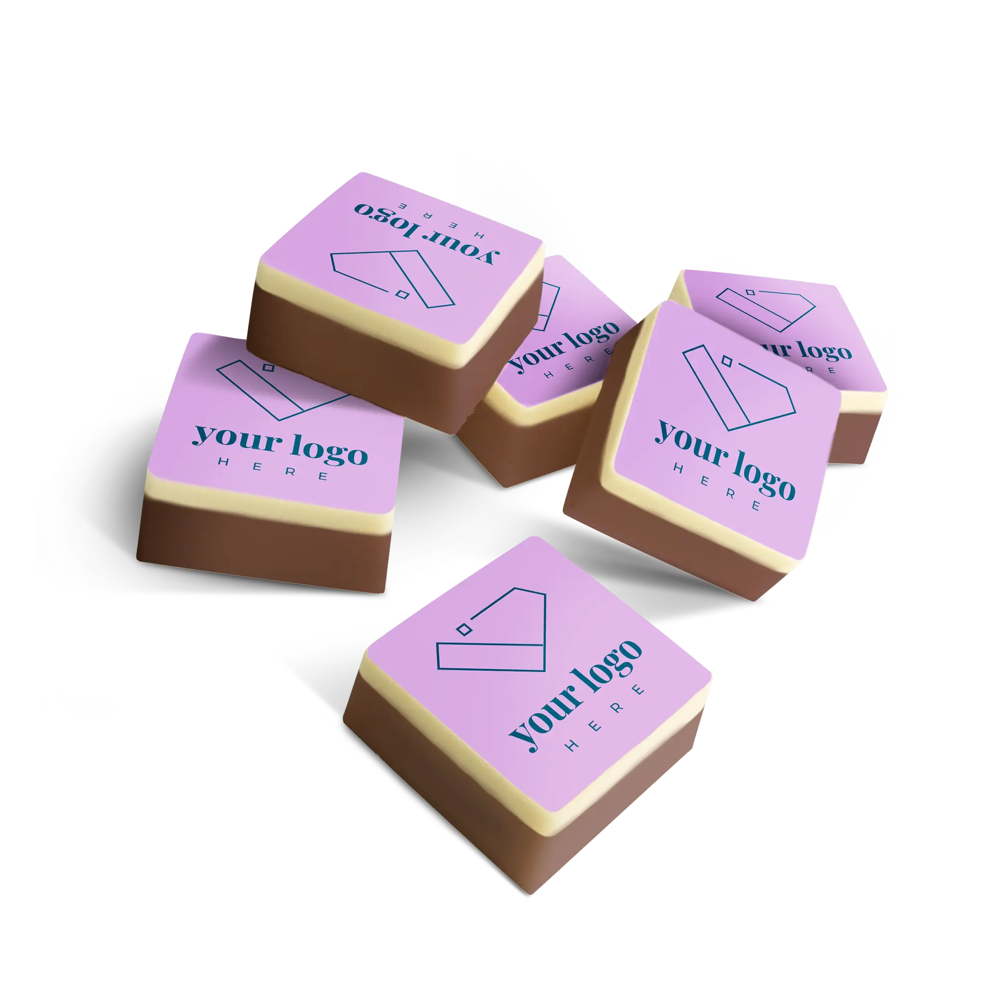 Quantità: 48 cioccolatini Cioccolato: cioccolato al latte e cioccolato con rivestimento di cioccolato bianco Forma: quadrata Dimensione dei cioccolatini: 2,6 x 2,6 cm Personalizzazione: stampata con foto o logo Stampa: commestibile e a colori Se le temperature superano i 25 gradi, ti consigliamo di aggiungere un articolo congelato al tuo ordine. Ingredienti: Cioccolato al latte: zucchero, burro di cacao, latte intero in polvere, massa di cacao, emulsionante (lecitina di soia), aromatizzante naturale alla vaniglia. Almeno 34% di solidi di cacao. Cioccolato bianco: zucchero, burro di cacao, latte intero in polvere, emulsionante (lecitina di soia), aromatizzante naturale alla vaniglia. Almeno 29% di solidi di cacao. Consigli di stoccaggio: puoi conservare i cioccolatini per un massimo di 10 settimane in un luogo fresco e buio con una temperatura tra 14-18°C. Informazioni sugli allergeni: contiene soia, latte. La dimensione di ogni cioccolatino è 2,6 x 2,6 cm. La dimensione può variare leggermente da cioccolatino a cioccolatino.