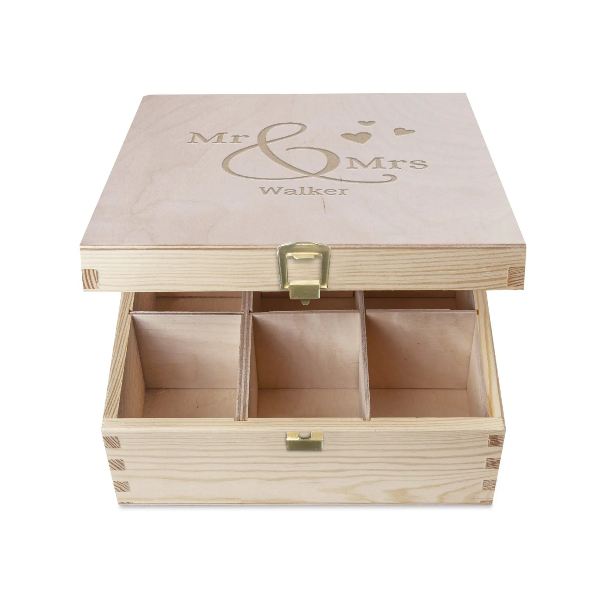 Ulteriori informazioni sulla scatola per tè in legno con nome: Materiale: splendido legno di faggio europeo Dimensioni: 20,8 x 24 x 9,8 cm Scomparti: 9 Personalizzazione: con nome o testo Metodo di personalizzazione: incisione laser di alta qualità Colore dell'incisione: marrone (color legno) Extra: il legno è un prodotto naturale e ciò significa che il tuo regalo potrebbe risultare leggermente diverso da come appare nelle immagini sul sito. Buono a sapersi: La scatola per tè dispone di scomparti intercambiabili. Ciò significa che, per esempio, potresti mettere nella scatola anche i tuoi cucchiaini da tè preferiti. Se desideri che sul coperchio venga inciso un logo, ti invitiamo a contattare il servizio clienti per ulteriori informazioni