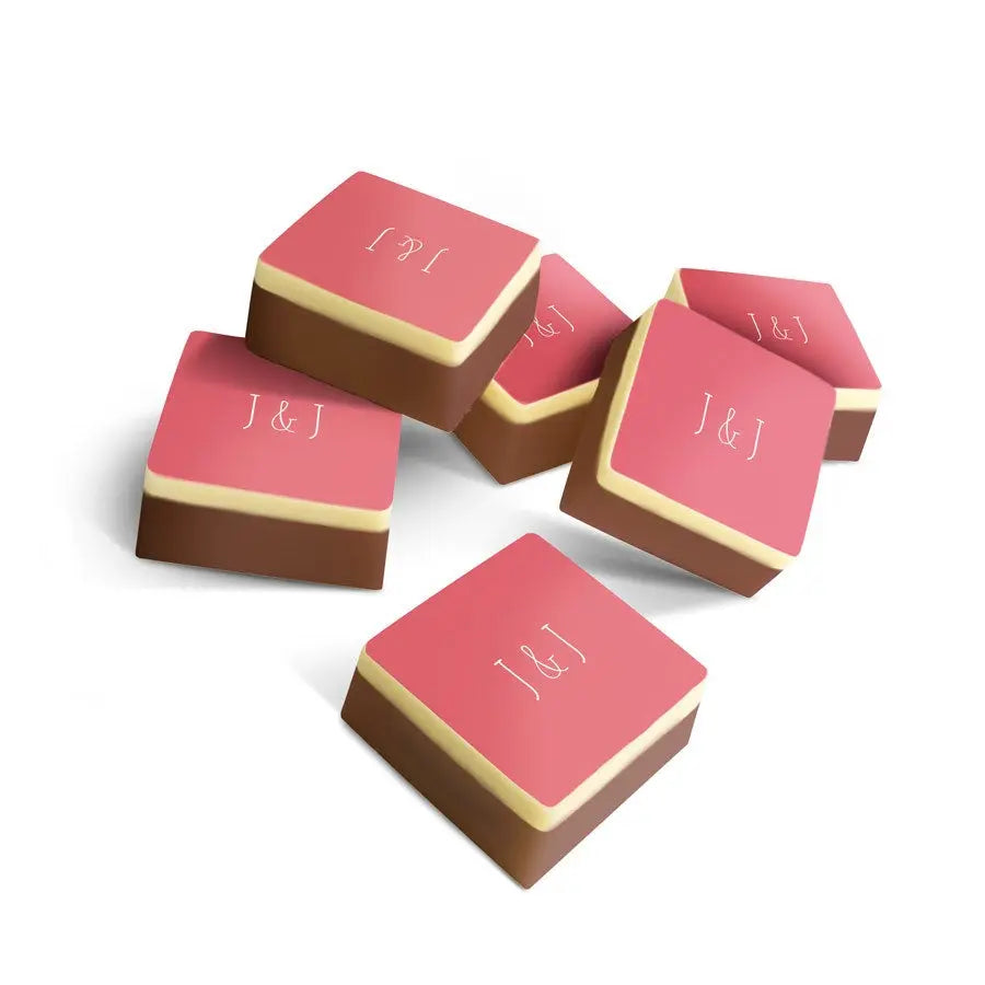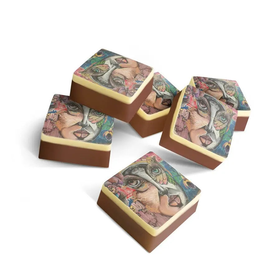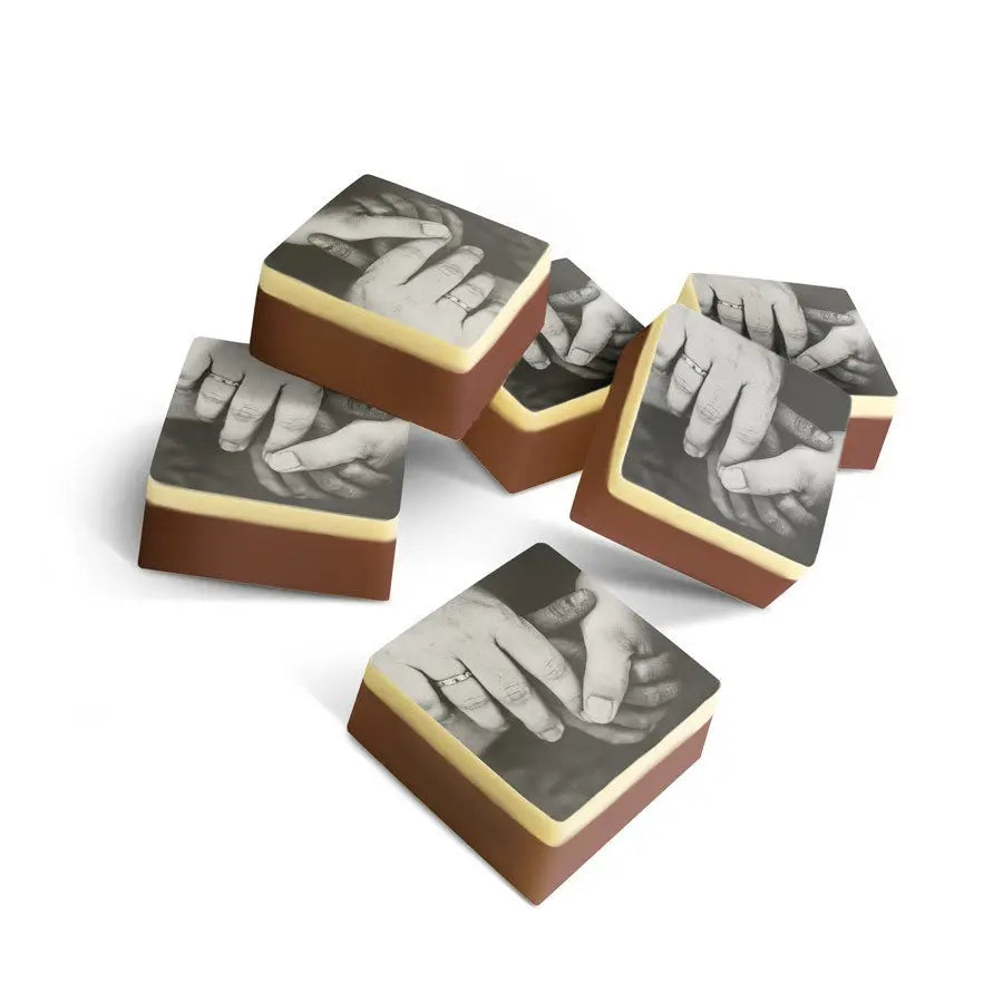 Maggiori informazioni sui cioccolatini solidi personalizzati:Quantità: set di 15, 24 o 60 cioccolatiniDimensioni: 2,6 x 2,6 cm per cioccolatino, può variare leggermente per cioccolatinoCioccolato: cioccolato al latte con uno strato di cioccolato bianco sopraForma: quadrataPersonalizzazione: stampata con foto o logoStampa: stampa commestibile a coloriSe le temperature sono a 25°C o superiori, ti consigliamo di aggiungere un elemento di raffreddamento al tuo ordine. Consigli di conservazione: può essere conservato fino a 10 settimane in un luogo fresco e buio tra 14-18°C. Informazioni sugli allergeni: contiene soia, latte e può contenere tracce di frutta a guscio.Ingredienti:Cioccolato al latte: zucchero, burro di cacao, latte in polvere intero, massa di cacao, emulsionante (lecitina di soia), aroma naturale di vaniglia. Almeno 34% solidi di cacao. Cioccolato bianco: zucchero, burro di cacao, latte in polvere intero, emulsionante (lecitina di soia), aroma naturale di vaniglia. Almeno 29% solidi di cacao.