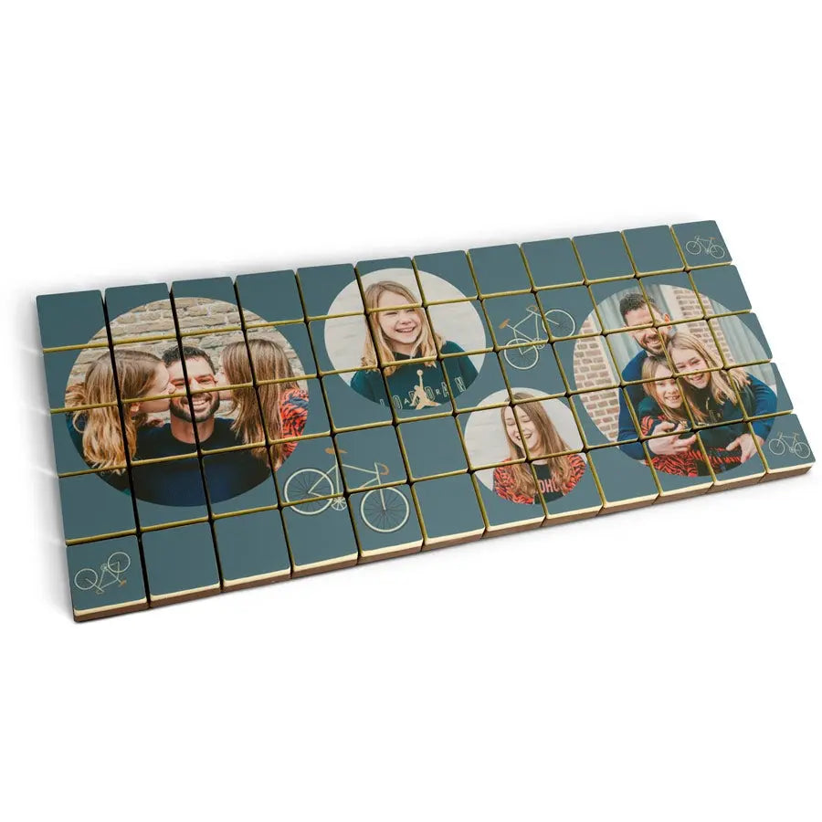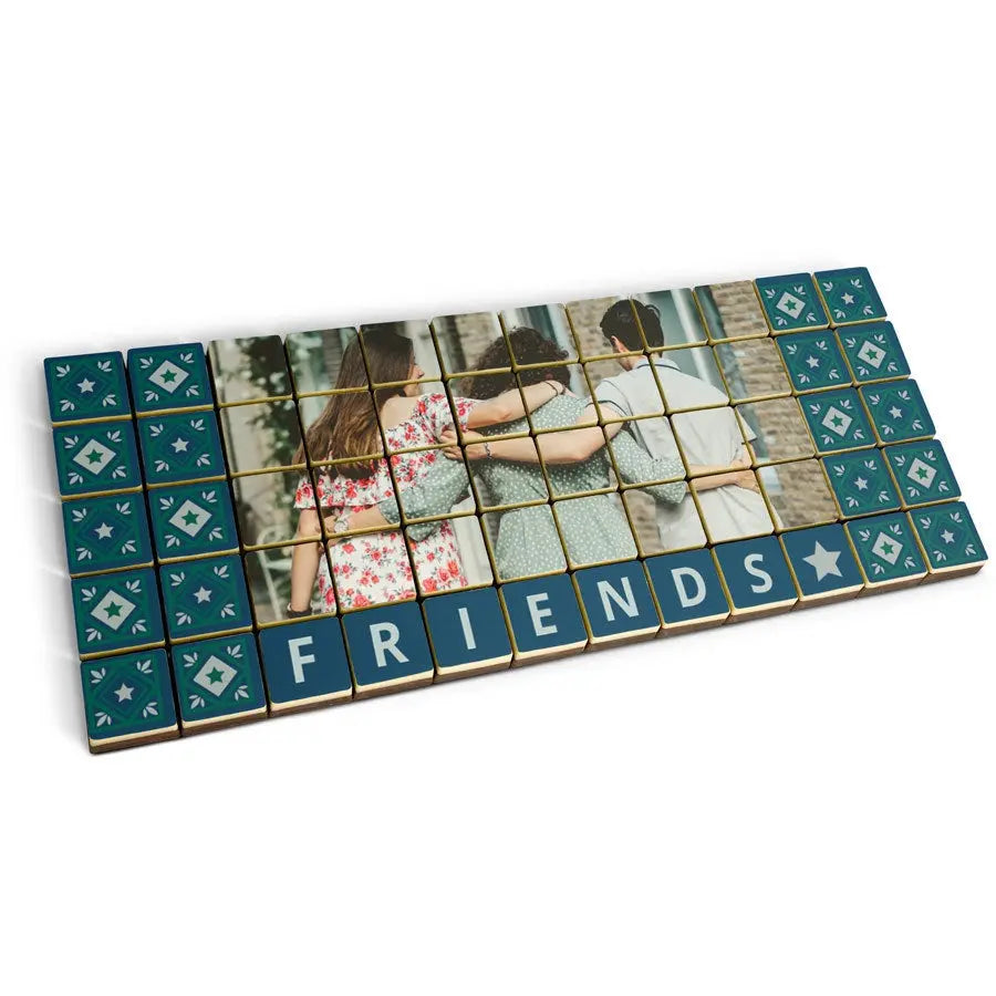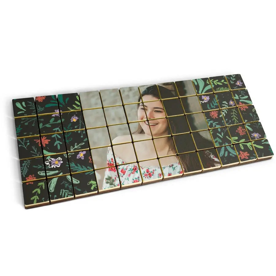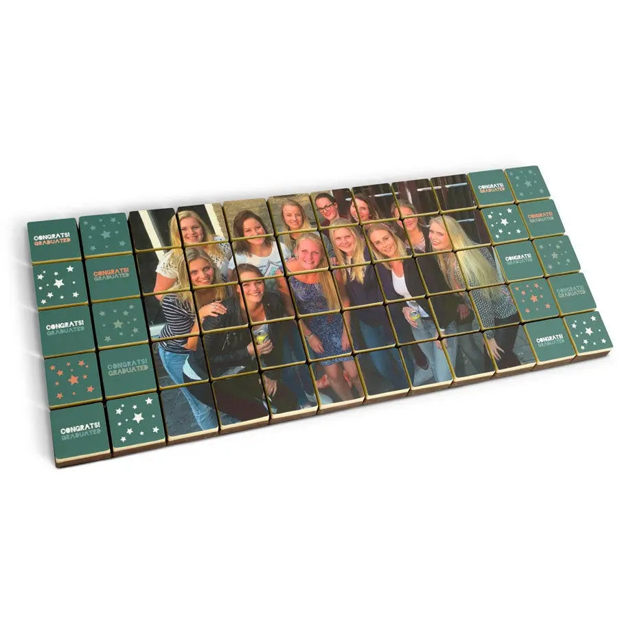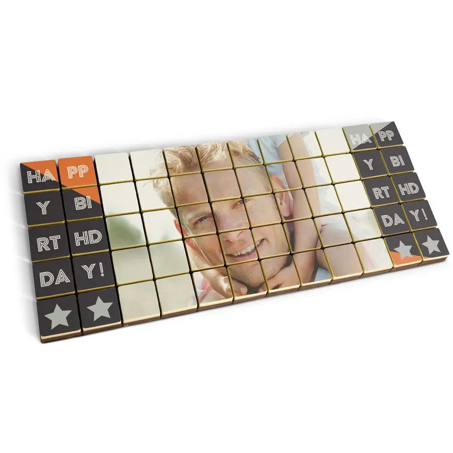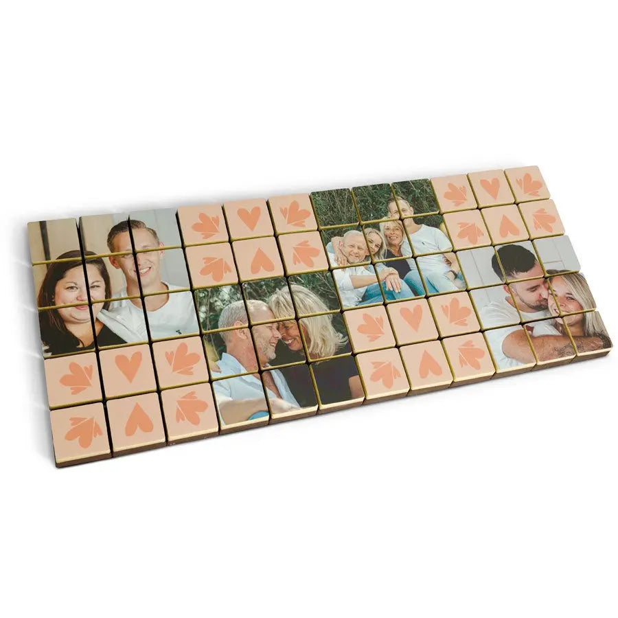 Ulteriori informazioni sui cioccolatini: Quantità: 60 cioccolatini Cioccolato: cioccolato al latte con uno strato di cioccolato bianco in cima Dimensioni per cioccolato: 2,5 x 2,5 x 1,2 cm Dimensioni per set: 23 x 18 x 2,5 cm Personalizzazione: stampato con foto e/o logo Stampa: edibile a coloriImportante: consigliamo di aggiungere un elemento di raffreddamento al tuo ordine quando le temperature arrivano a o superano i 25° C.Consigli per la conservazione: Tenere in un luogo fresco e asciutto (temperatura tra 14-18°C). Può durare fino a un massimo di 10 settimaneAllergeni: soia, latte, può contenere tracce di frutta a guscio. Contiene glutine.Attenzione: Un'immagine dai colori troppo chiari potrebbe non avere una buona resa sul prodotto finale.Ingredienti:Cioccolato al latte: zucchero, burro di cacao, latte intero in polvere, pasta di cacao, emulsionante (lecitina di soia), aroma naturale di vaniglia. Contiene almeno il 34% di cacao. Cioccolato bianco: zucchero, burro di cacao, latte intero in polvere, emulsionante (lecitina di soia), aroma naturale di vaniglia. Contiene almeno il 29% di cacao
