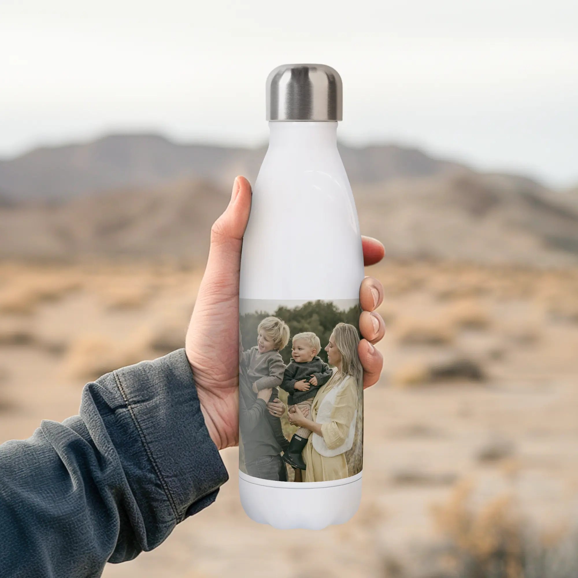 Personalizza una borraccia in acciaio inox con la foto, il testo o il logo che preferisci. Creala ora!Maggiori informazioni sulla borraccia personalizzata: Materiale: acciaio inox e alluminio di alta qualità Colore: bottiglia bianca con tappo argento Capacità: 500 ml Personalizzazione: foto, testo e/o logo Stampa: perfetta e a colori Termos: mantiene fresco fino a 24 ore, caldo fino a 12 ore Extra: a prova di perdite e isolata, lavaggio a mano consigliato La bottiglia è priva di BPA.