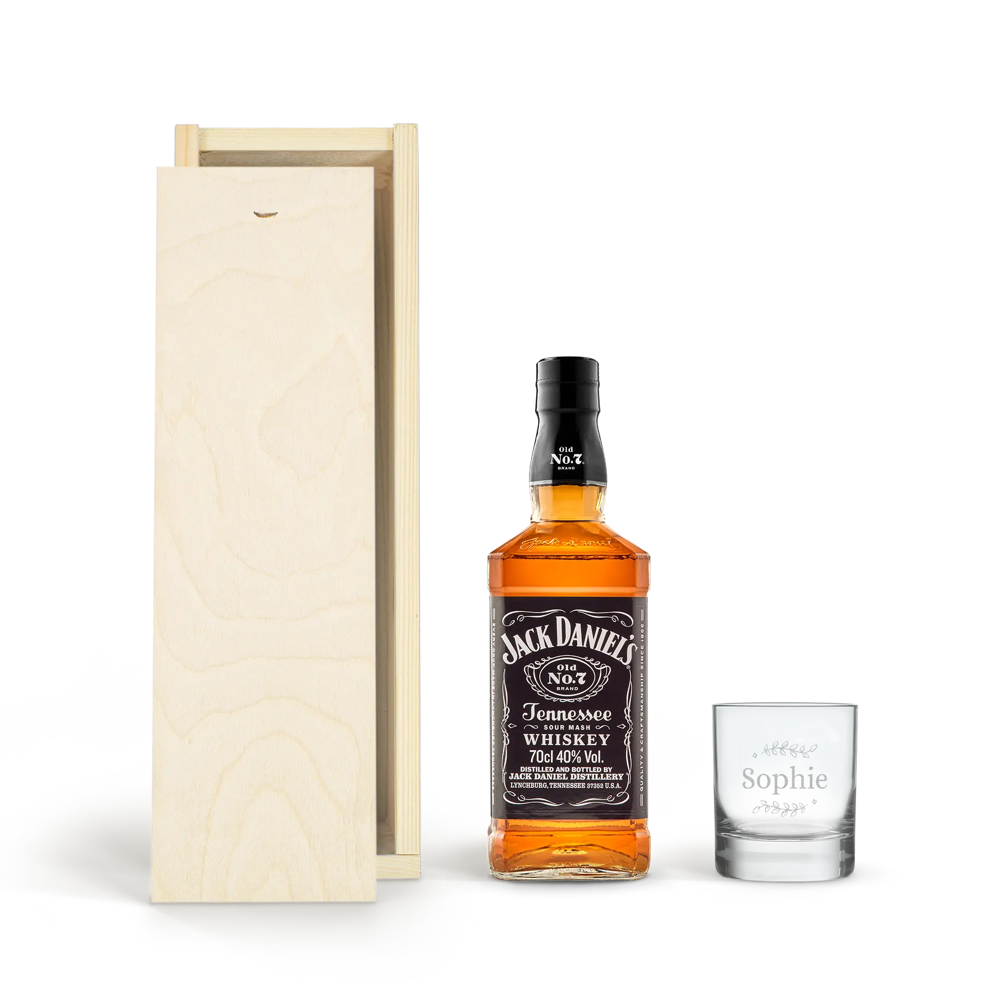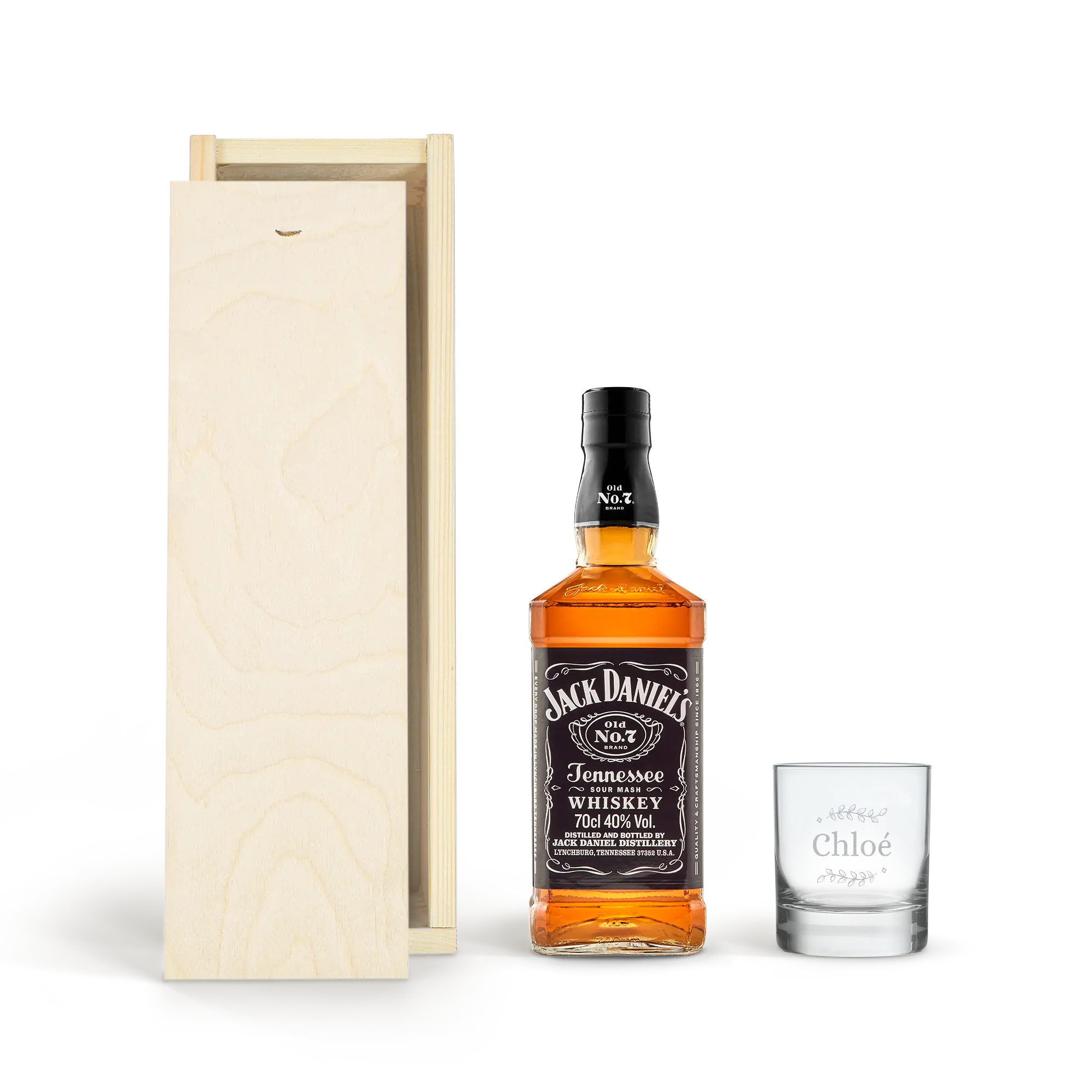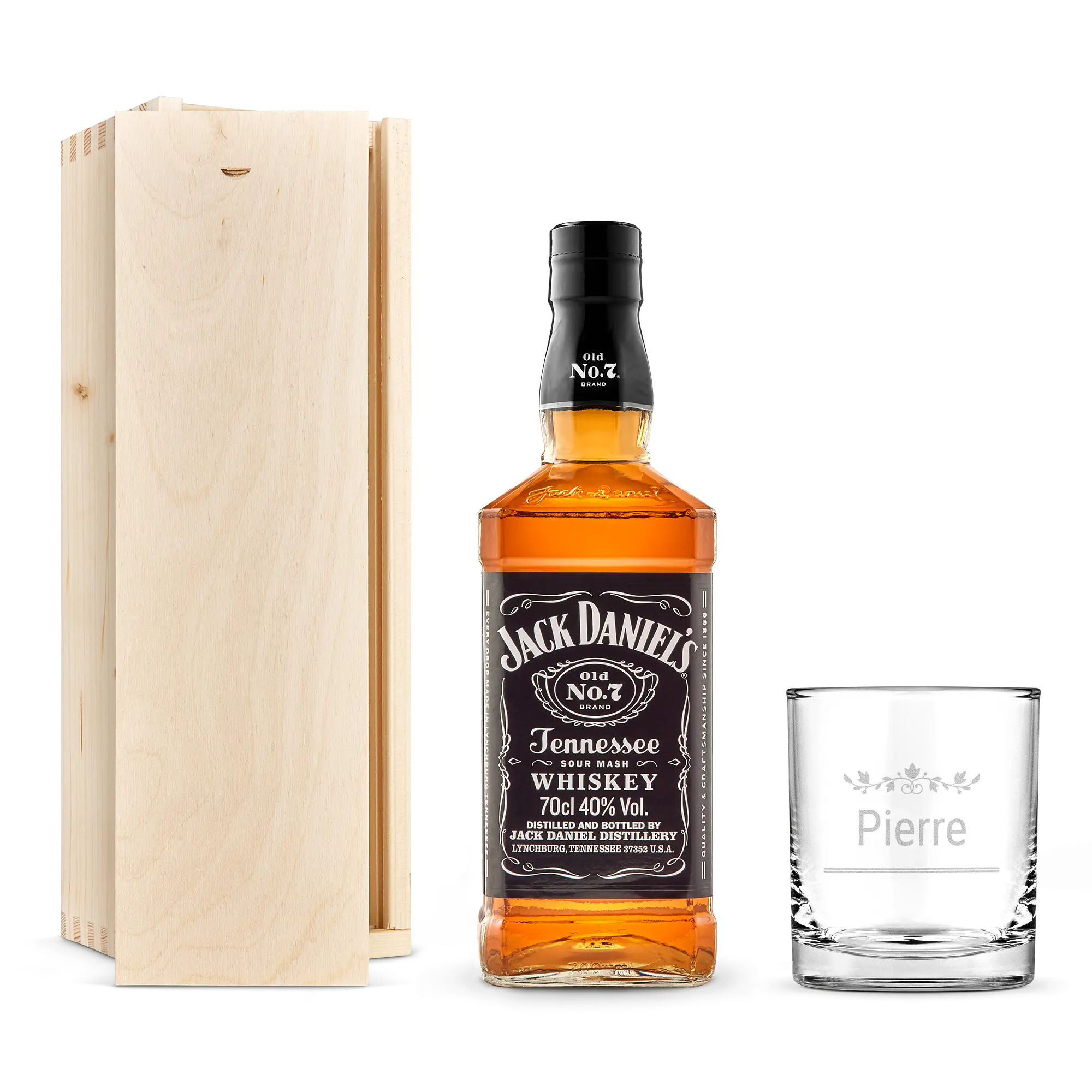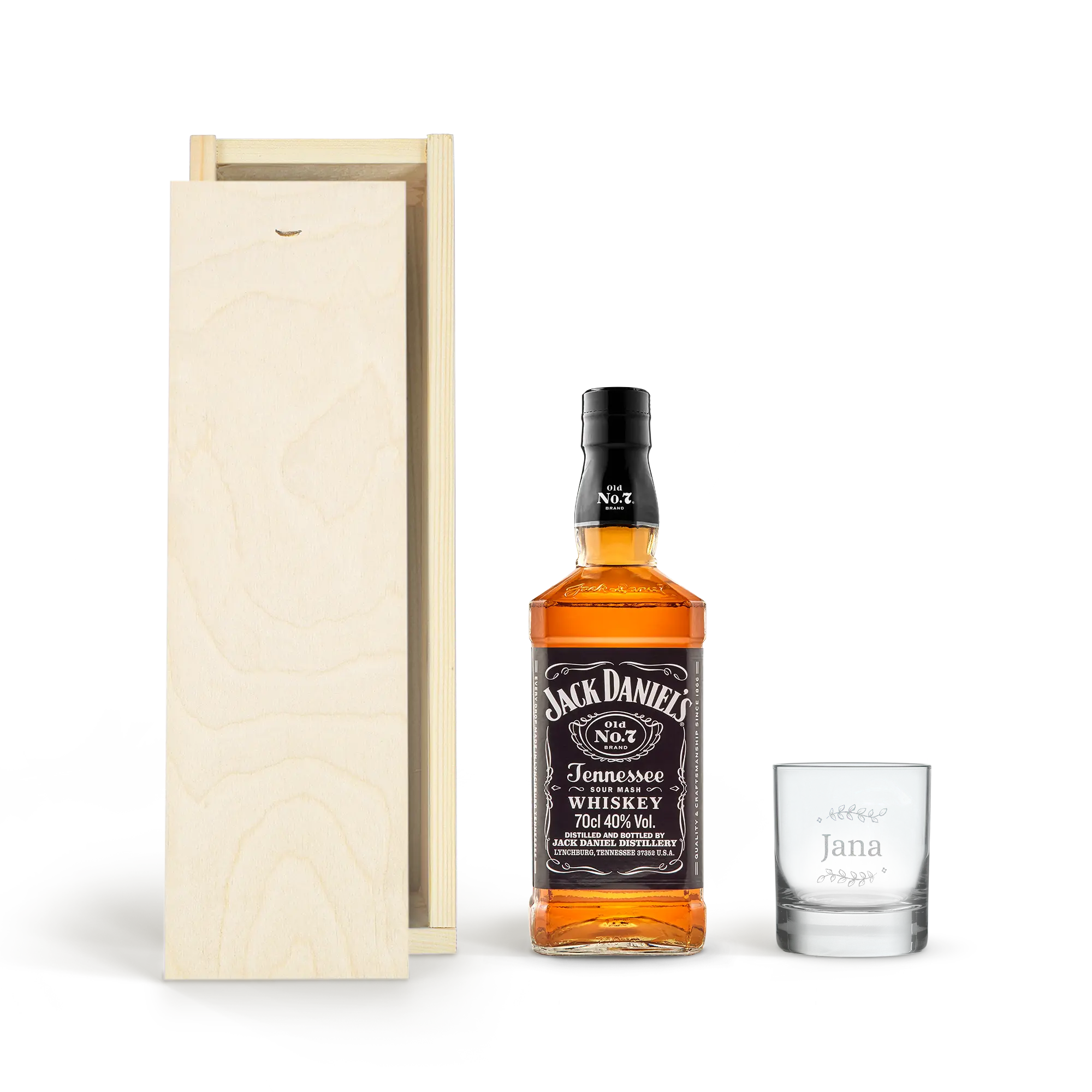 Set regalo personalizzato con una deliziosa bottiglia di Jack Daniels e un bicchiere inciso. Un bicchiere di whisky personalizzato con il tuo nome di testo, evviva!Maggiori informazioni sulla personalizzazione: Personalizzazione: incisione Colore dell'incisione: bianco Dimensioni scatola: 36,5 x 12 x 11 cm Extra: la scatola di legno è certificata FSC Maggiori informazioni su questo whisky: Nome: Jack Daniels Paese di origine: America Contenuto: 0,7 l Percentuale di alcol: 40% Caratteristiche: Il whisky Tennessee Jack Daniels ha un leggero mix fruttato di caramello, vaniglia, spezie e rovere tostato.