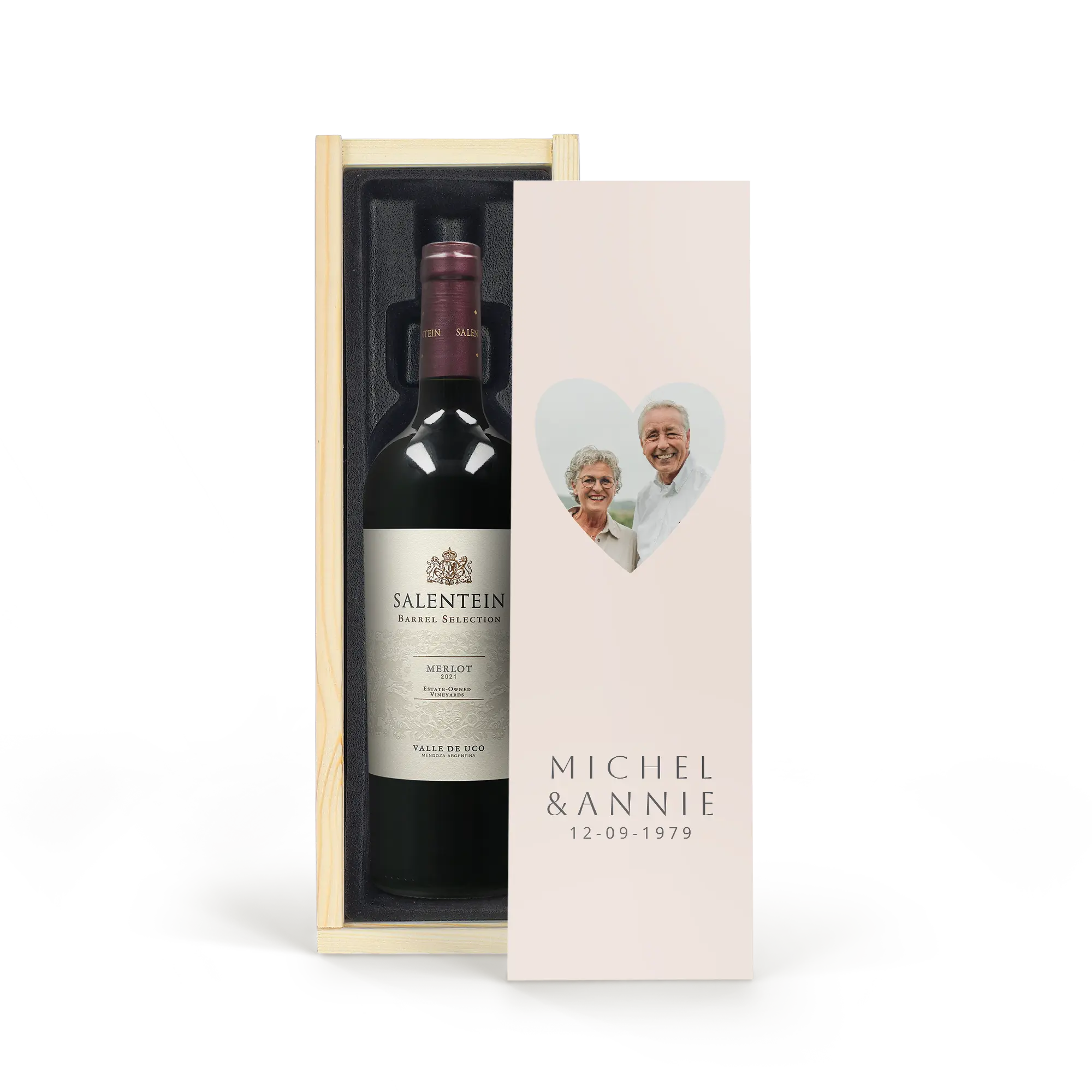 Una splendida bottiglia di sallot in un vino personalizzato. Vari disegni con la tua foto, logo o testo. Un regalo unico per molte occasioni!Maggiori informazioni sulla personalizzazione: Personalizzazione: sul coperchio Stampa: a colori in qualità fotografica HD Dimensioni scatola: 36,5 x 12 x 11 cm Coperchio delle dimensioni: 36,5 x 10,2 x 0,3 cm Extra: la scatola di legno è certificata FSC Maggiori informazioni su questo vino: Nome: Salentein Merlot Paese di origine: Argentina Tipo di vino: rosso Uva: Merlot Caratteristiche: aroma di mirtillo dolce con sentori di erbe aromatiche, menta e legno di cedro. Questo vino è robusto, fruttato, strutturato e perfettamente equilibrato. Un consiglio da parte nostra: questo vino si abbinerà magnificamente con carne rossa, agnello, patè e vari formaggi