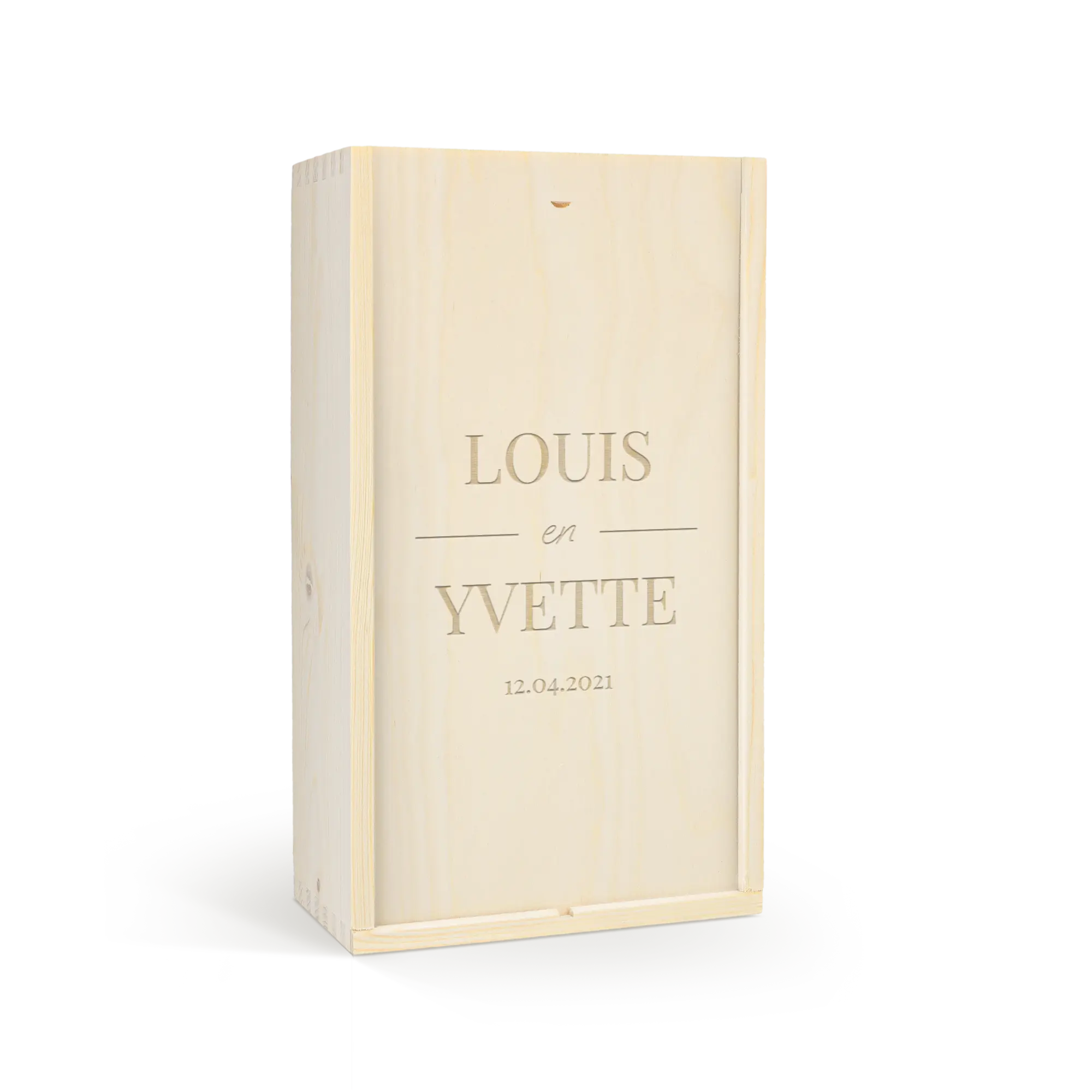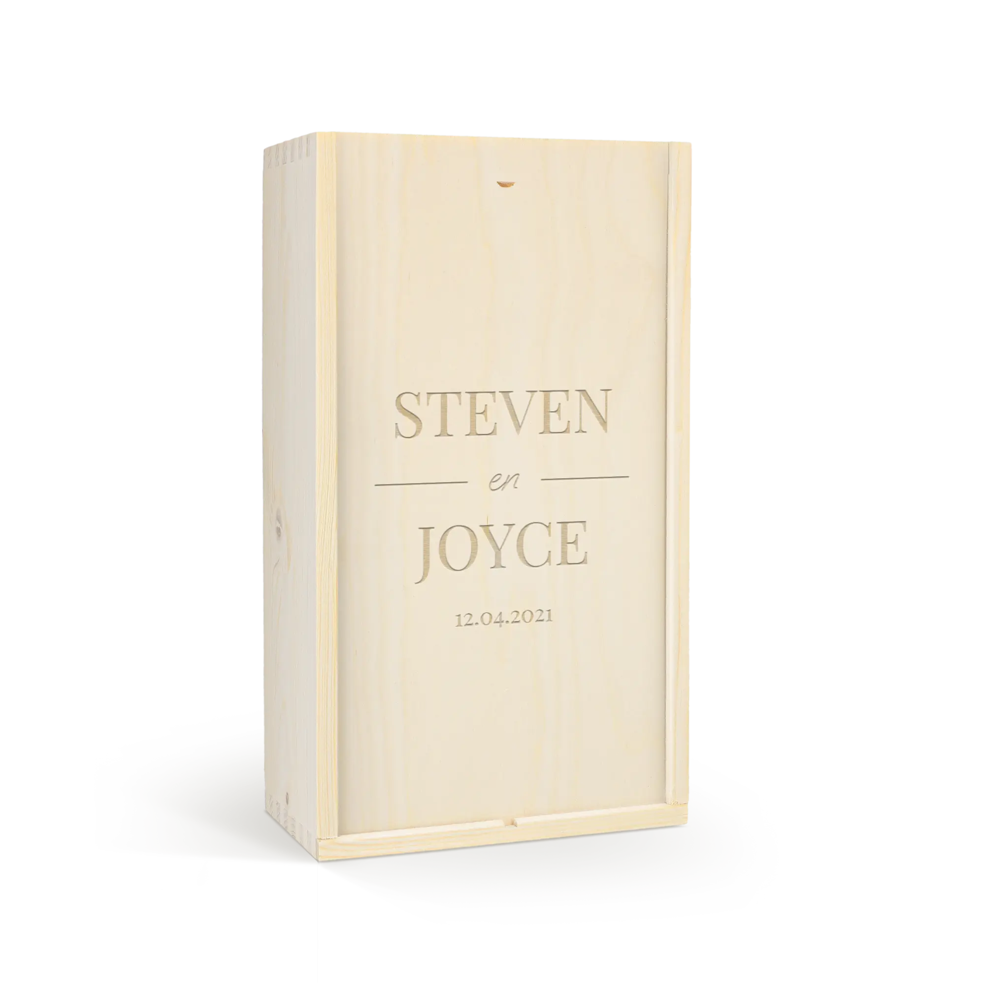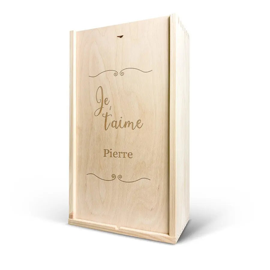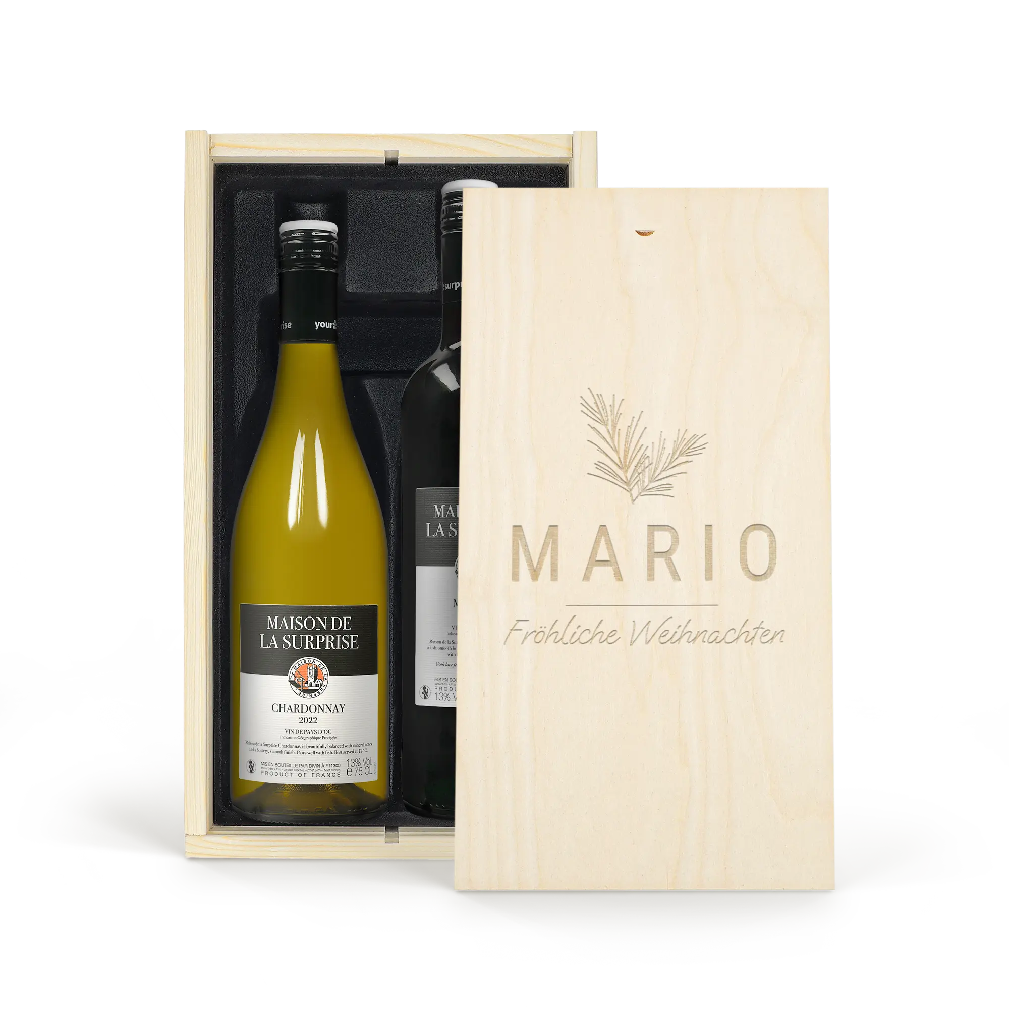 Deliziose bottiglie di vino Maison de la Surprise, davvero personali in una lussuosa custodia incisa con il nome o il testo che preferisci.Ulteriori informazioni sulla lussuosa cassa del vino: Personalizzazione: con nome o testo Posizionamento della personalizzazione: sul coperchio della custodia in legno Incisione: incisione laser di alta qualità Dimensioni della cassa: 36,5 x 20,6 x 11 cm Dimensioni del coperchio: 35,6 x 18,9 x 0,3 cm Il legno è certificato FSC Ulteriori informazioni sui vini: Marchio: Maison de la SurpriseContenuto: 750 ml per bottiglia Paese di origine: Francia Luc Pirlet bianco: Vitigno: Chardonnay Carattere: Maison de la Surprise Chardonnay ha note di gelsomino, pesca bianca e agrumi. Si abbina bene con insalate e frutti di mare. Luc Pirlet rosso: Vitigno: Merlot Carattere: Maison de la Surprise Merlot è un vino pieno e robusto con un profumo intenso di frutti neri e un pizzico di vaniglia. Si abbina bene con pollame e carne arrostita.