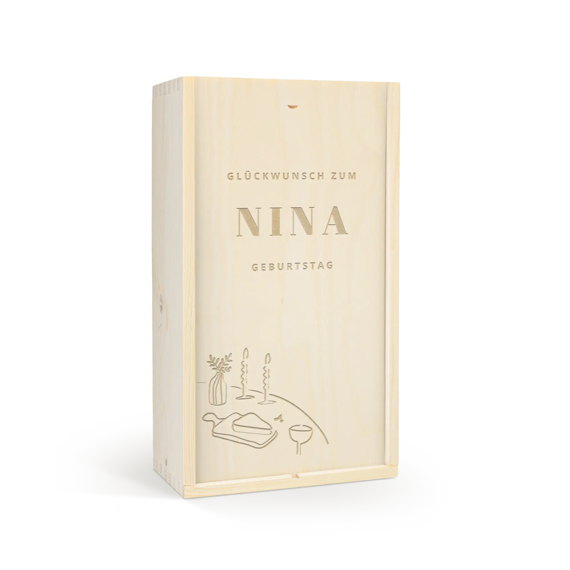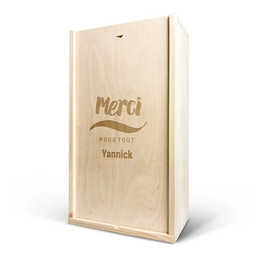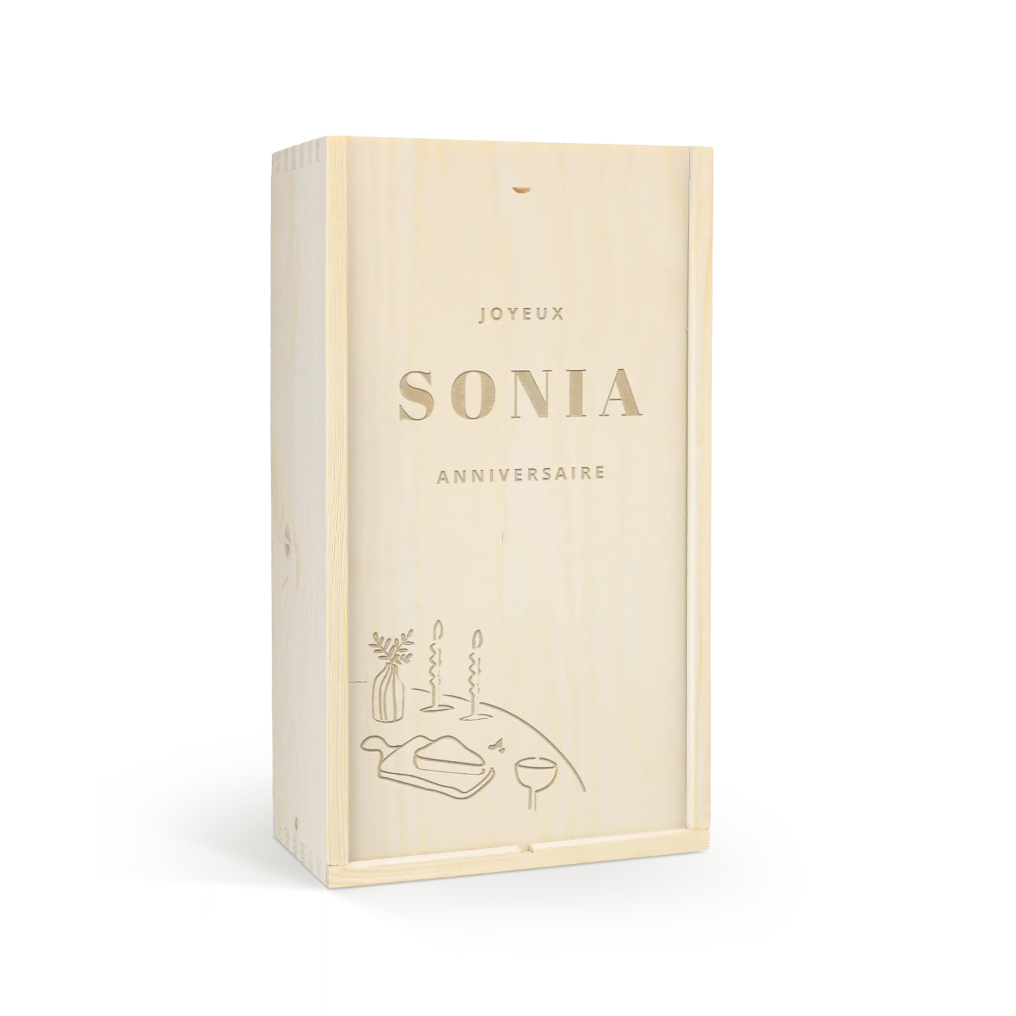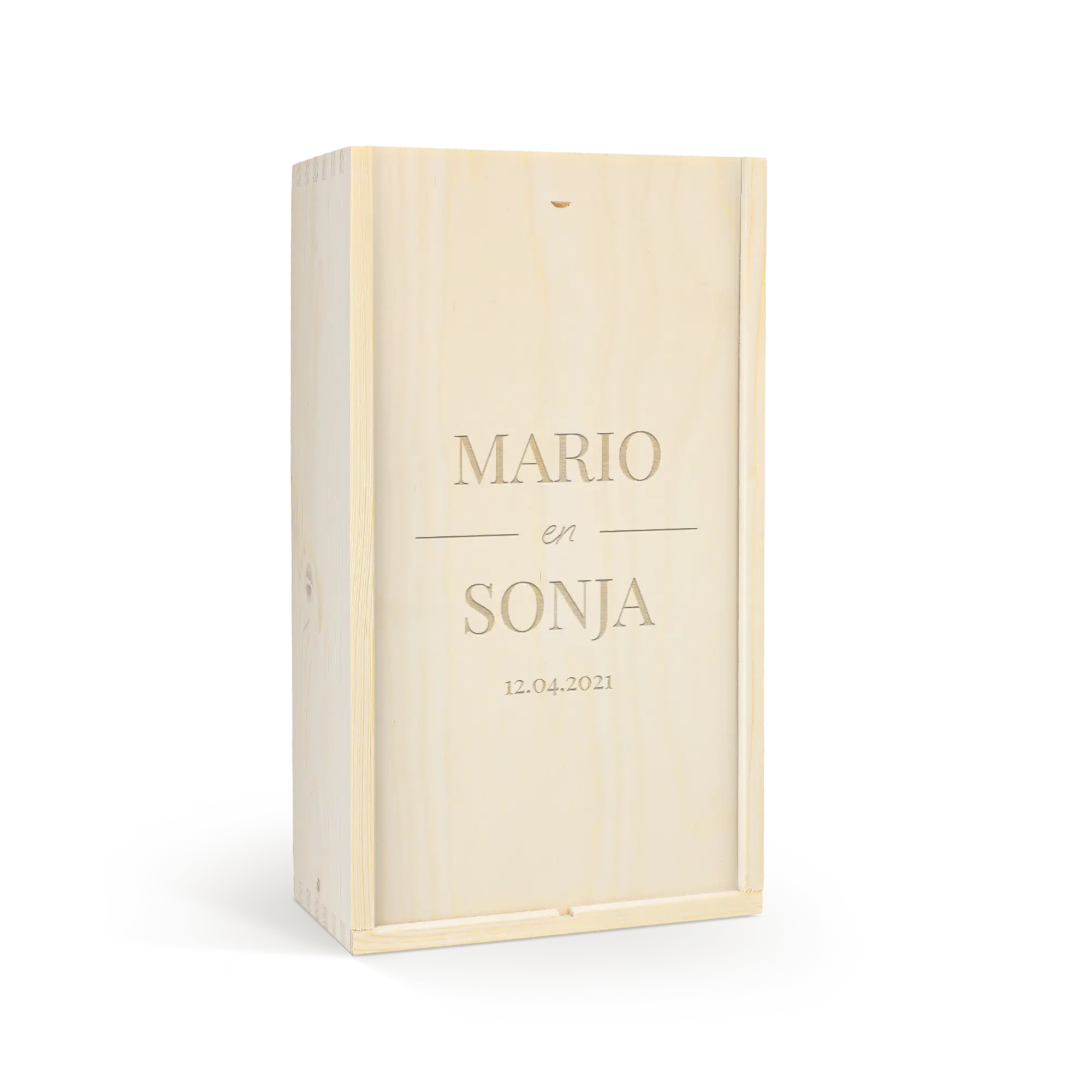 Deliziose bottiglie di vino Maison de la Surprise, davvero personali in una lussuosa custodia incisa con il nome o il testo che preferisci.Ulteriori informazioni sulla lussuosa cassa del vino: Personalizzazione: con nome o testo Posizionamento della personalizzazione: sul coperchio della custodia in legno Incisione: incisione laser di alta qualità Dimensioni della cassa: 36,5 x 20,6 x 11 cm Dimensioni del coperchio: 35,6 x 18,9 x 0,3 cm Il legno è certificato FSC Ulteriori informazioni sui vini: Marchio: Maison de la SurpriseContenuto: 750 ml per bottiglia Paese di origine: Francia Luc Pirlet bianco: Vitigno: Chardonnay Carattere: Maison de la Surprise Chardonnay ha note di gelsomino, pesca bianca e agrumi. Si abbina bene con insalate e frutti di mare. Luc Pirlet rosso: Vitigno: Merlot Carattere: Maison de la Surprise Merlot è un vino pieno e robusto con un profumo intenso di frutti neri e un pizzico di vaniglia. Si abbina bene con pollame e carne arrostita.
