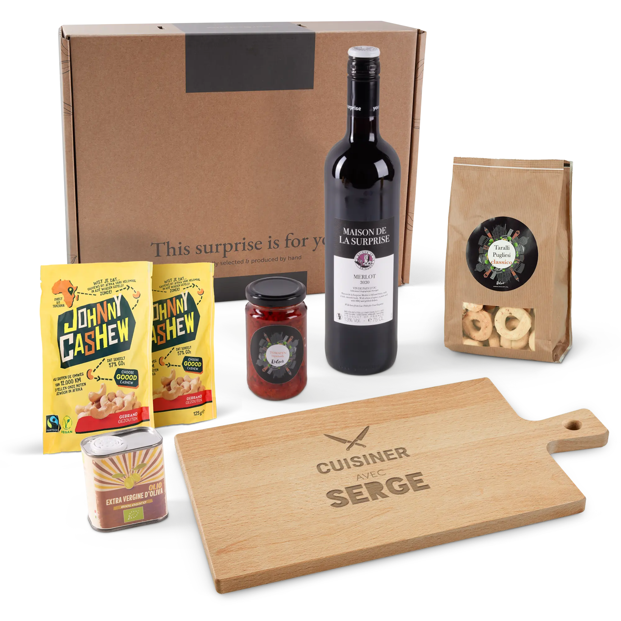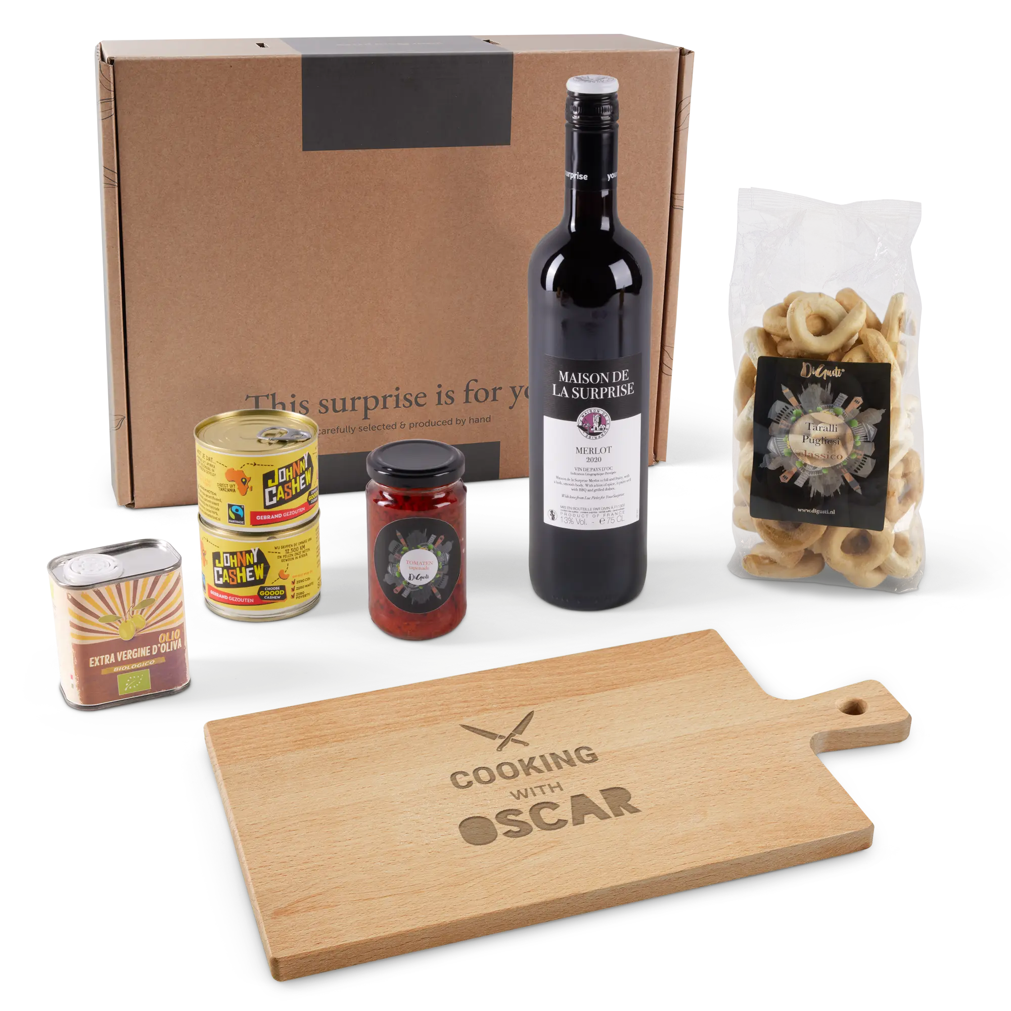 Un tagliere di legno inciso con vino rosso, noci, olio d'oliva e tapenade è il regalo perfetto!Ulteriori informazioni sulla confezione delle bevande:Contenuto: tagliere in legno, olio d'oliva (100ml), taralli (350grammi), tapenade di pomodoro (212ml), anacardi (2x 80grammi), bottiglia di Merlot Maison de la SurpriseDimensioni della confezione: 39 x 30 x 11,5 cmPiù informazioni sul tagliere in legno:Materiale: legno di faggio massiccio di alta qualitàExtra: il legno è certificato FSCFinitura: oliato e include un cordoncino in pelleDimensioni: 36,5 x 20 x 1,5 cmPersonalizzazione: incisione del testoColore dell'incisione: legnoNota bene:- non adatto alla lavastoviglie!- il legno è un prodotto naturale, quindi il vostro regalo potrebbe differire leggermente dalla foto campione.Ulteriori informazioni sul vino:Nome: Maison de la Surprise MerlotTipo di vino: rosso, morbido e fruttatoContenuto: 750 mlPaese di origine: FranciaVarietà: merlotCaratteristiche: Il Merlot Maison de la Surprise ha un sapore intenso di frutti neri e una nota di vaniglia. Ottimo con pollame e carni arrostoIngredienti: anacardi, tostati salati (Johnny Cashew): 96% anacardi, 3% olio di girasole, 1% sale.Allergeni: contiene anacardi. Può contenere tracce di arachidi.Ingredienti tapenade di pomodoro (DiGusti): pomodori essiccati al sole, olio di semi di girasole, sale, aceto (ponte solitario), aglio, aromi.Ingredienti taralli (DiGusti): farina tipo ''0'', vino bianco, olio di semi di girasole, olio extravergine di oliva, sale.Allergeni: contiene cereali con glutine e solfiti. Può contenere tracce di semi di sesamo.