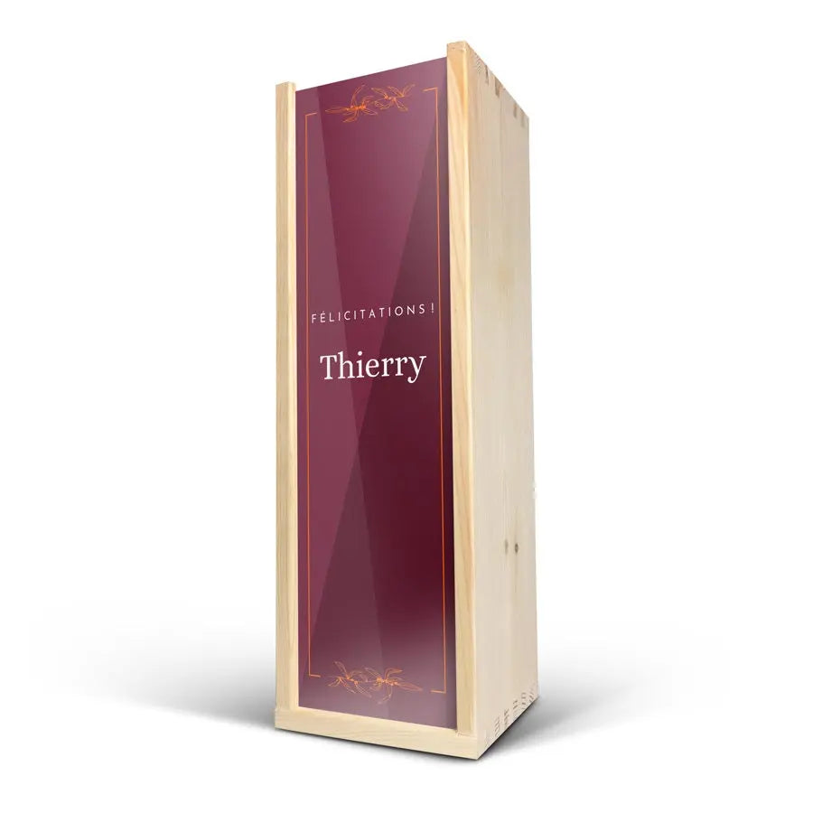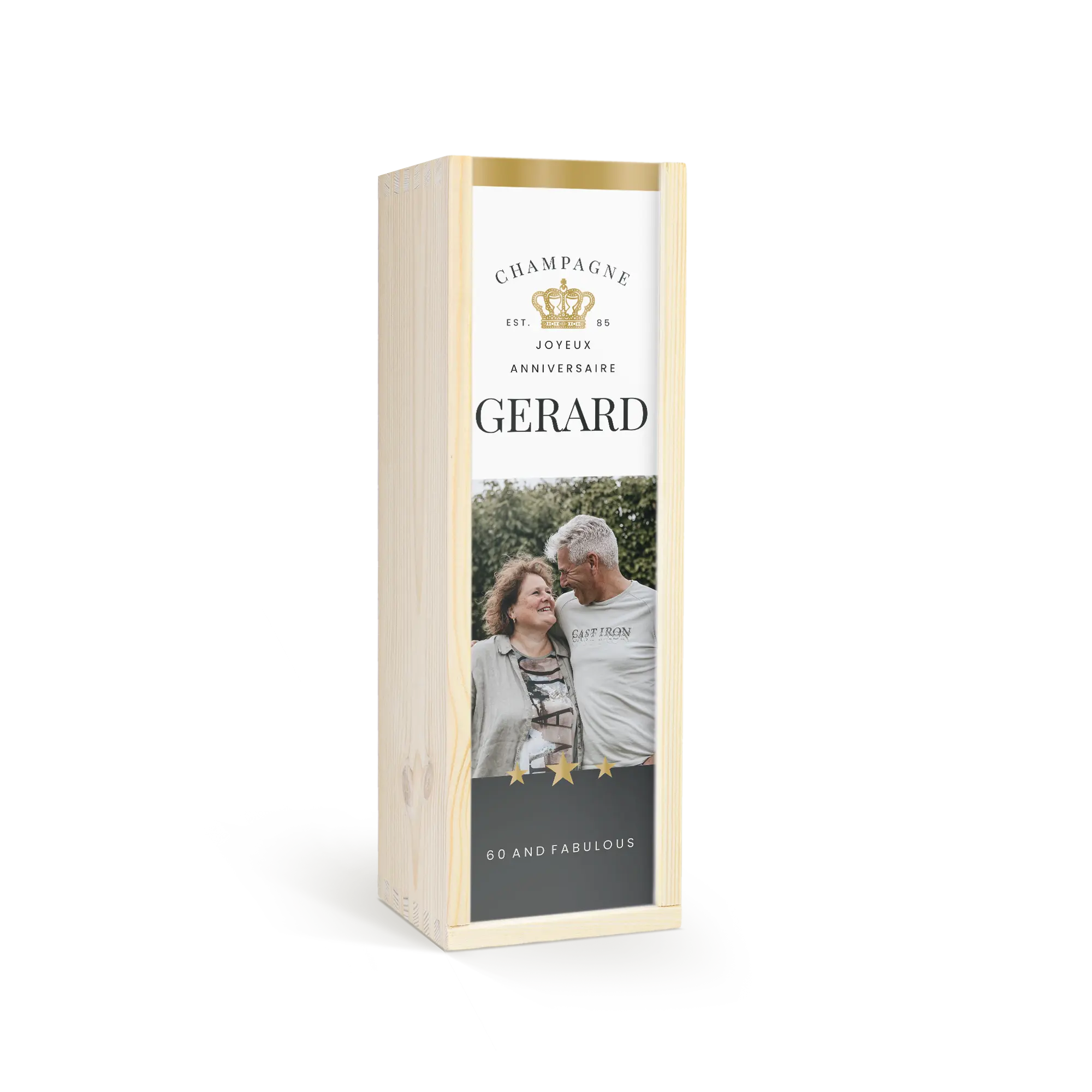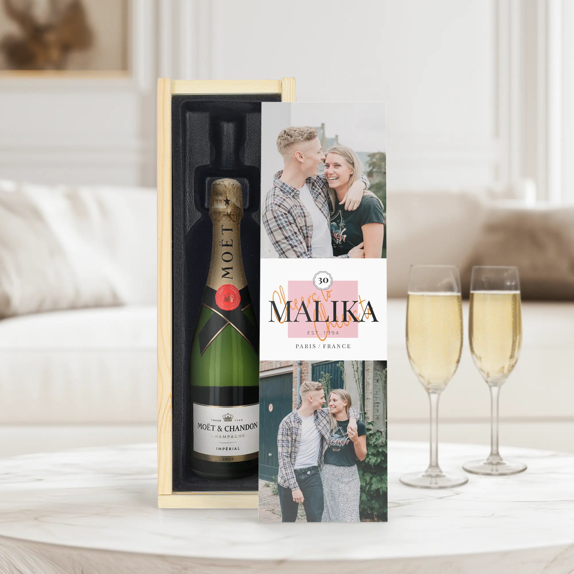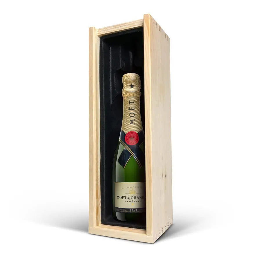 Una deliziosa bottiglia di vero champagne Moët & Chandon in una custodia in legno personalizzata con il tuo nome o testo. Varie misure di bottiglie disponibili!