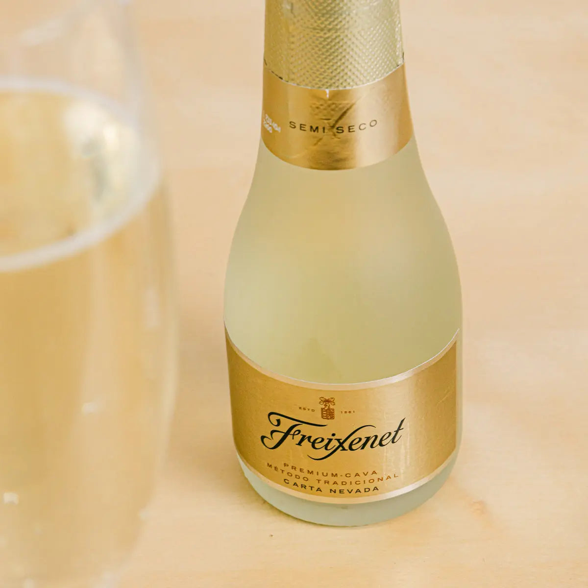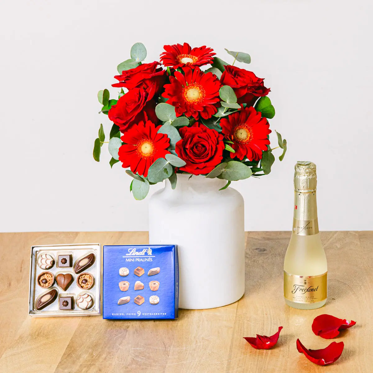 Accanto all'arrangiamento floreale c'è una bottiglia di pregiato cava Freixenet. Conosciuto per la sua qualità distintiva, questo vino frizzante offre un gusto fresco e rinfrescante, rendendolo ideale per celebrazioni sia grandi che piccole. Abbinato a un calice, fornisce momenti di gioia e festa condivisa. Aggiungendo un tocco di indulgenza, il set regalo include una selezione di Mini Praline Lindt. Questi cioccolatini gourmet, realizzati da maestri cioccolatieri, presentano una varietà di deliziosi sapori e consistenze, con ogni morso che offre un assaggio di lusso. Questo set completo è pensato con cura per portare gioia e sofisticatezza a compleanni, anniversari o qualsiasi momento speciale da celebrare. Condividi questo regalo di alta qualità con i tuoi cari e crea ricordi indimenticabili.