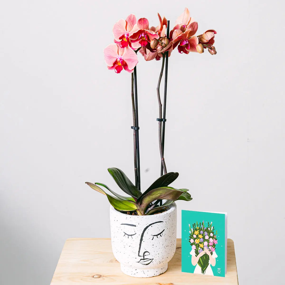 Raggi di Felicità: Orchidea, vaso di fiori e biglietto