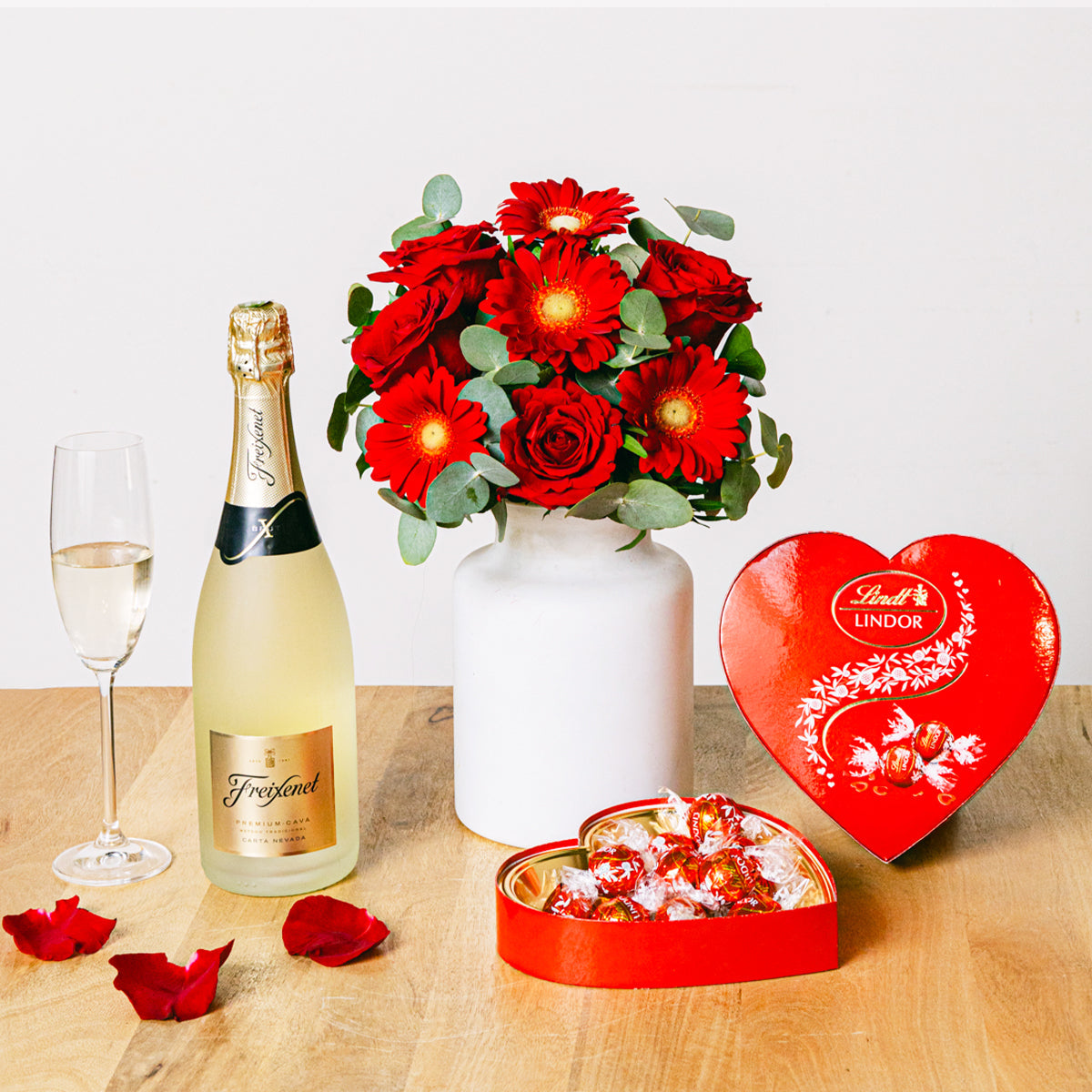 Il bouquet presenta un mix vivace di rose rosse a stelo lungo e gerbere allegre, completato da un assortimento di deliziose golosità. Questa combinazione crea un equilibrio armonioso tra eleganza ed energia vibrante, rendendolo un regalo perfetto per ogni occasione.
