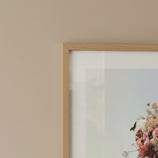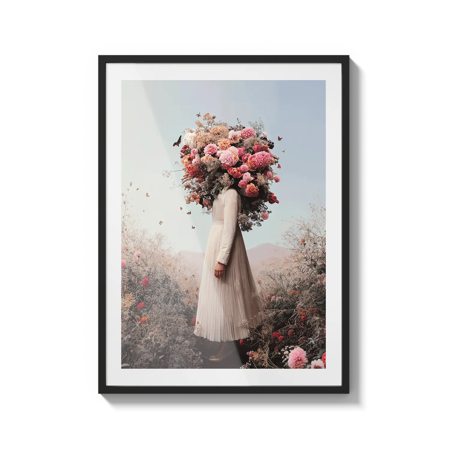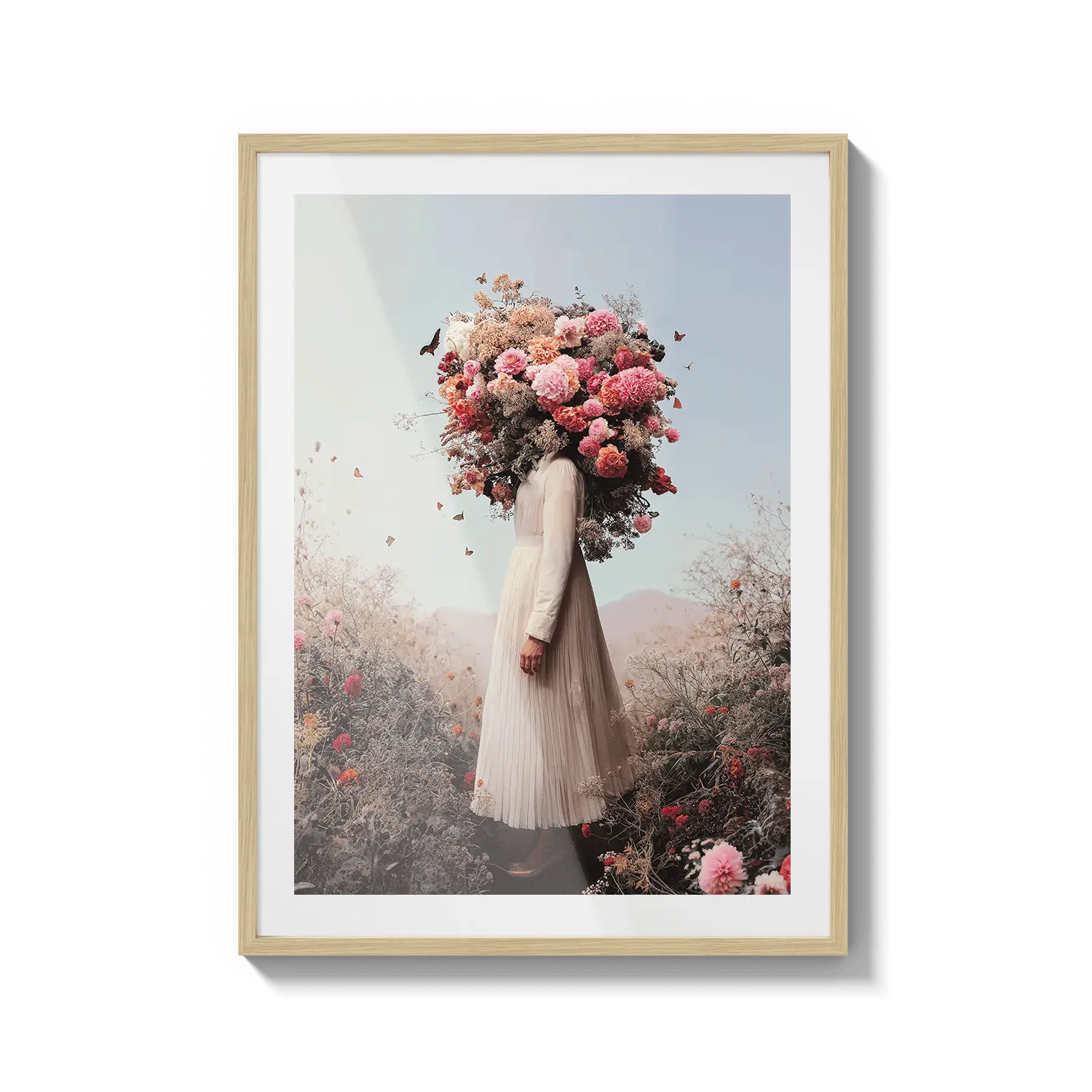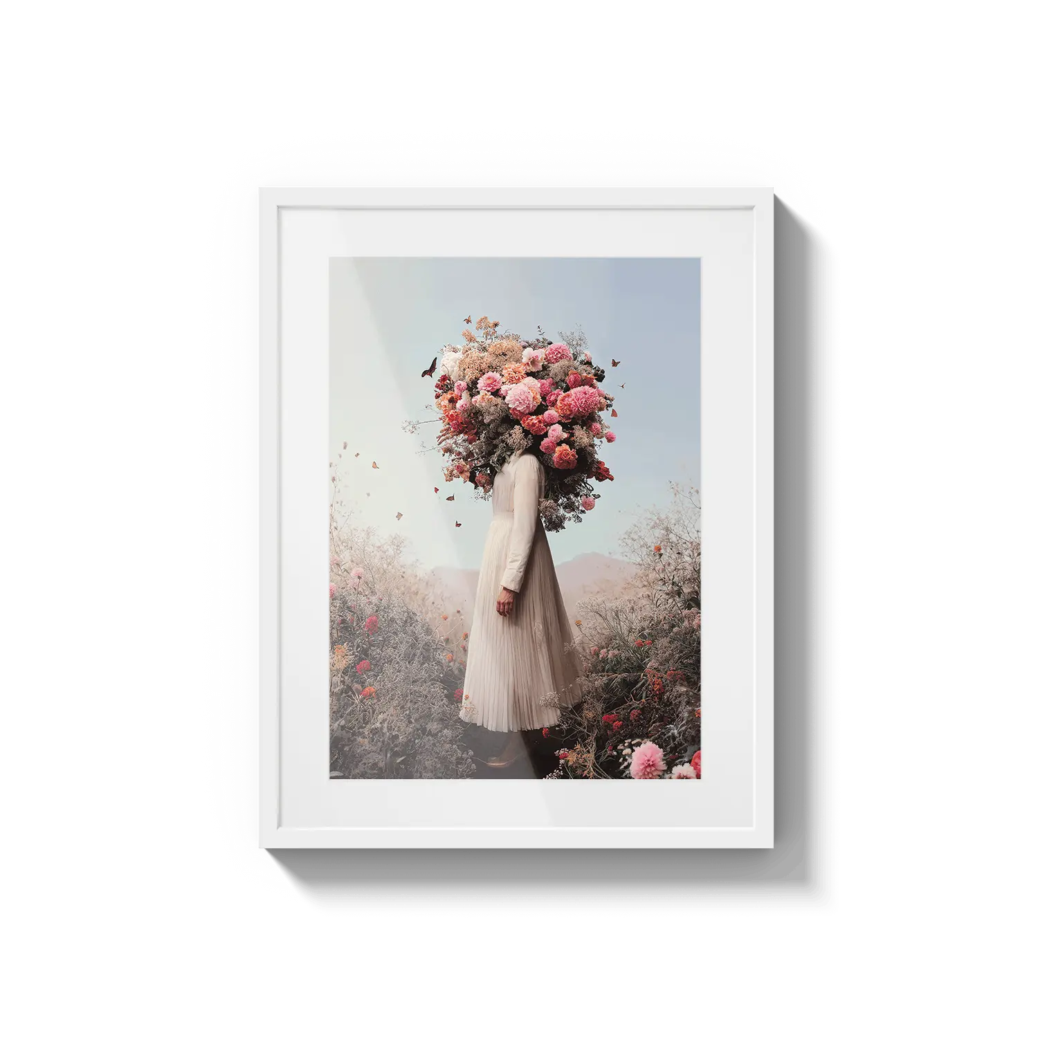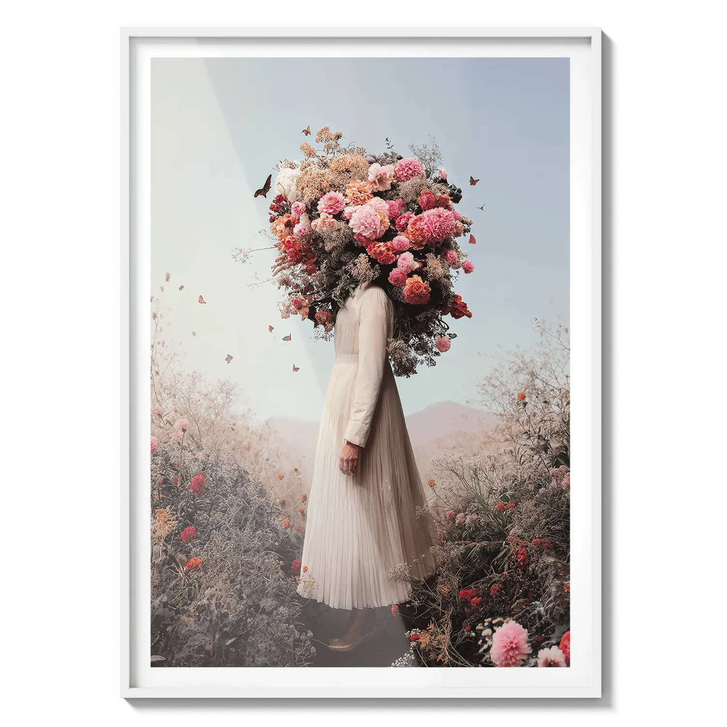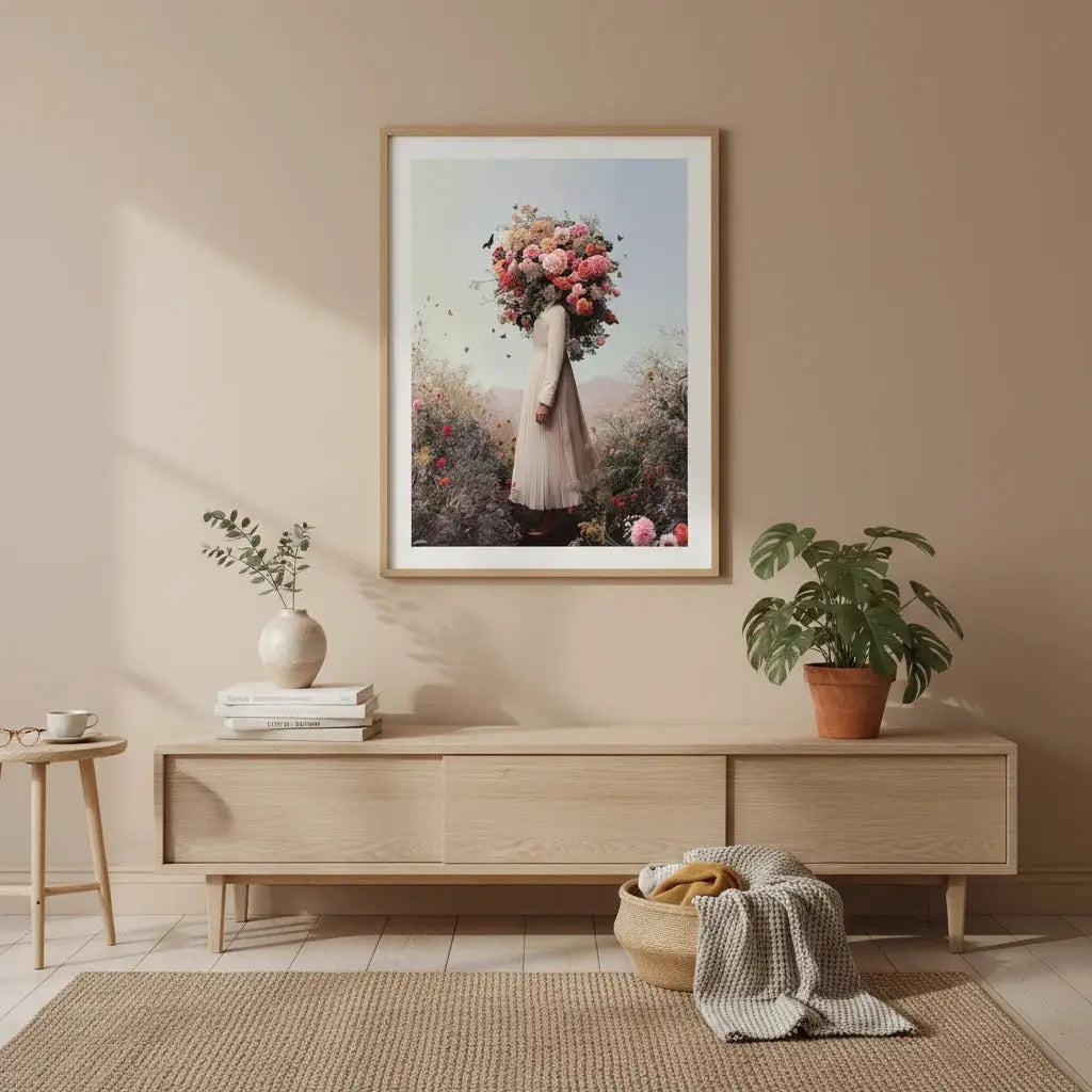 Una figura dai toni tenui coronata da fiori pastello, che irradia una delicata immaginazione. Un'opera d'arte tenera che ispira tranquillamente.