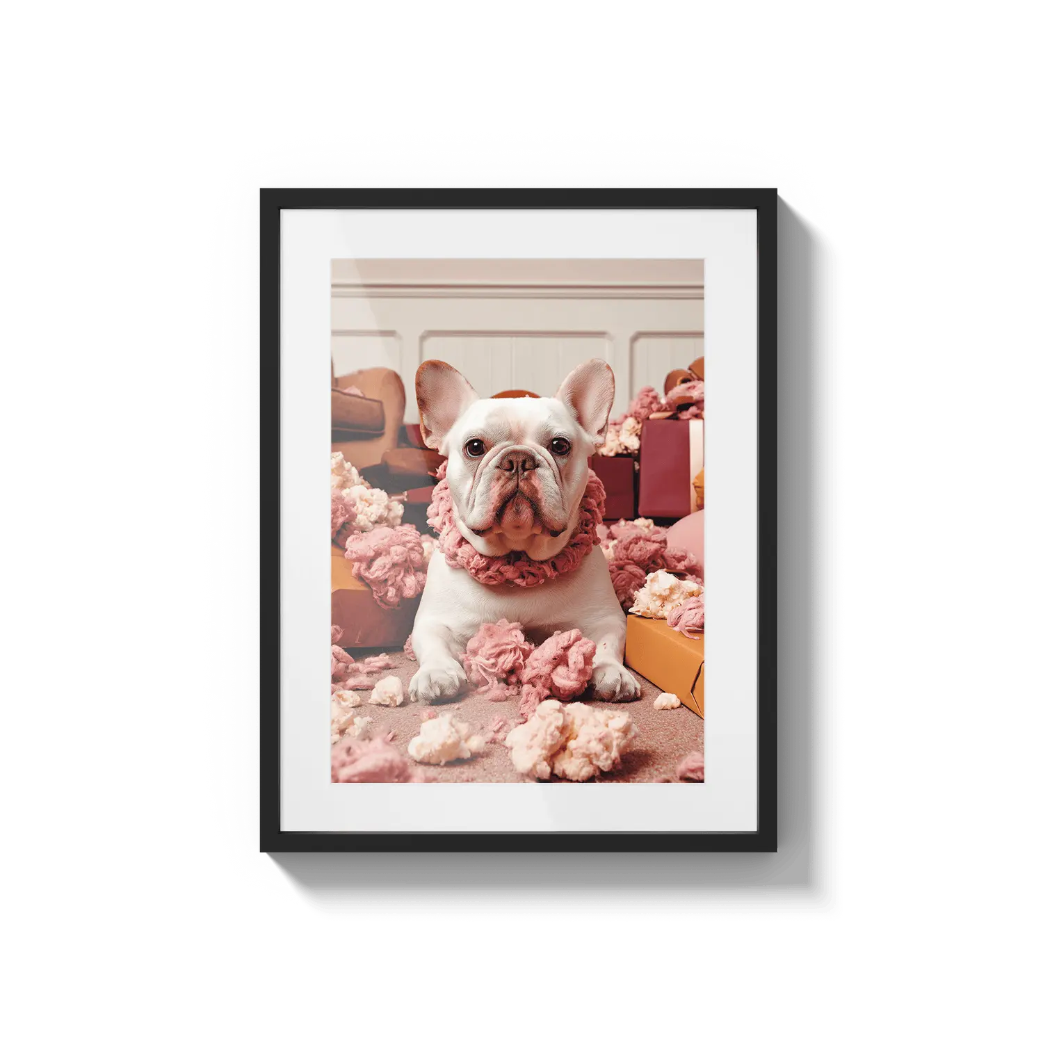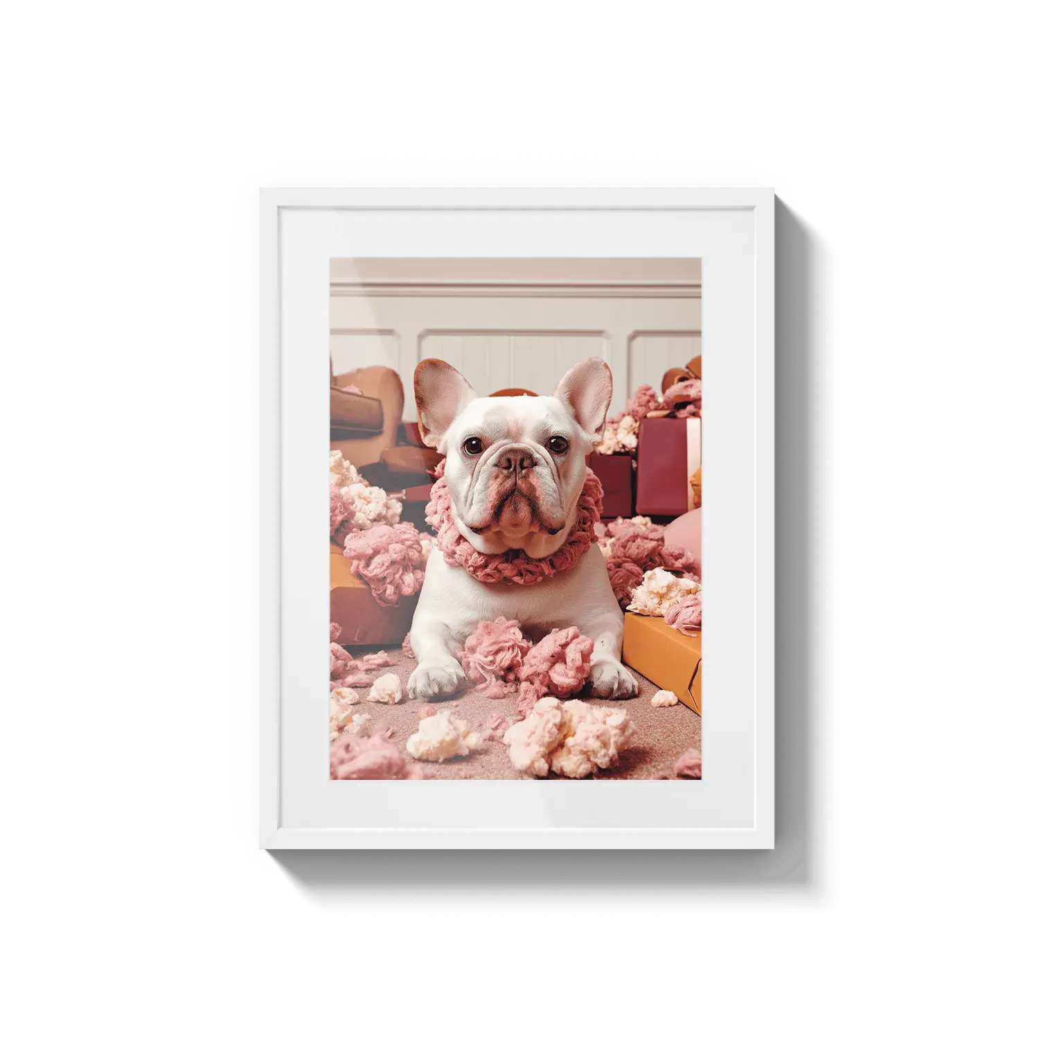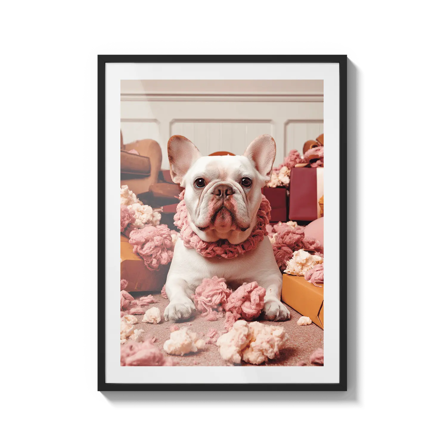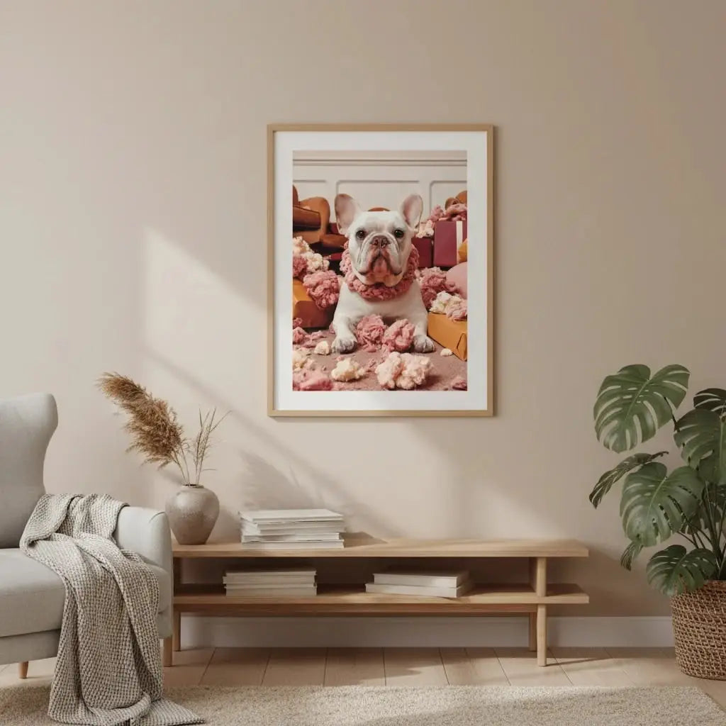 Un dolce bulldog circondato da morbidi fiori rosa, che offre tenerezza con un tocco di giocosità. Un regalo affascinante e caloroso.