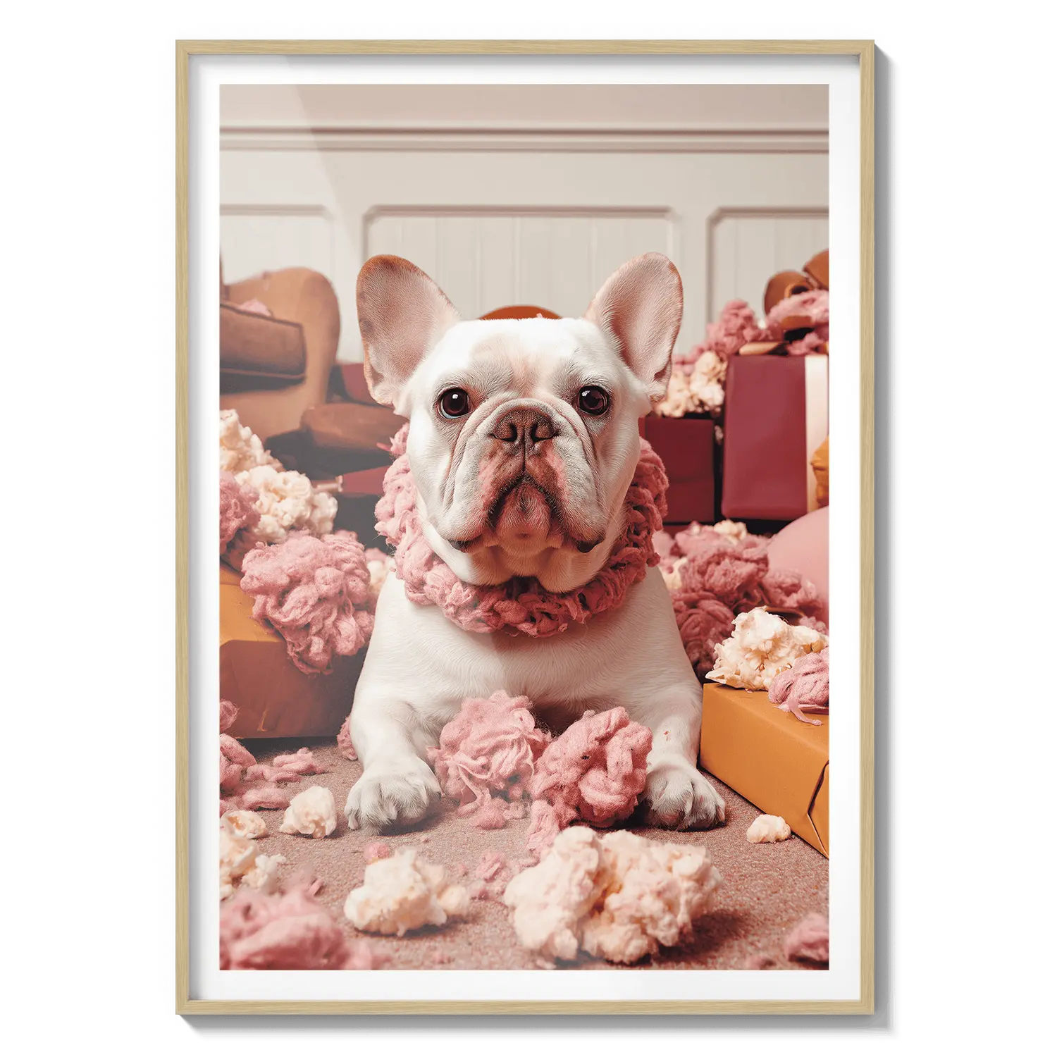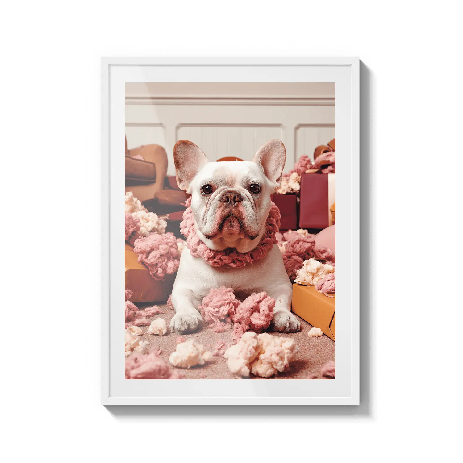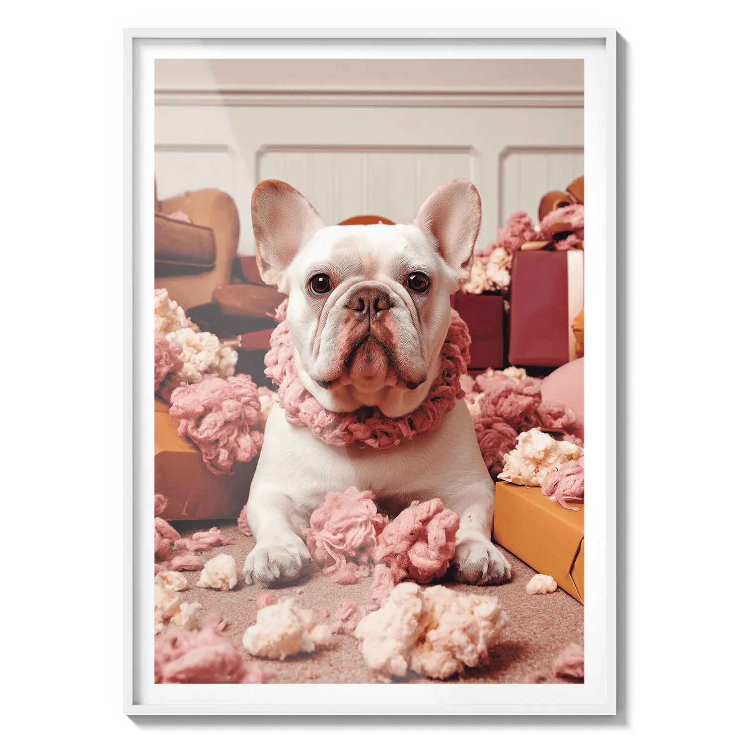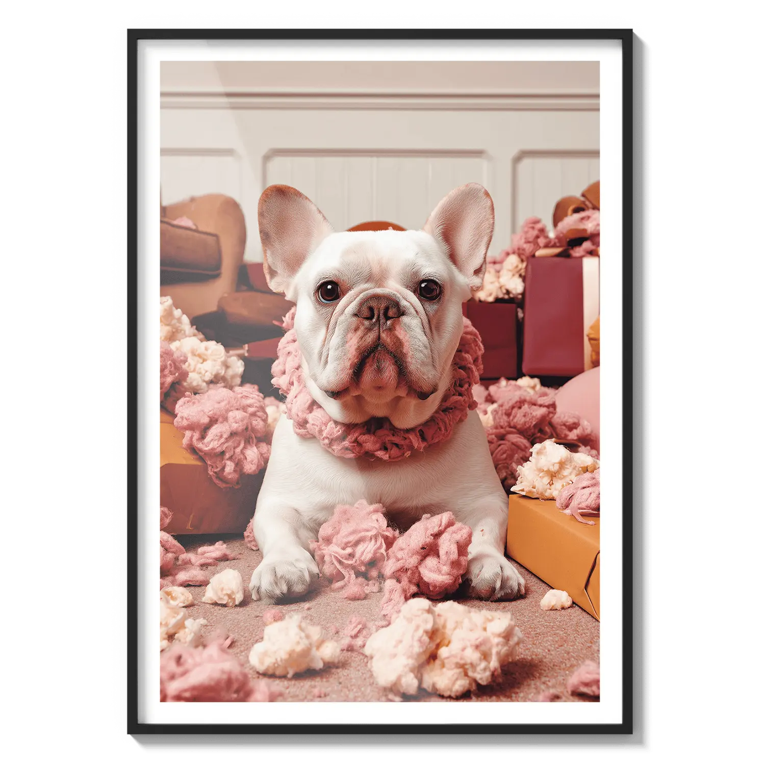 Un dolce bulldog circondato da morbidi fiori rosa, che offre tenerezza con un tocco di giocosità. Un regalo affascinante e caloroso.