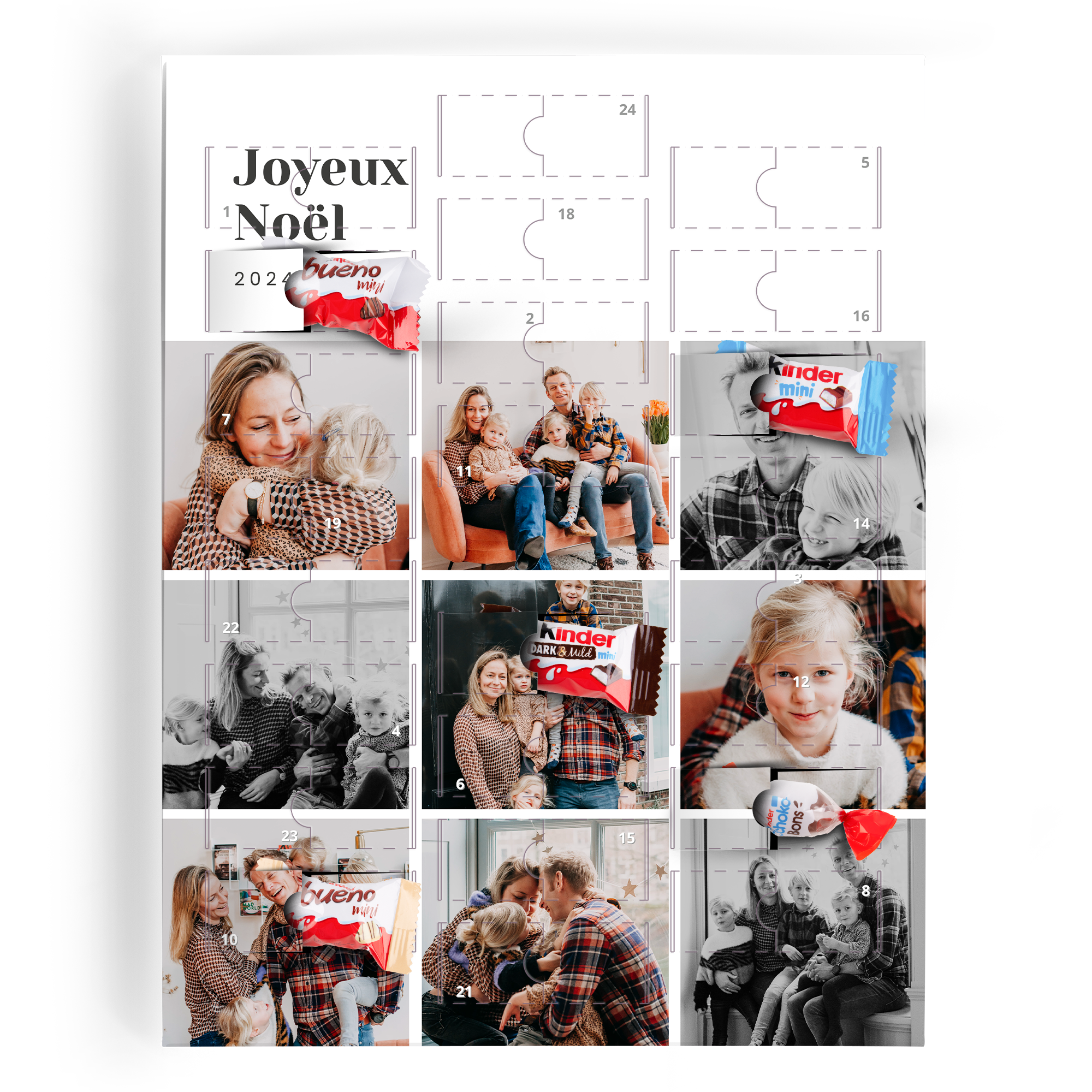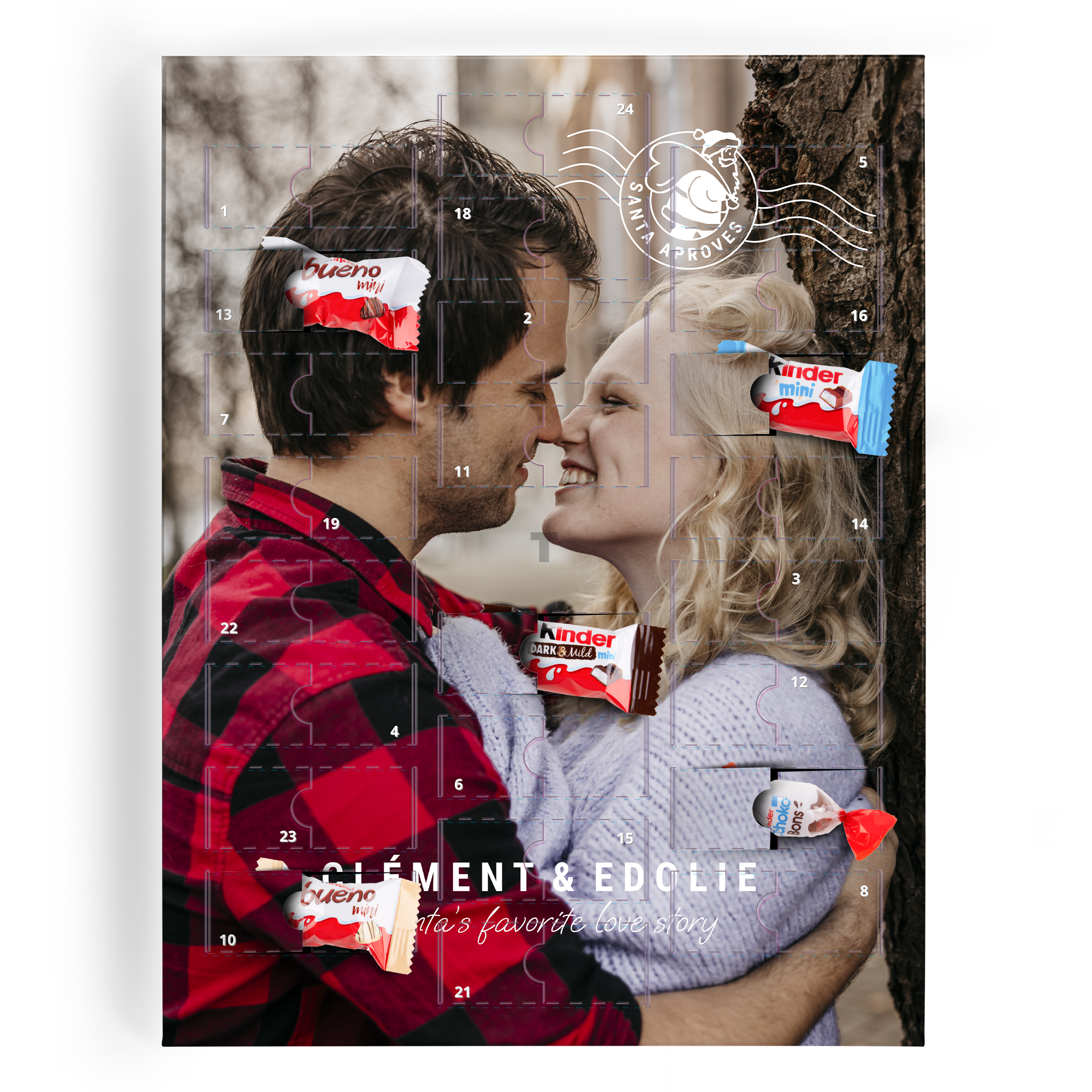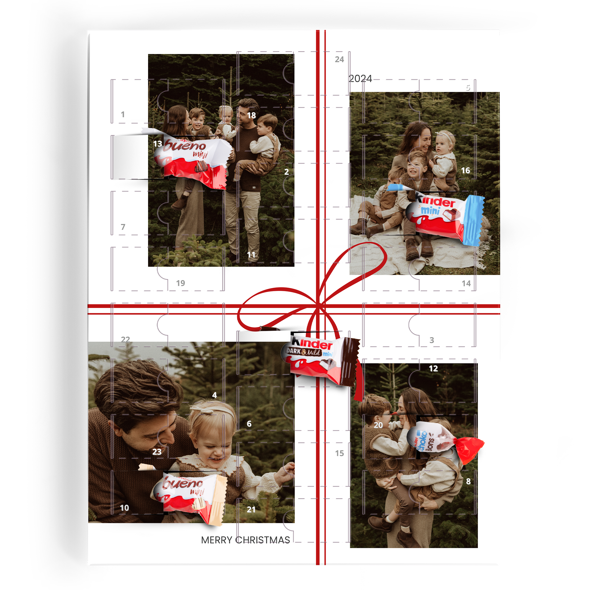 Calendario dell'avvento personalizzato con la foto, il nome e/o il testo che preferisci, con 24 deliziosi cioccolatini Kinder Happy Moments.