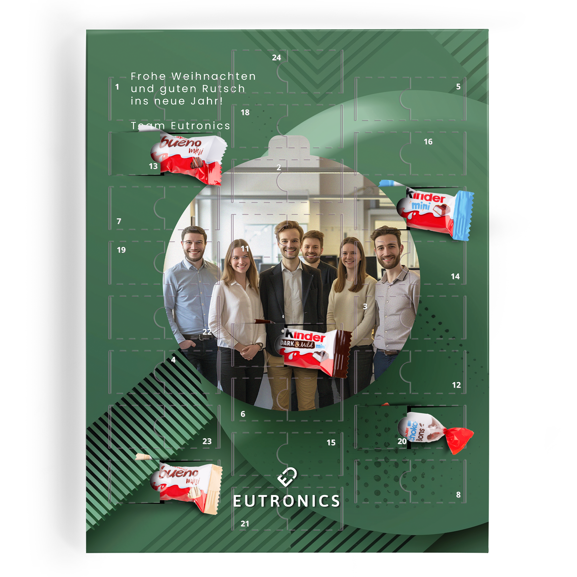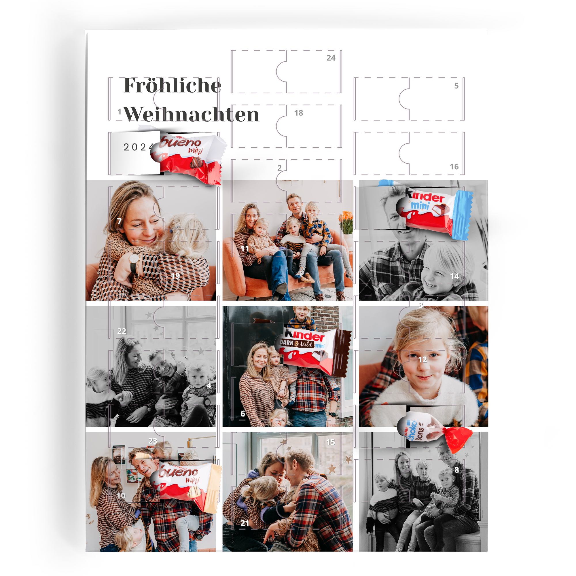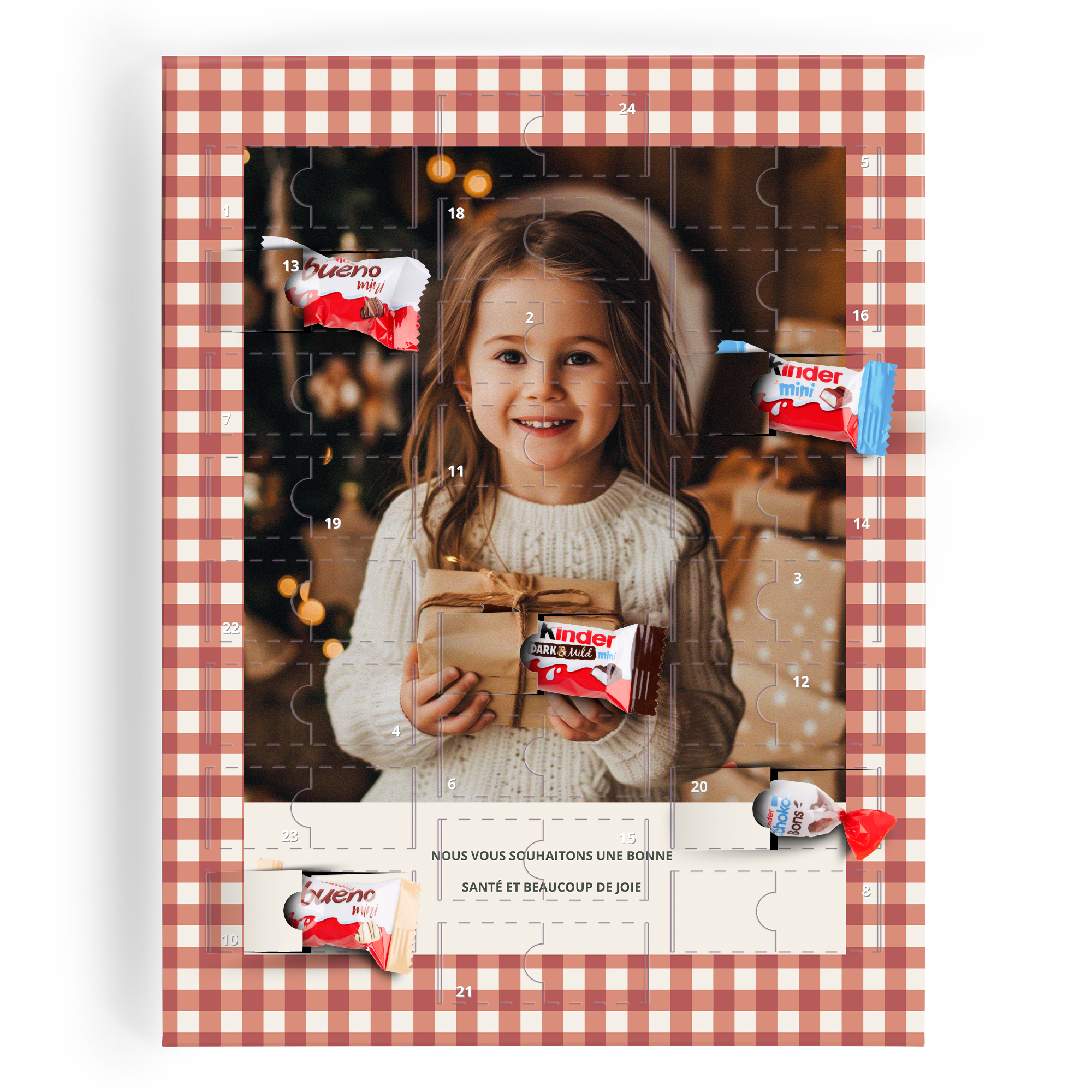 Calendario dell'avvento personalizzato con la foto, il nome e/o il testo che preferisci, con 24 deliziosi cioccolatini Kinder Happy Moments.