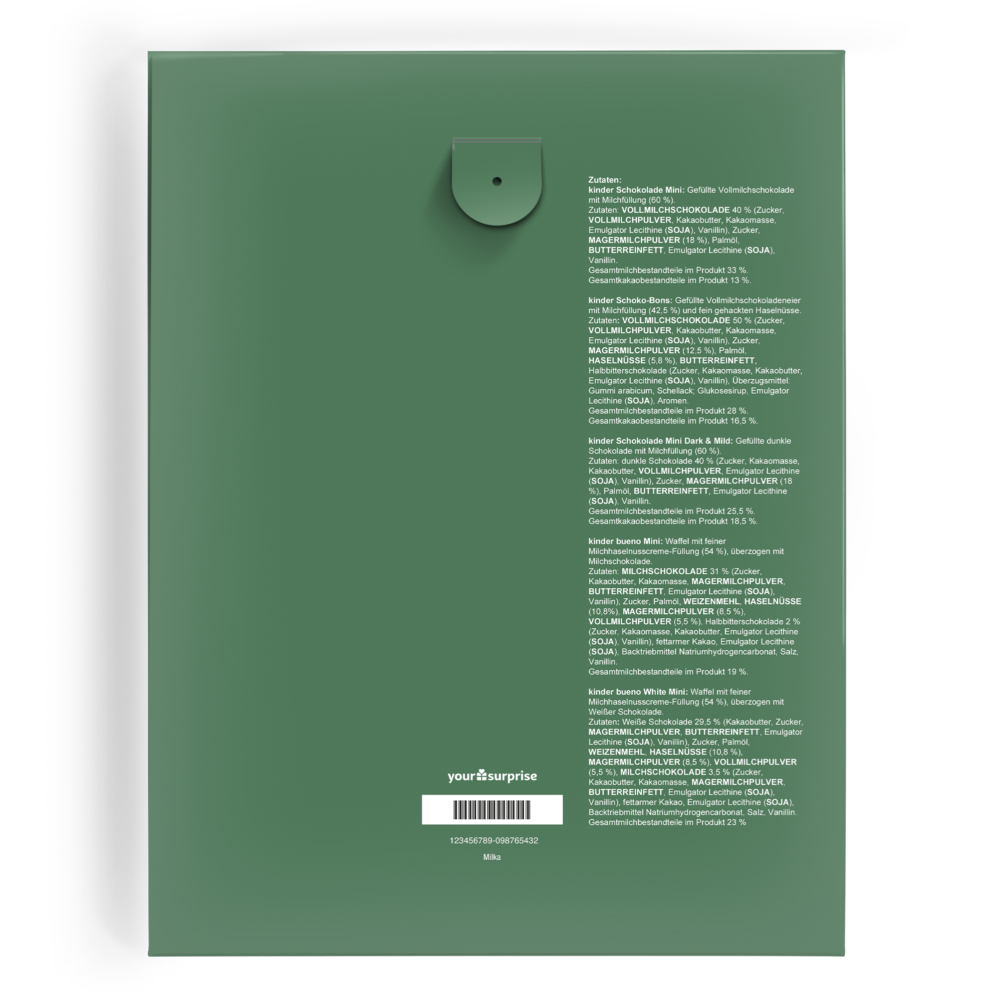 Maggiori informazioni sul calendario dell'avvento personalizzato Kinder Happy Moments:Include: 24 deliziosi cioccolatini kinderImbottitura: mini mix Kinder Happy MomentsDimensioni: 23,7 x 30,5 x 2,5 cmNumero di giorni: 24 (1 - 24 dicembre)Personalizzazione: con nome, foto e/o logoStampa: a coloriPer motivi tecnici non è possibile utilizzare caratteri cirillici, arabi, asiatici, greci o speciali.Ingredienti:Kinder Cioccolato Mini Superior cioccolato al LATTE 40% (Zucchero, LATTE in polvere, burro di cacao, pasta di cacao, emulsionanti: lecitina [ SOIA ]; vanillina), zucchero, LATTE scremato in polvere, olio di palma, BURRO CONCENTRATO , emulsionanti: lecitina [ SOIA ]; vanillina. Ingredienti prodotto intero: derivati del LATTE 33% ( LATTE scremato in polvere, LATTE in polvere 27,4%, BURRO CONCENTRATO 5,6%), cacao 13%.kinder Schoko-Bons Superior cioccolato al LATTE 50% (Zucchero, LATTE in polvere, burro di cacao, pasta di cacao, emulsionanti: lecitine [ SOIA ]; vanillina), zucchero, LATTE scremato in polvere, olio di palma, NOCCIOLE 5,8%, BURRO CONCENTRATO , fondente cioccolato (zucchero, pasta di cacao, burro di cacao, emulsionanti: lecitina [ SOIA ]; aromi), agenti di rivestimento (gomma arabica, gommalacca), sciroppo di glucosio, emulsionanti: lecitina [ SOIA ]; aromi, Ingredienti prodotto intero: derivati del LATTE 28% ( LATTE scremato in polvere, LATTE in polvere 24,3%, BURRO CONCENTRATO 3,7%), cacao 16,5%.Kinder Cioccolato ai Cereali Mini Superior LATTE 37,5% (Zucchero, burro di cacao, LATTE in polvere, pasta di cacao, emulsionanti: lecitina [ SOIA ]; vanillina), zucchero, LATTE scremato in polvere, olio di palma, BURRO CONCENTRATO , ORZO , riso, FRUMENTO , FRUMENTO (farro), emulsionanti: lecitina [ SOIA ]; GRANO SARACENO , vanillina, Ingredienti prodotto intero: LATTE derivati 30,5% ( LATTE scremato in polvere, LATTE in polvere 25,4%, BURRO CONCENTRATO 5,1%), grani 6%.kinder Bueno Mini cioccolato al LATTE 31% (Zucchero, burro di cacao, pasta di cacao, LATTE scremato in polvere, CONCENTRATO DI BURRO , lecitine [ SOIA ]; vanillina), zucchero, olio di palma, FARINA DI FRUMENTO , NOCCIOLE 10,8%, LATTE scremato in polvere, in polvere LATTE , cioccolato fondente (zucchero, pasta di cacao, burro di cacao, emulsionanti: lecitina [ SOIA ]; vanillina), cacao magro, emulsionanti: lecitina [ SOIA ], agenti lievitanti (carbonato acido di sodio, carbonato ammonico), sale, vanillina. Ingredienti prodotto completo: prodotti a base di LATTE 19% ( LATTE scremato in polvere, LATTE in polvere: 18%, BURRO CONCENTRATO 1%).kinder Bueno White Mini Cioccolato bianco 29,5% (Burro di cacao, zucchero, LATTE scremato in polvere, CONCENTRATO DI BURRO , emulsionanti: lecitina [ SOIA ]; vanillina), zucchero, olio di palma, FARINA DI FRUMENTO , NOCCIOLE 10,8%, LATTE scremato in polvere , LATTE in polvere , cioccolato al LATTE (Zucchero, burro di cacao, pasta di cacao, LATTE scremato in polvere , BURRO CONCENTRATO , emulsionanti: lecitina [ SOIA ]; vanillina), cacao magro, emulsionanti: lecitina [ SOIA ], agenti lievitanti (carbonato acido di sodio, ammonio carbonato), sale, vanillina. Ingredienti prodotto intero: prodotti a base di LATTE 23% (( LATTE scremato in polvere, LATTE in polvere 22%, BURRO CONCENTRATO 1%).