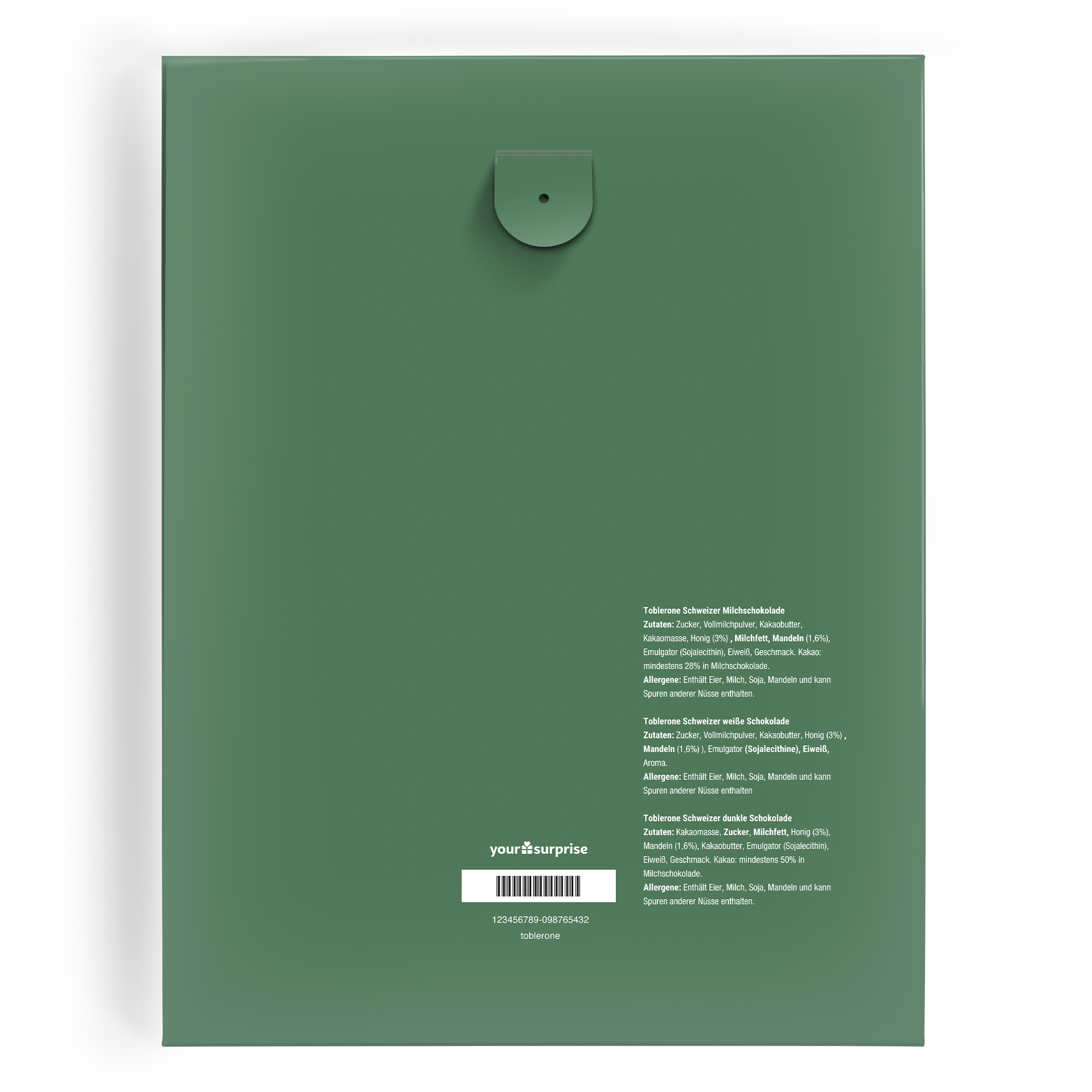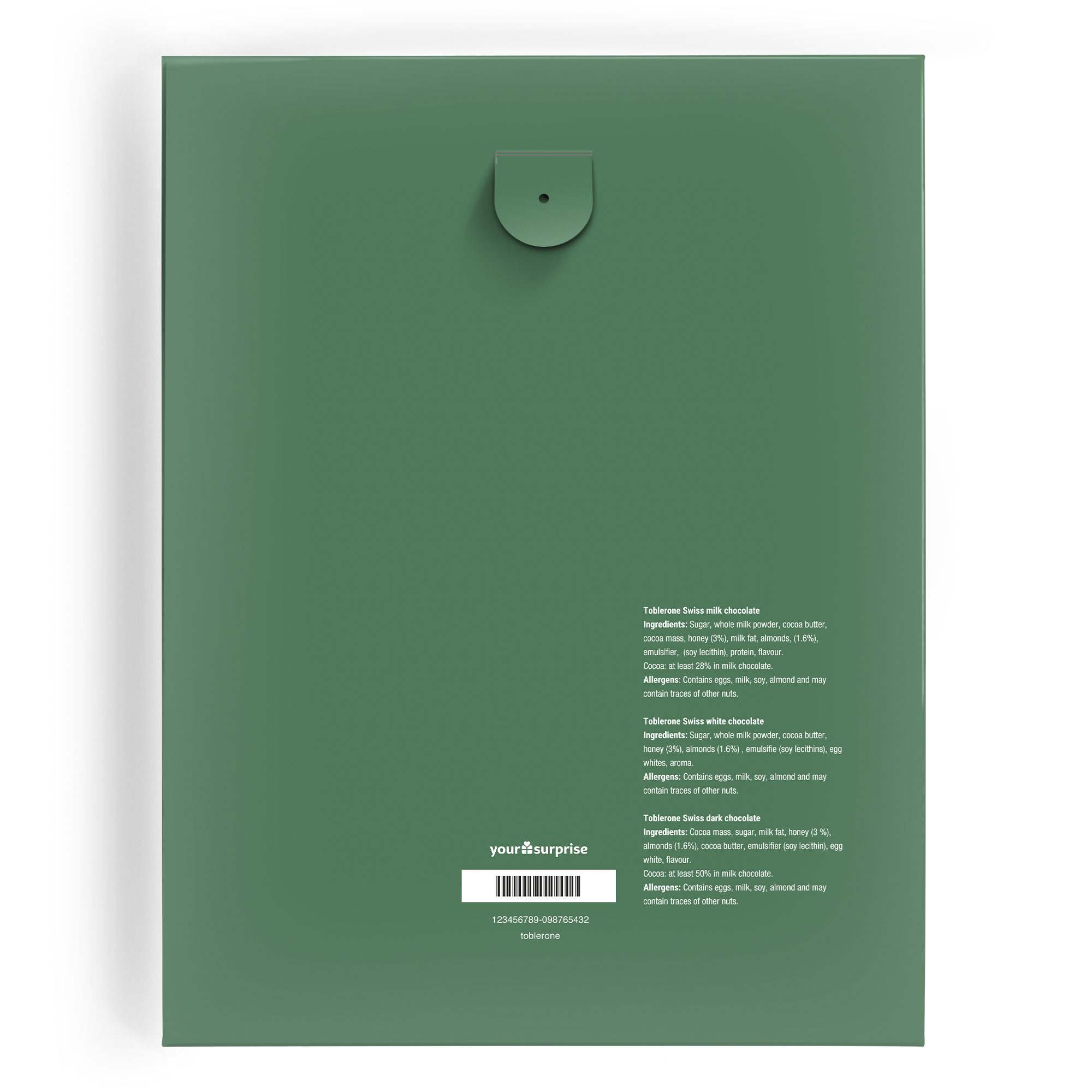 Ulteriori informazioni sul Calendario dell'Avvento Toblerone: Include: 24 deliziosi cioccolatini Toblerone al latte, puro e bianco Ripieno: latte alpino, fragola, nocciola, crema di cacao Dimensioni: 23,7 x 30,5 x 2,5 cm Numero di giorni: 24 (dal 1 al 24 dicembre) Personalizzazione: con nome, foto e/o logo Stampa: a colori Toblerone al cioccolato al latte svizzero Ingredienti: Zucchero, latte intero in polvere, burro di cacao, massa di cacao, miele (3%), grasso del latte, mandorle (1,6%), emulsionante (lecitina di soia), proteine, aromi. Cacao: almeno 28% nel cioccolato al latte. Allergeni: Contiene uova, latte, soia, mandorle e può contenere tracce di altre noci. Toblerone al cioccolato bianco svizzero Ingredienti: Zucchero, latte intero in polvere, burro di cacao, miele (3%), mandorle (1,6%), emulsionante (lecitina di soia), albumi, aromi. Allergeni: Contiene uova, latte, soia, mandorle e può contenere tracce di altre noci. Toblerone al cioccolato fondente svizzero Ingredienti: Pasta di cacao, zucchero, grasso del latte, miele (3%), mandorle (1,6%), burro di cacao, emulsionante (lecitina di soia), albumi, aromi. Cacao: almeno 50% nel cioccolato al latte. Allergeni: Contiene uova, latte, soia, mandorle e può contenere tracce di altre noci. Sfortunatamente, per motivi tecnici, non è possibile elaborare caratteri cirillici, arabi, asiatici, greci o caratteri speciali.