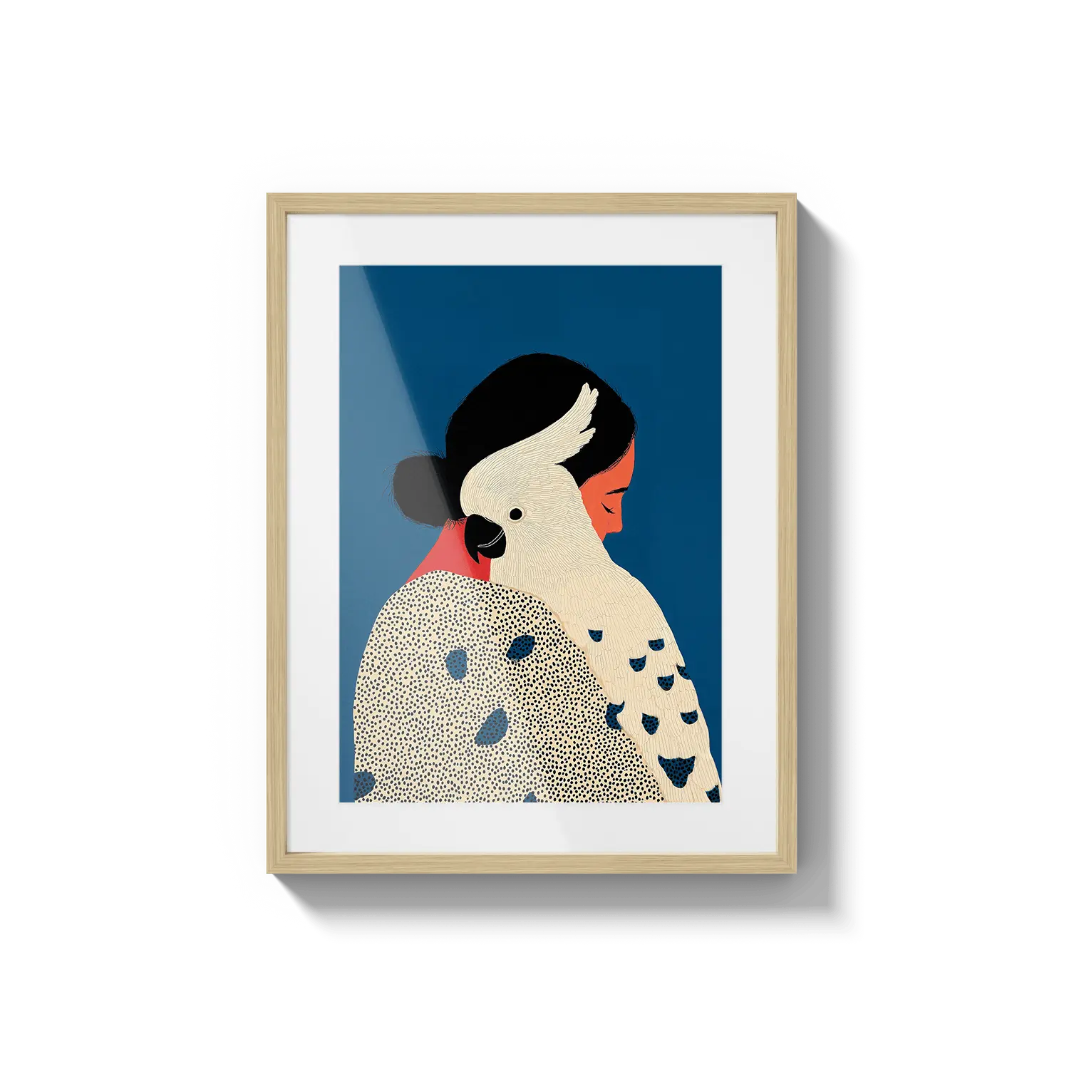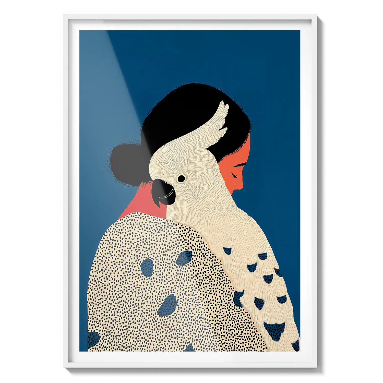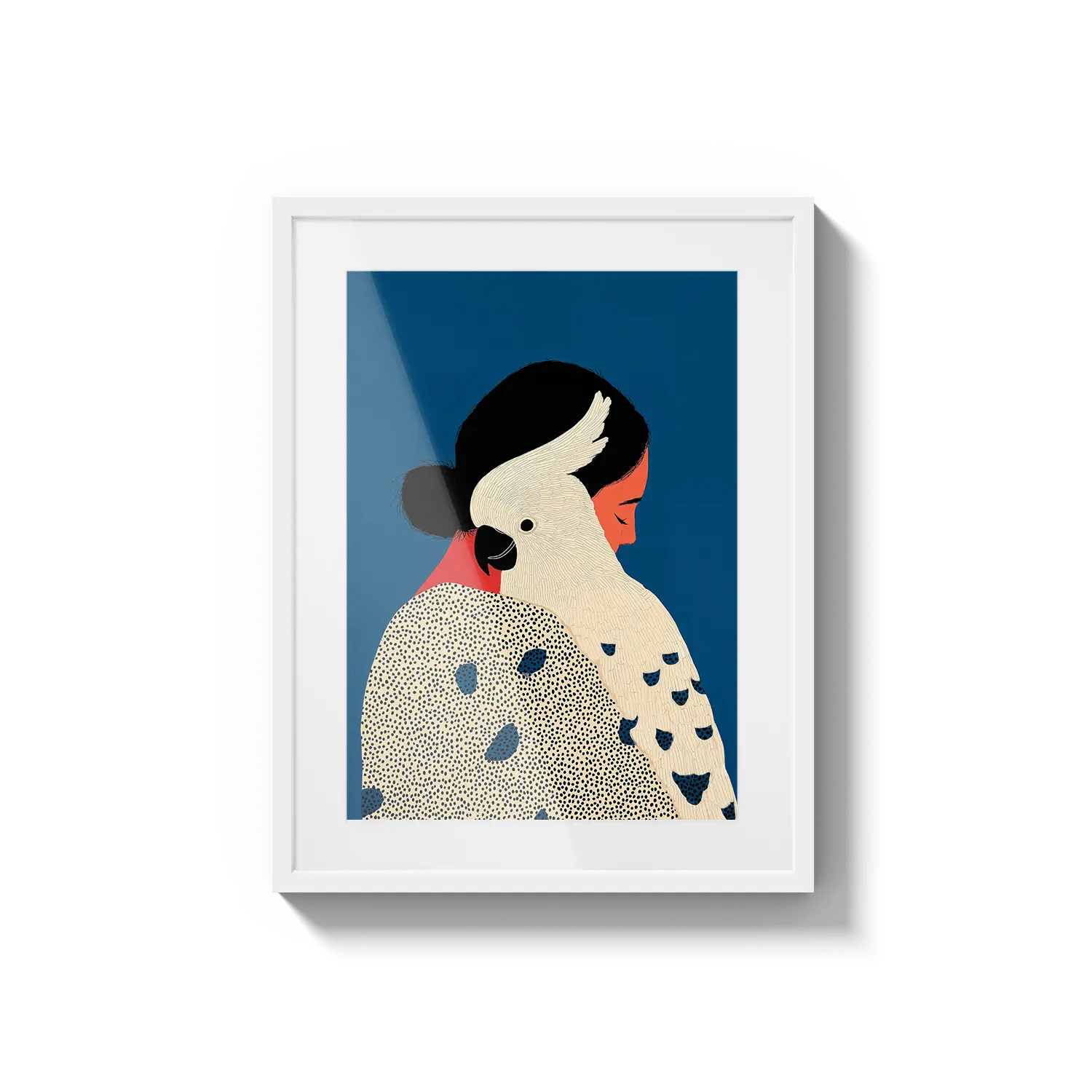 Un'illustrazione delicata di un cacatua bianco su tenui toni blu, che irradia un fascino calmo. Un regalo delizioso e affettuoso.