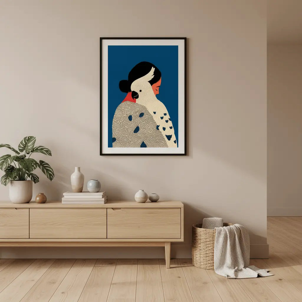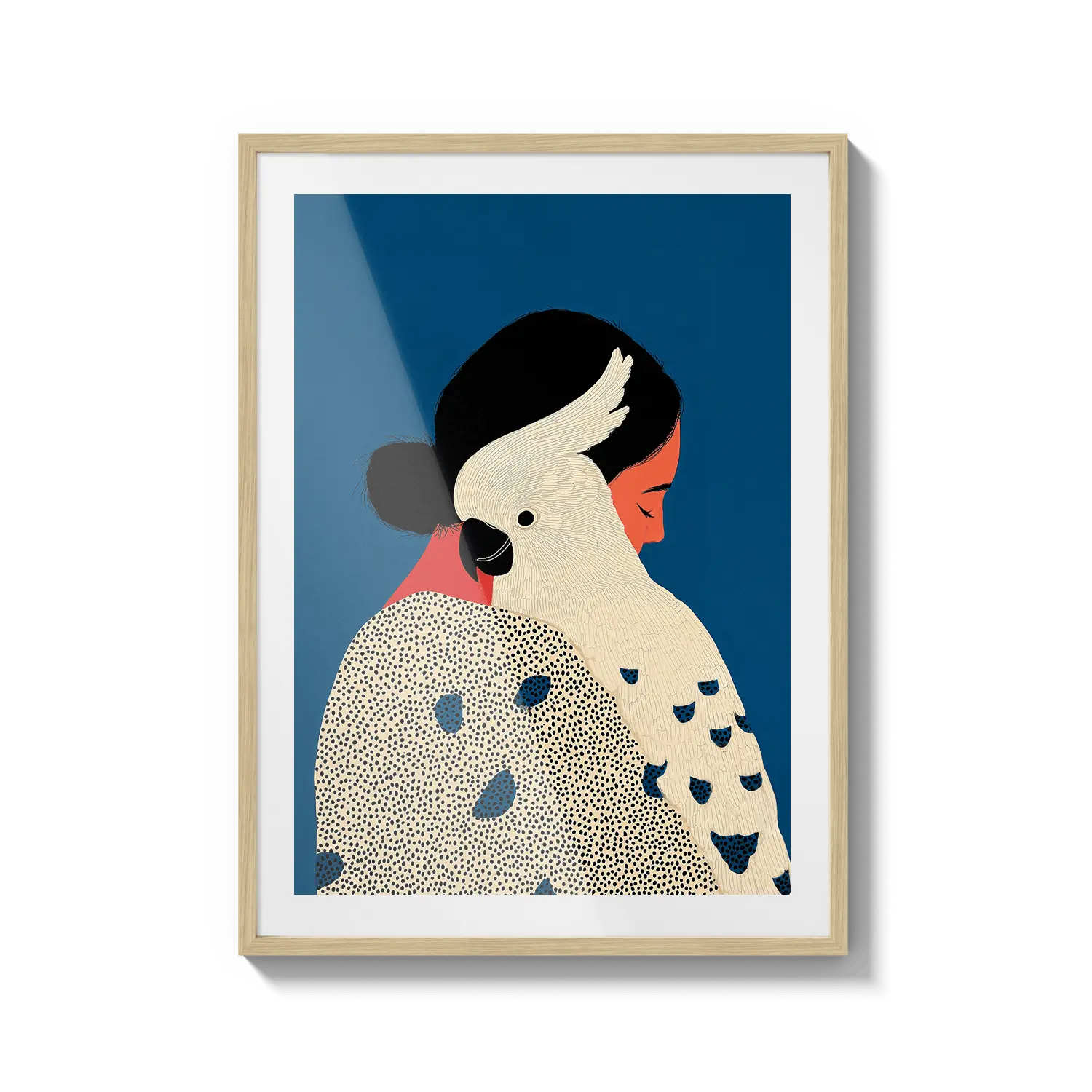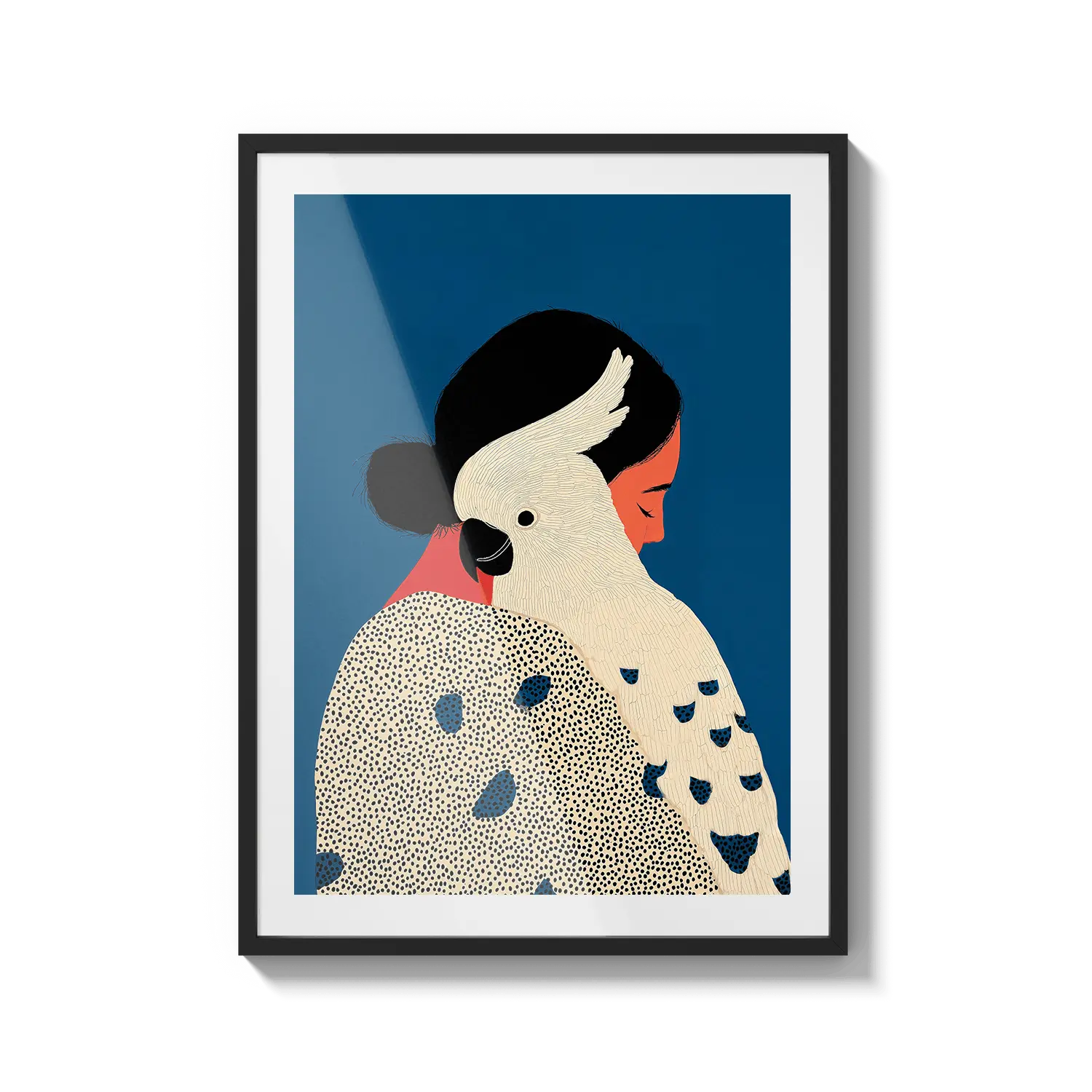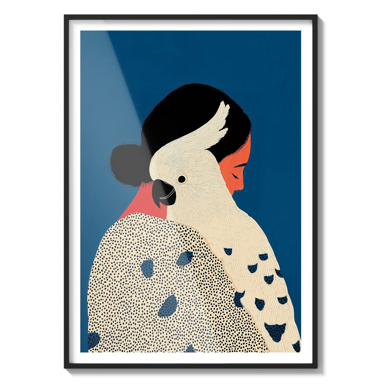 Un'illustrazione delicata di un cacatua bianco su tenui toni blu, che irradia un fascino calmo. Un regalo delizioso e affettuoso.