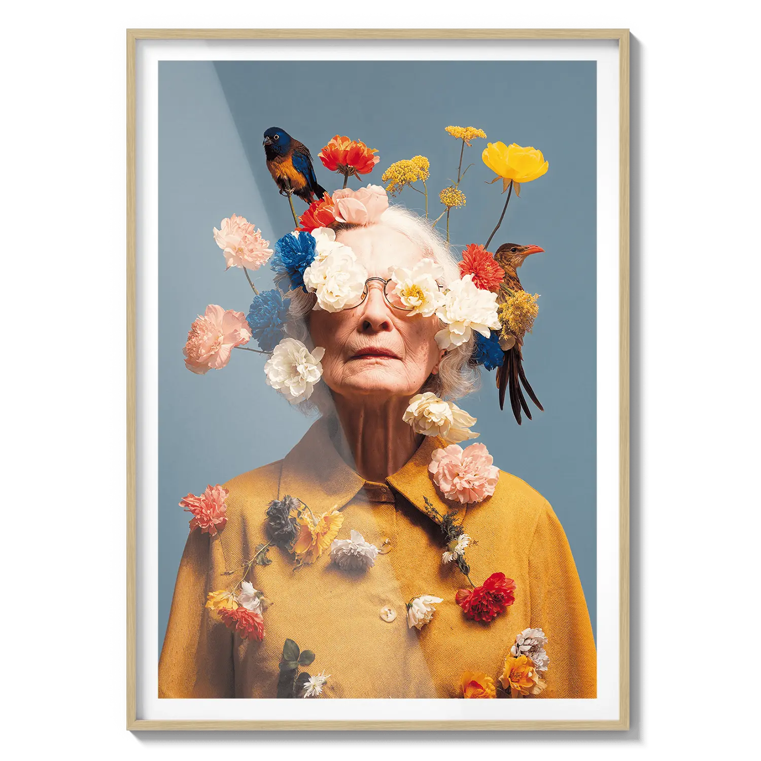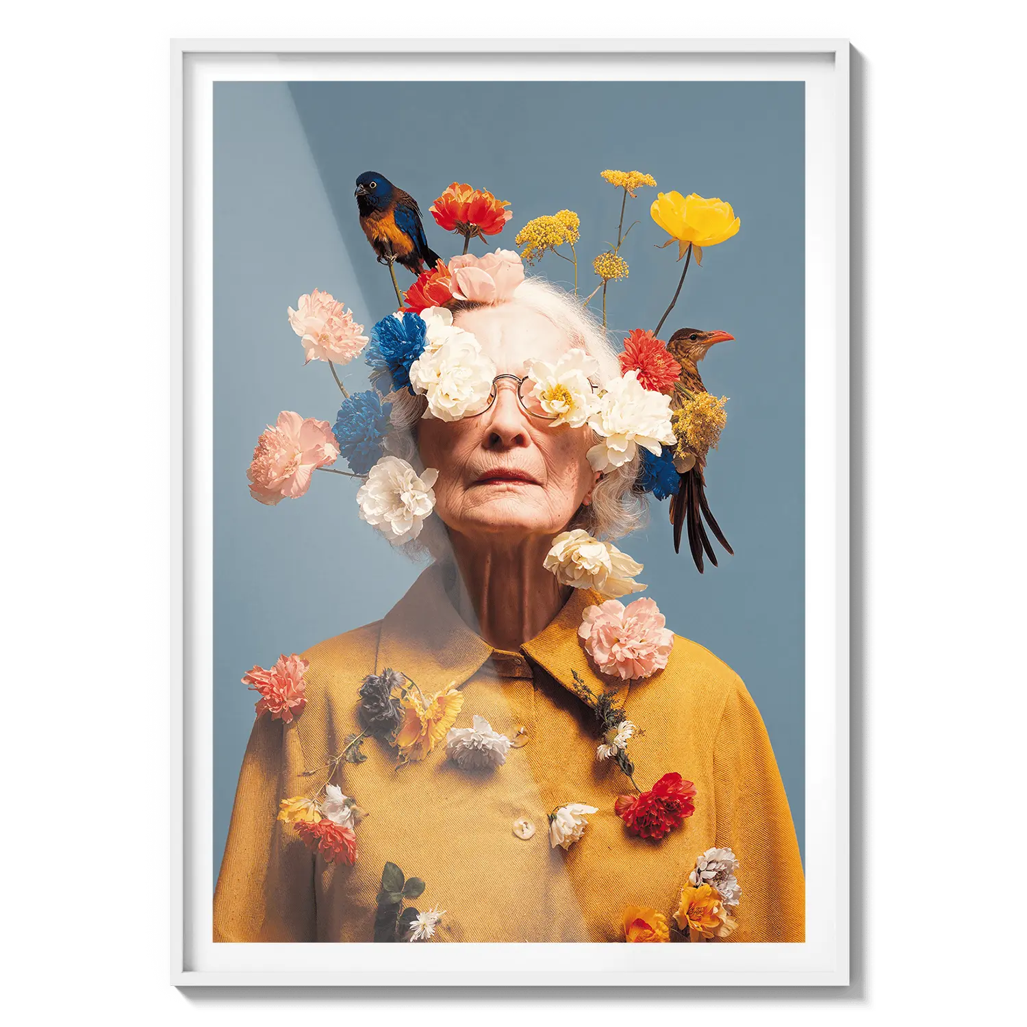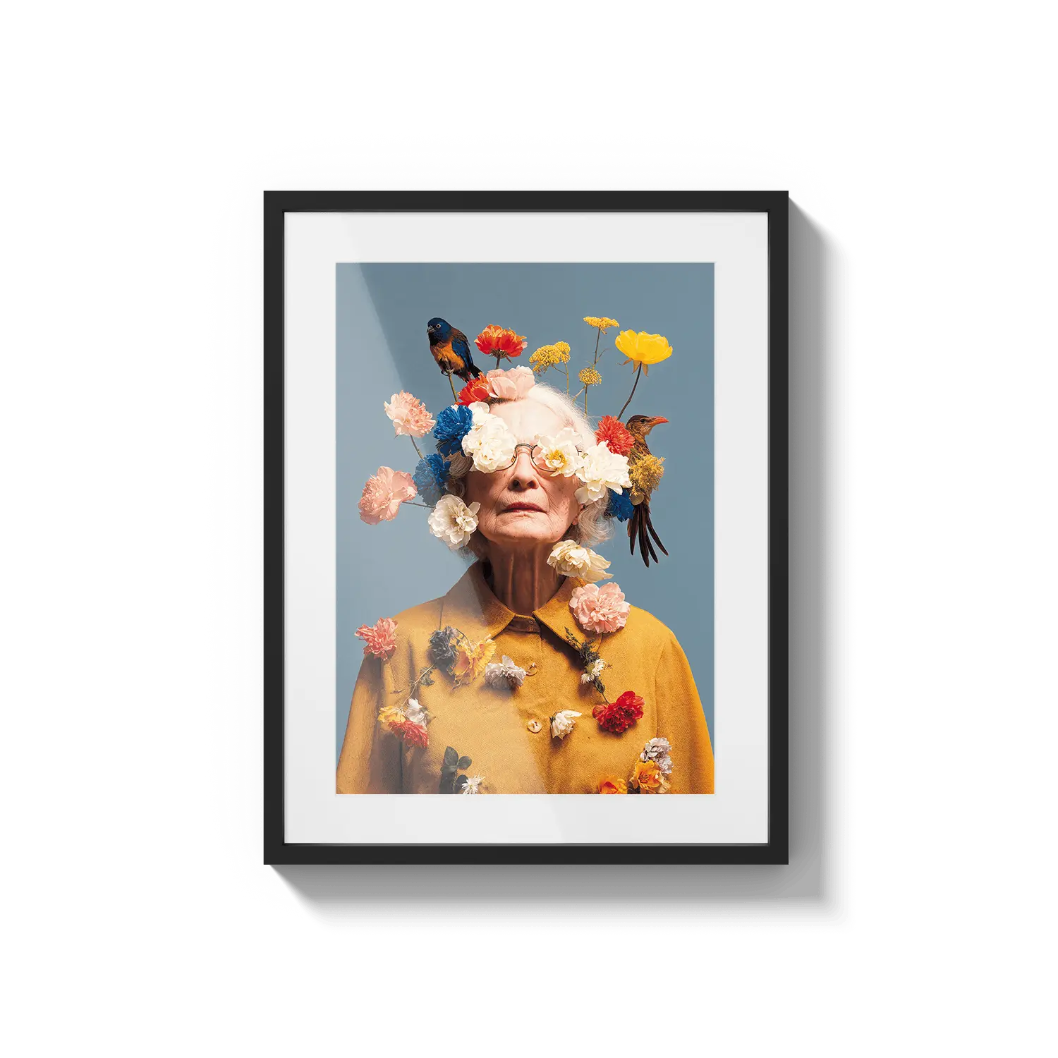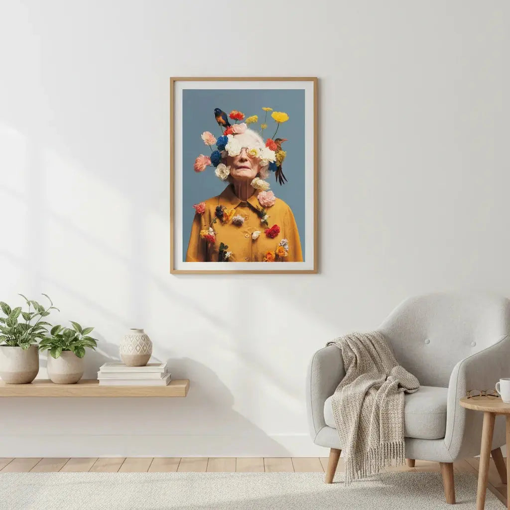 Un ritratto di una donna anziana adornata con fiori in fiore, che celebra la bellezza, la saggezza e la grazia. Un gesto premuroso ed edificante.