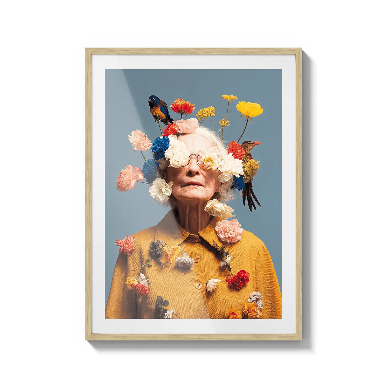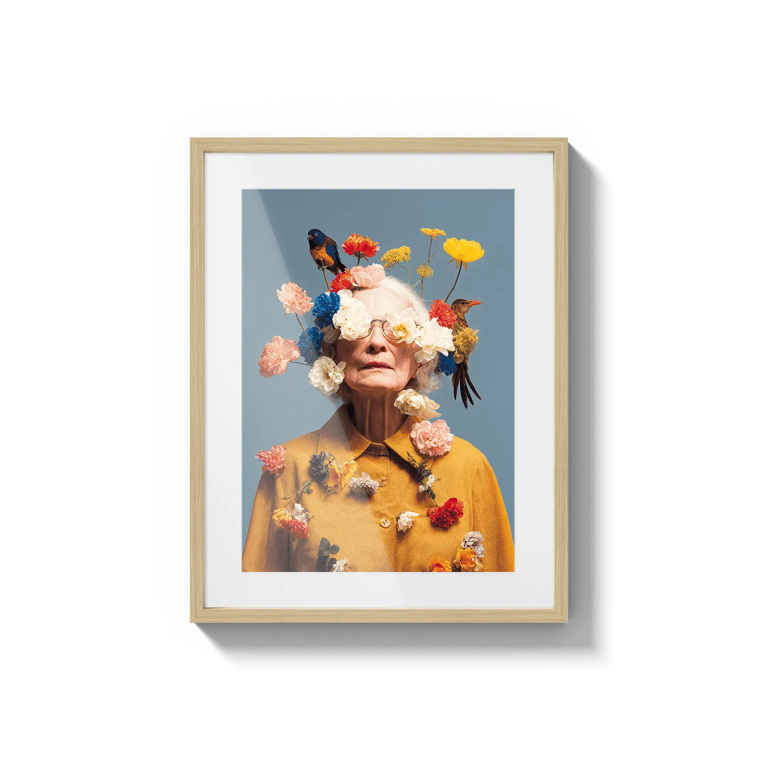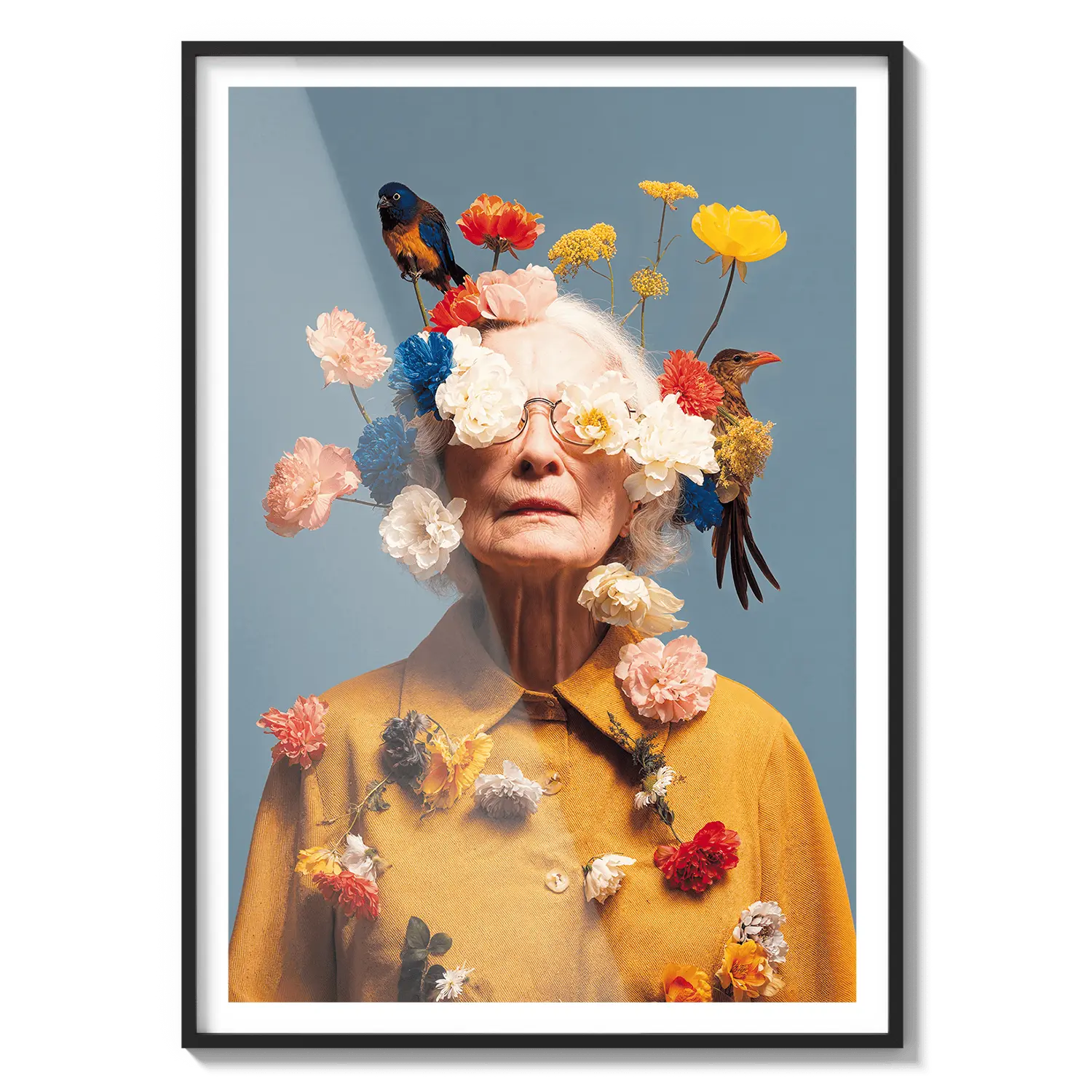 Un ritratto di una donna anziana adornata con fiori in fiore, che celebra la bellezza, la saggezza e la grazia. Un gesto premuroso ed edificante.