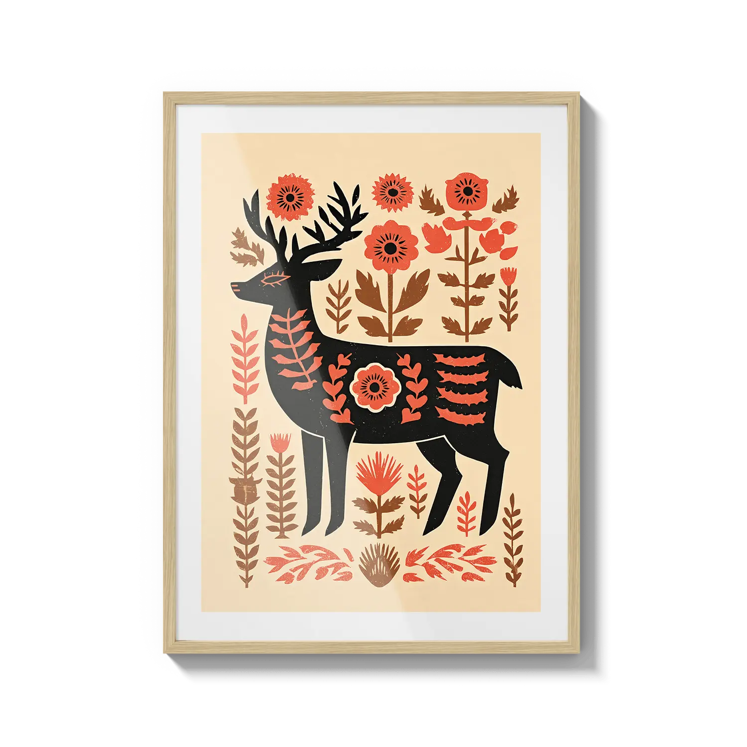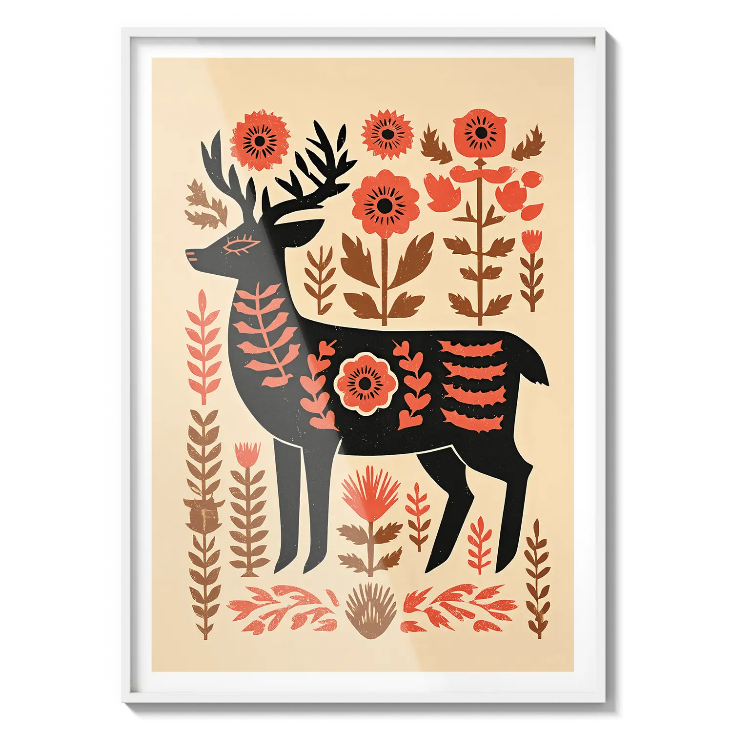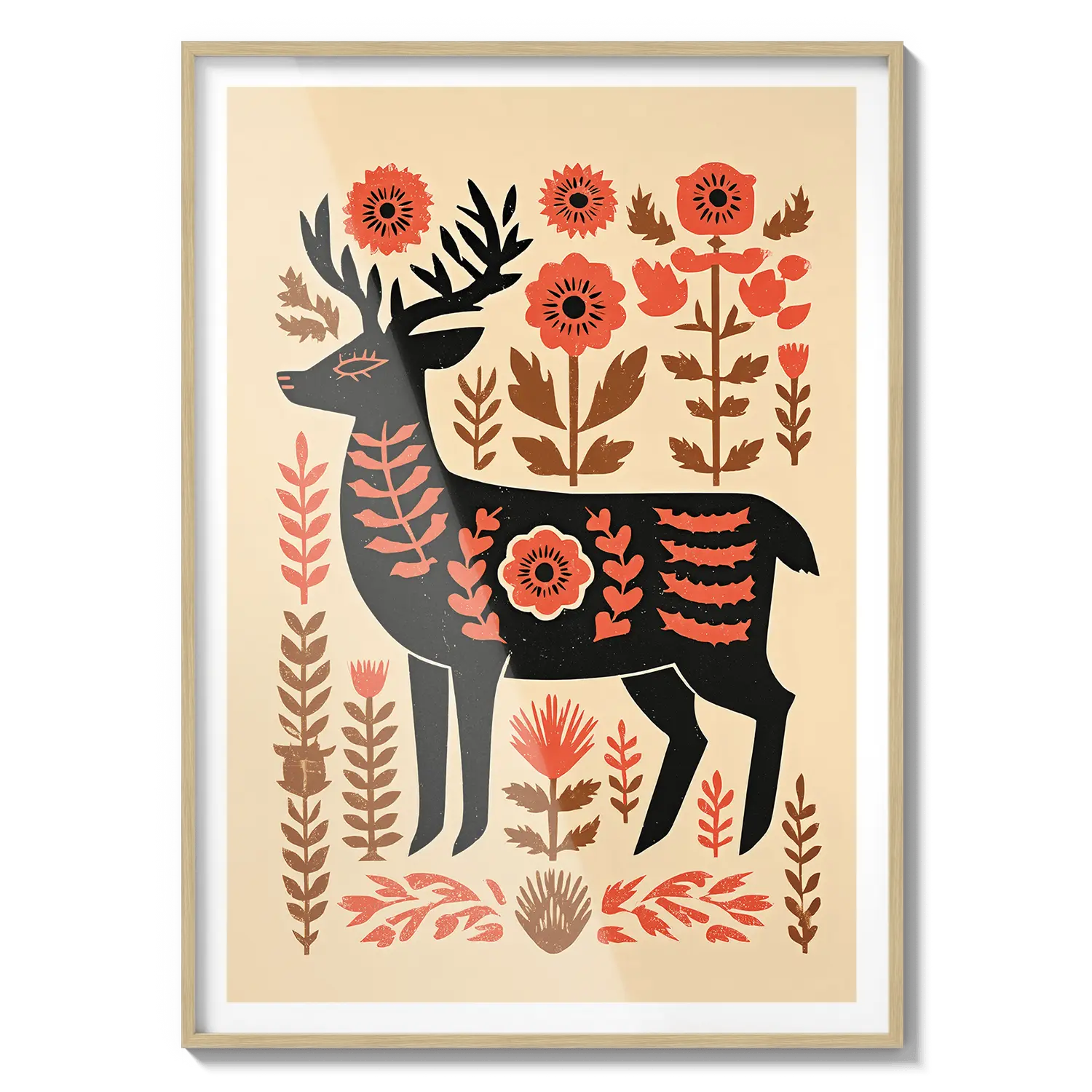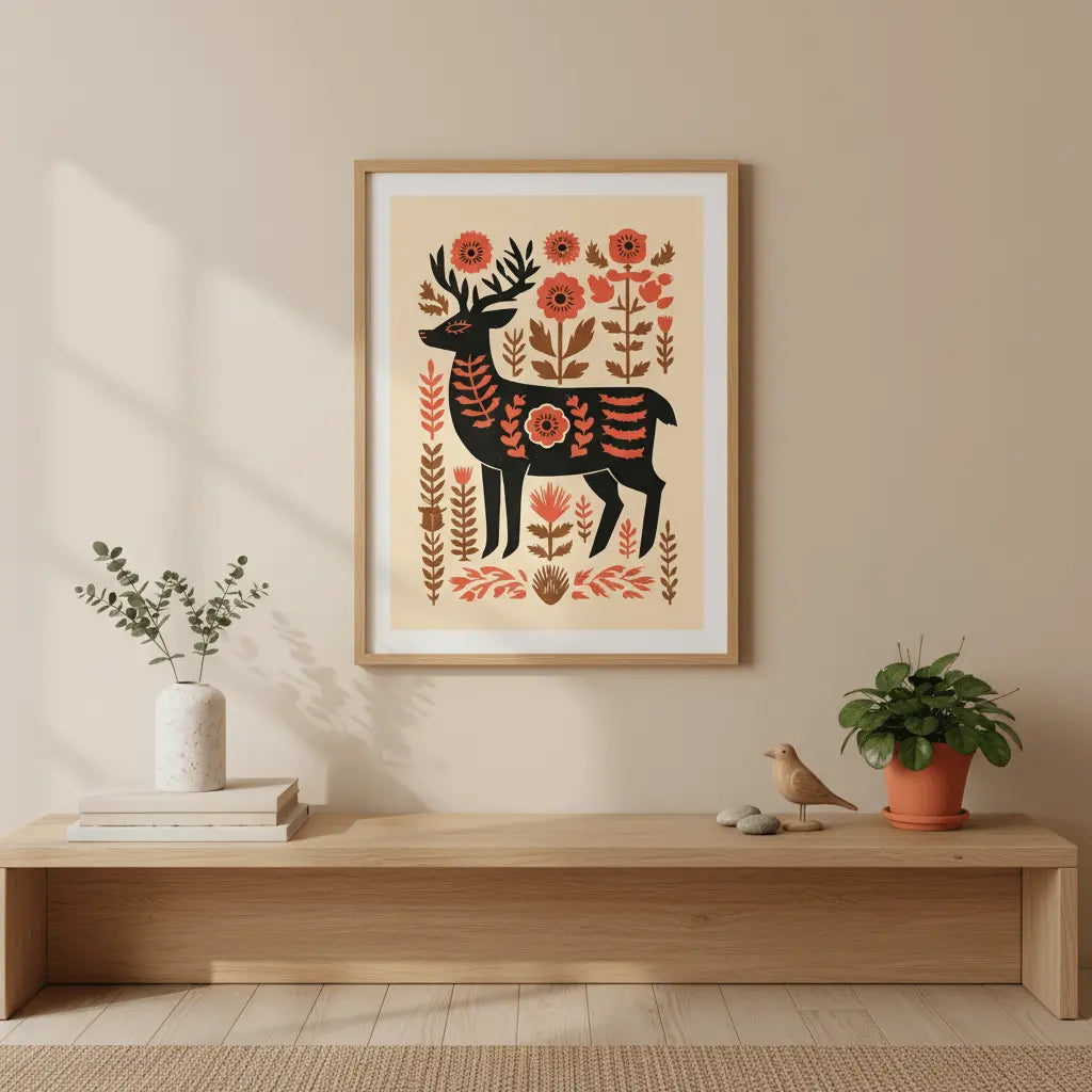 Un cervo stilizzato si erge tra calde forme floreali, fondendo il fascino dell'arte popolare con tenui toni naturali. Quest'opera d'arte trasmette un senso di premura e calore, un gesto gentile per chi apprezza la semplicità e la bellezza discreta.