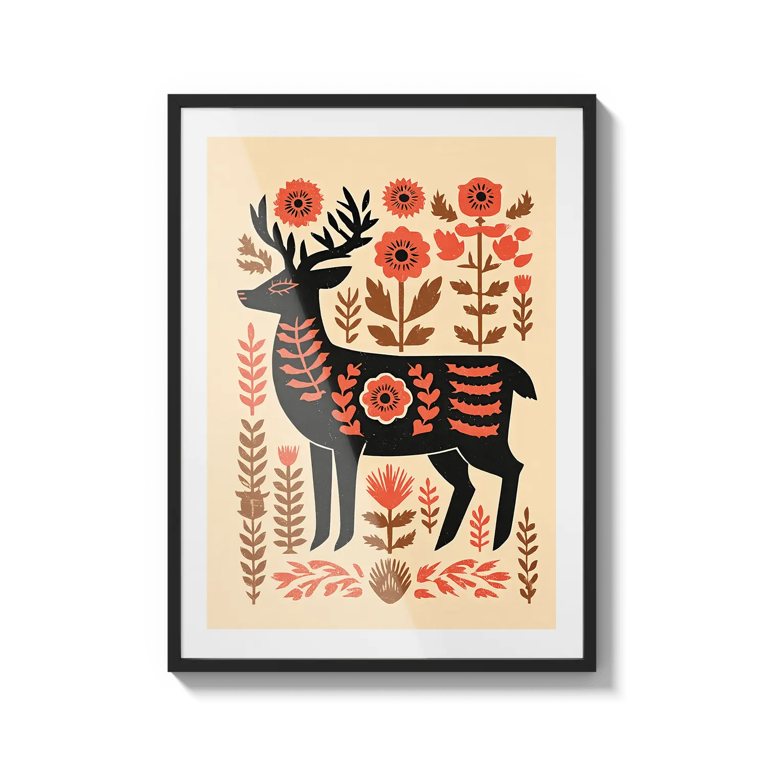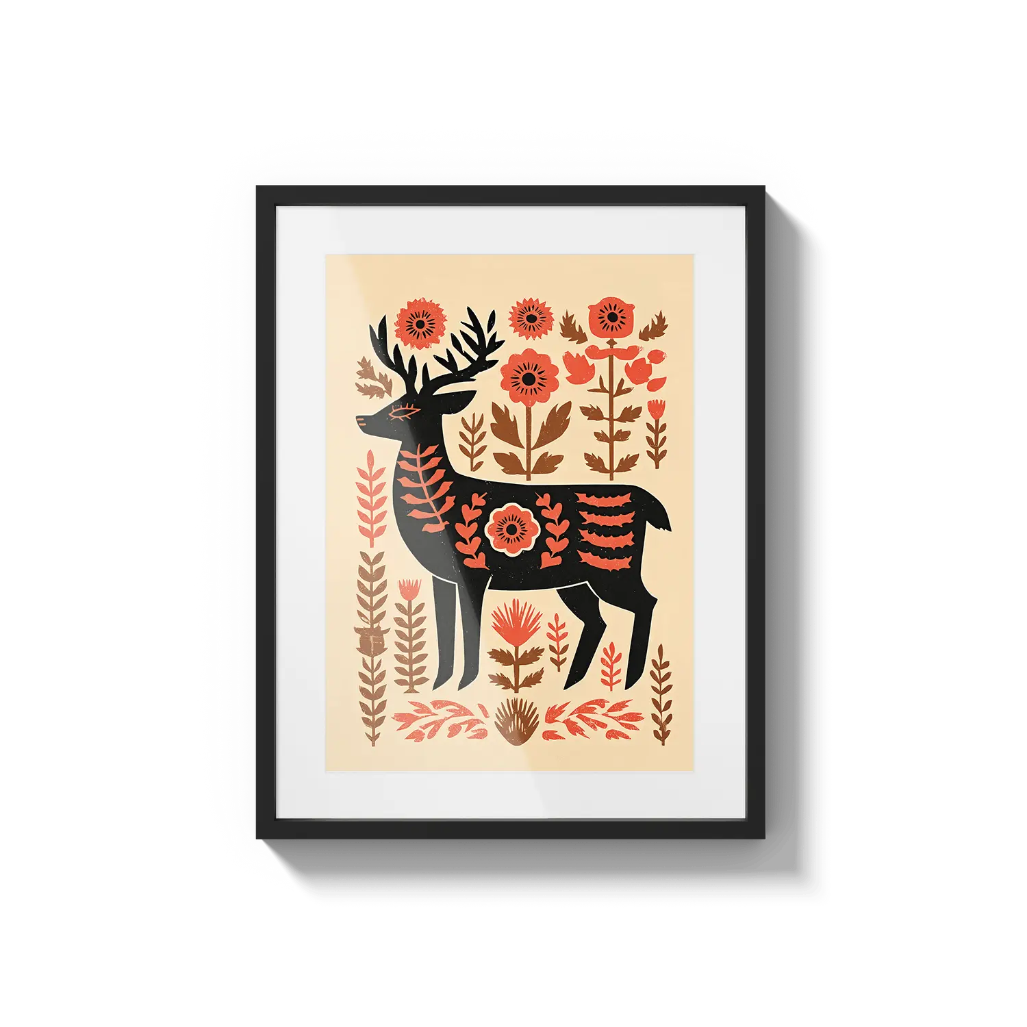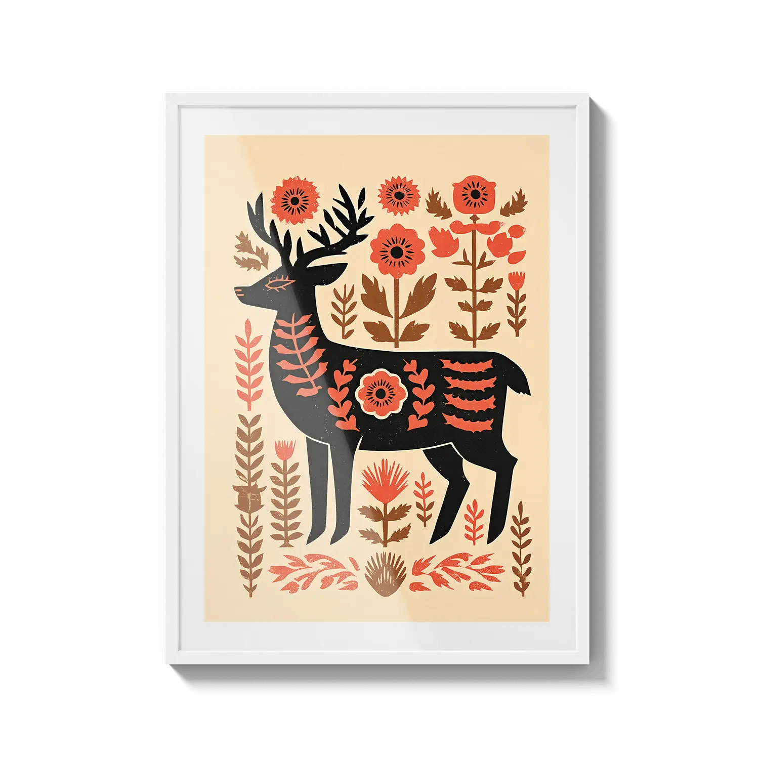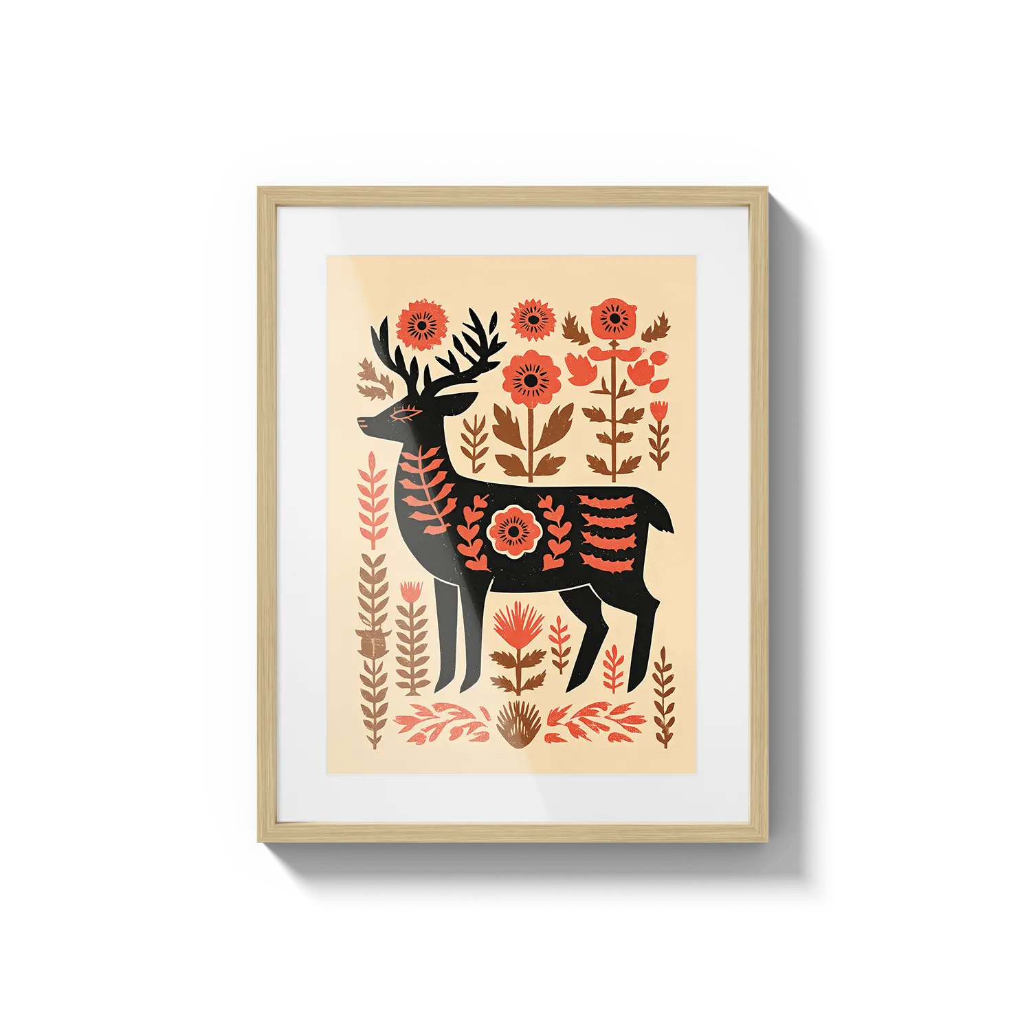 Un cervo stilizzato si erge tra calde forme floreali, fondendo il fascino dell'arte popolare con tenui toni naturali. Quest'opera d'arte trasmette un senso di premura e calore, un gesto gentile per chi apprezza la semplicità e la bellezza discreta.