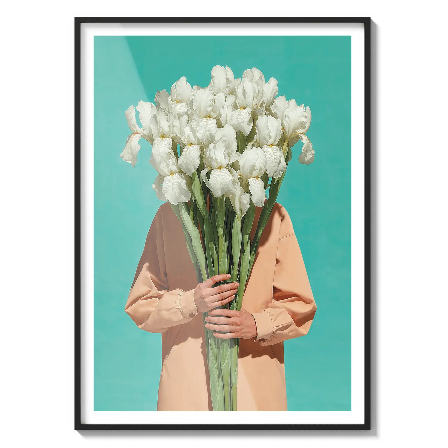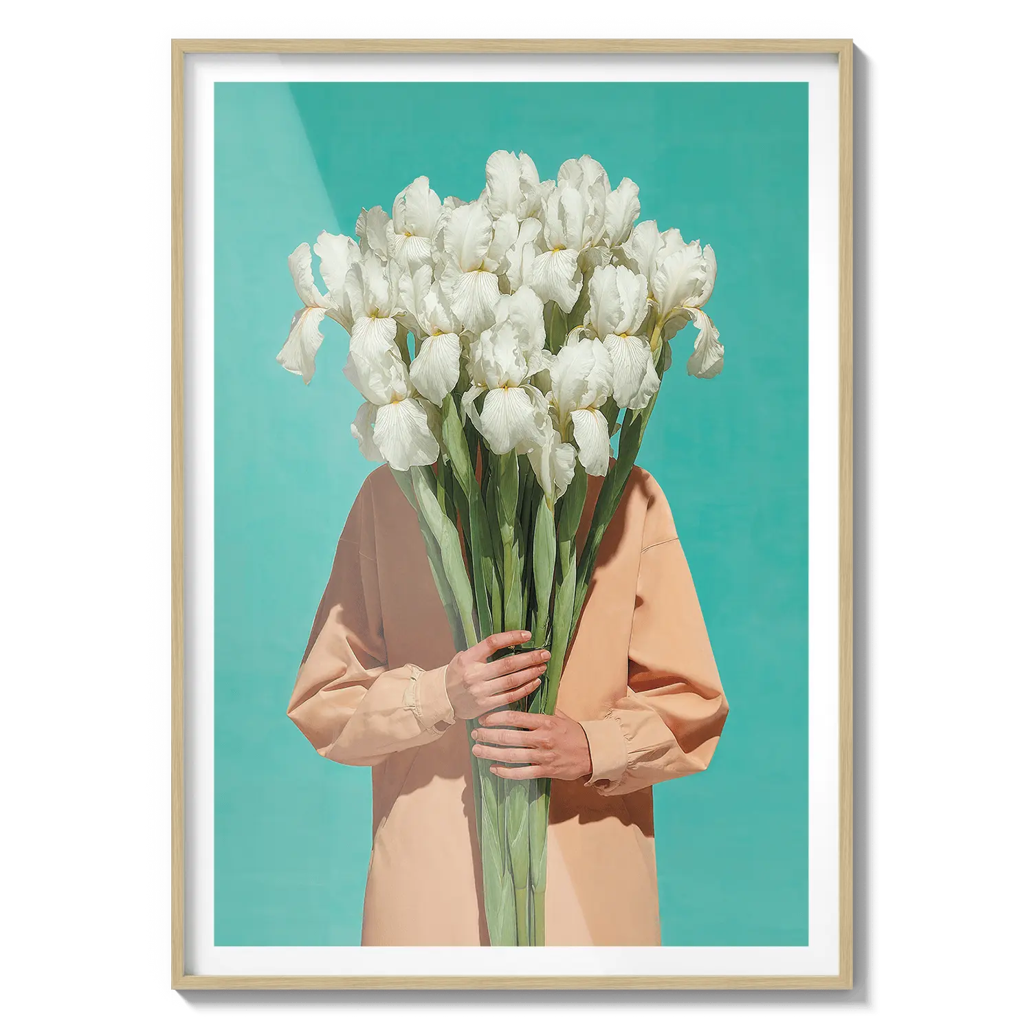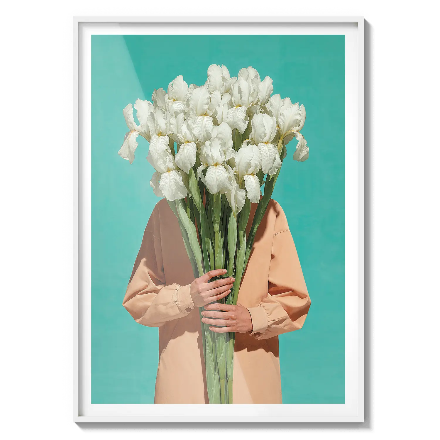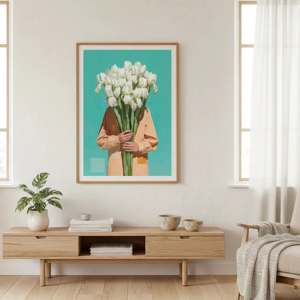 Una figura serena in piedi in un campo di fiori luminoso, avvolta in una luce calda e nella quiete. Un'opera d'arte delicata per ispirare speranza.