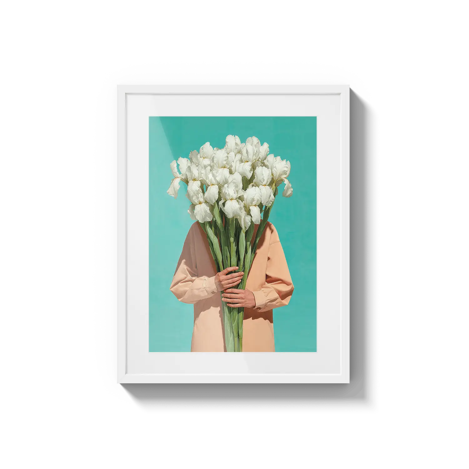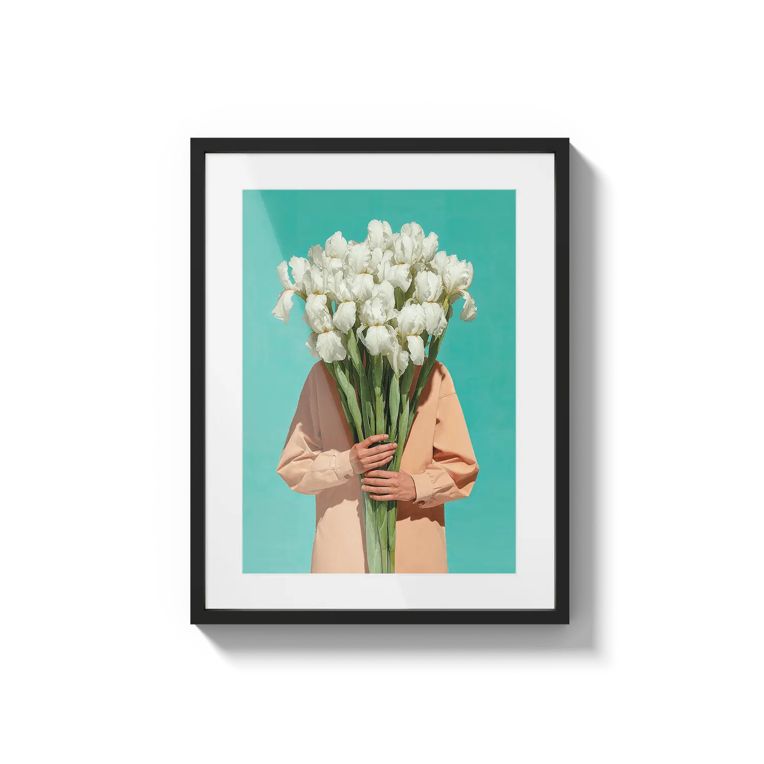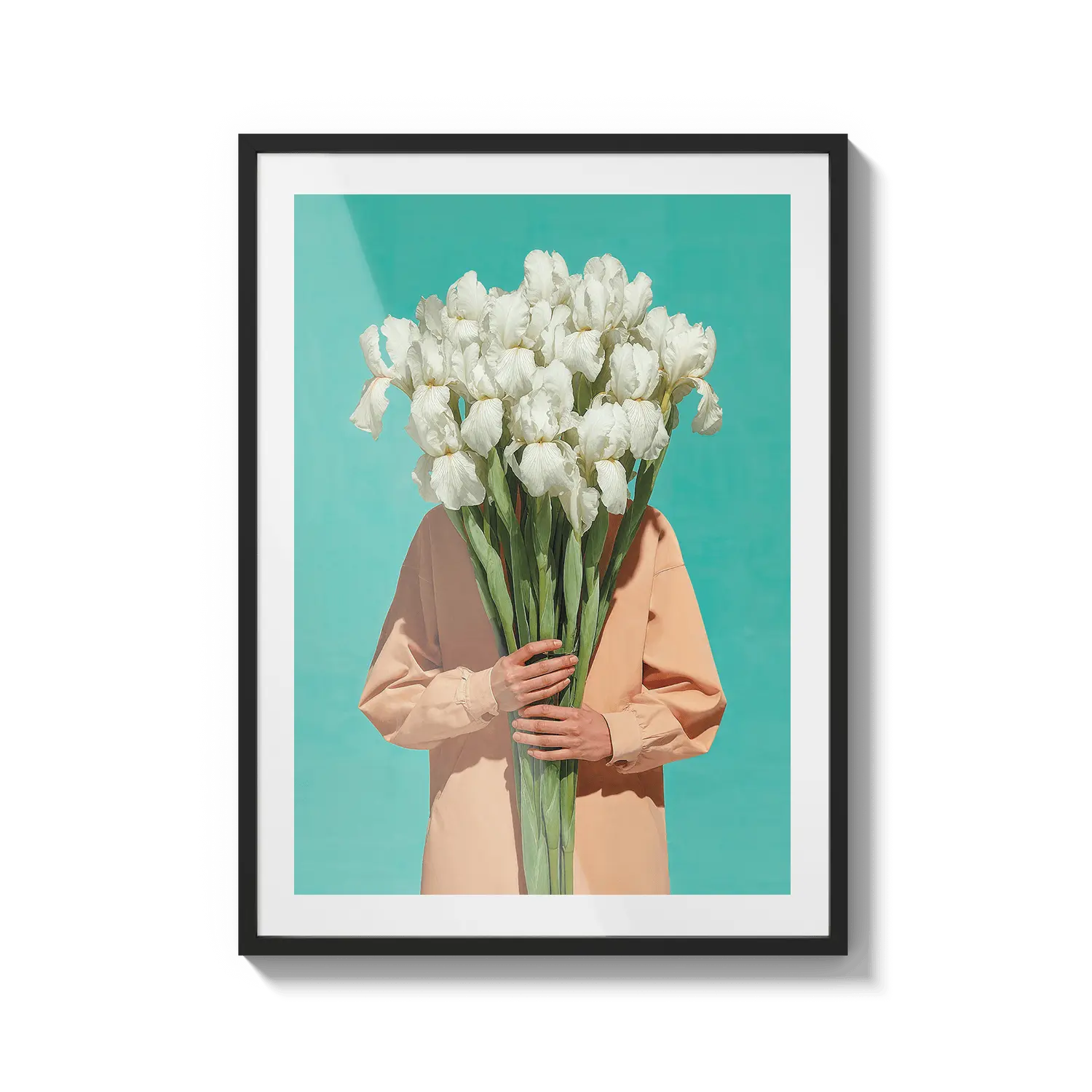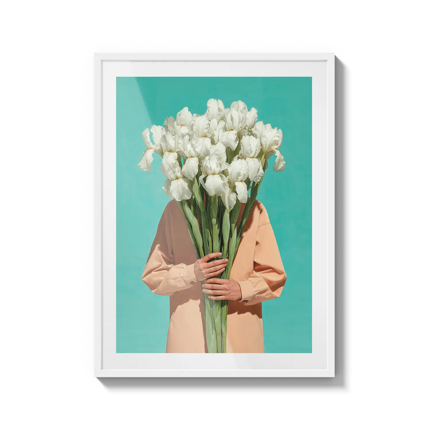 Una figura serena in piedi in un campo di fiori luminoso, avvolta in una luce calda e nella quiete. Un'opera d'arte delicata per ispirare speranza.