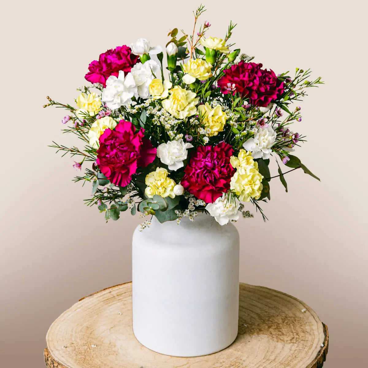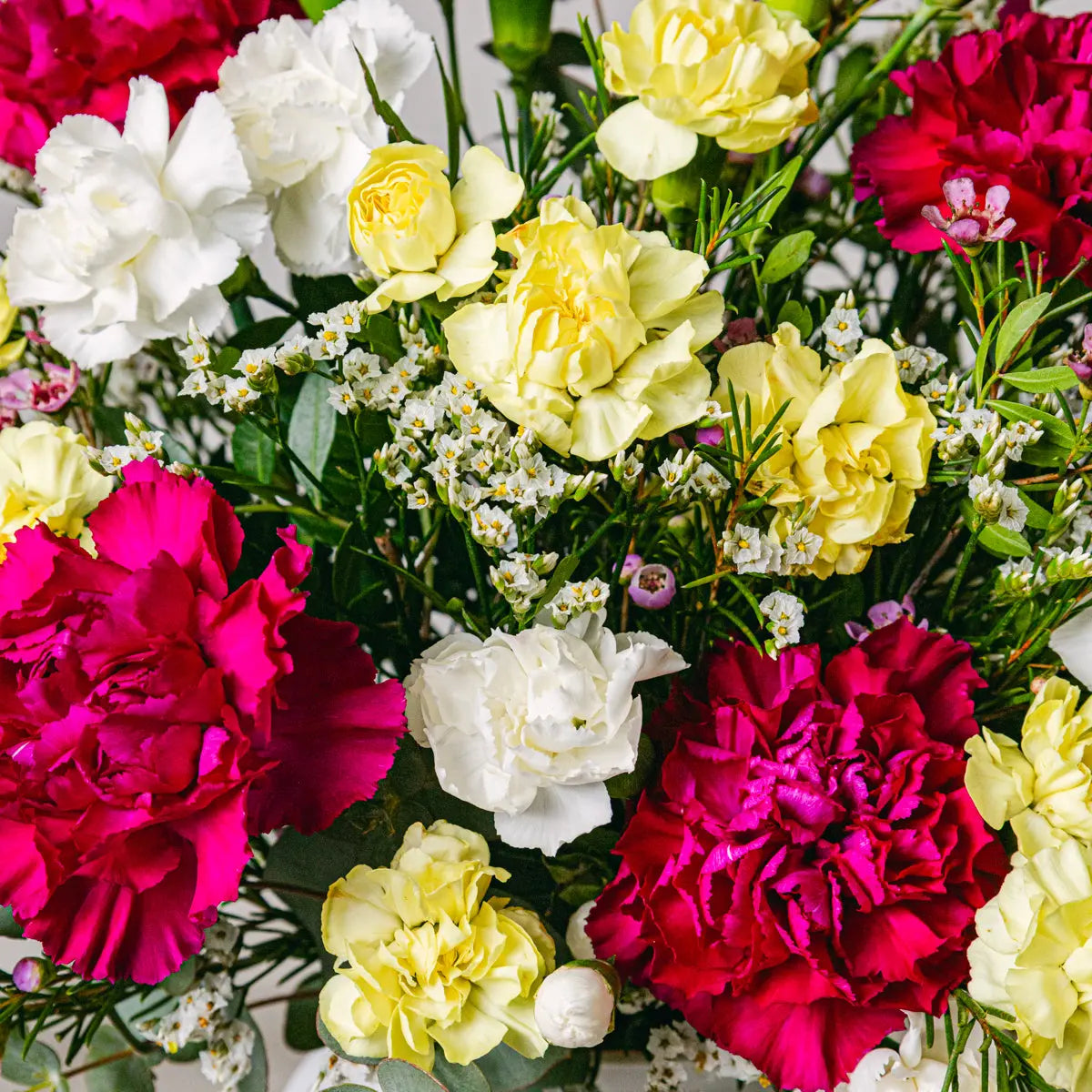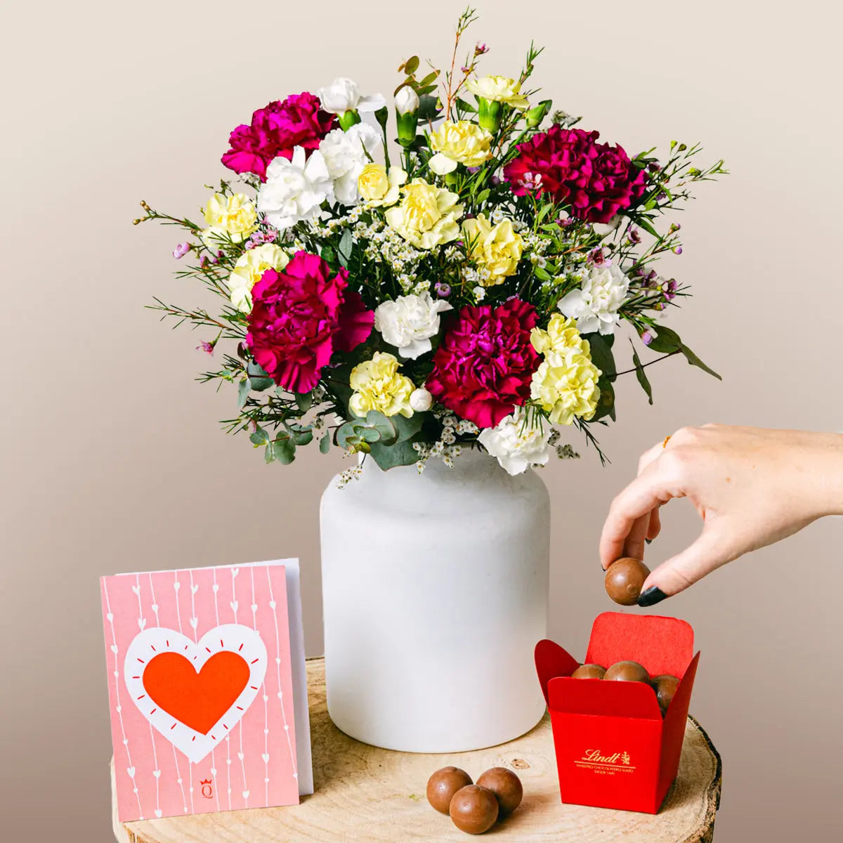 Scopri il caldo abbraccio dell'affetto con il nostro bouquet 'Armonia Sentita', una splendida combinazione di vivaci garofani e delicati lisianthus. Questa composizione pensata con cura parla il linguaggio dell'amore e dell'ammirazione, rendendola il regalo perfetto per riunire i cuori attraverso le distanze. I ricchi e profondi toni di garofani rossi e rosa simboleggiano un amore profondo e affetto, mentre il lisianthus bianco rappresenta purezza e innocenza, offrendo un messaggio dolce come i cioccolatini che li accompagnano.