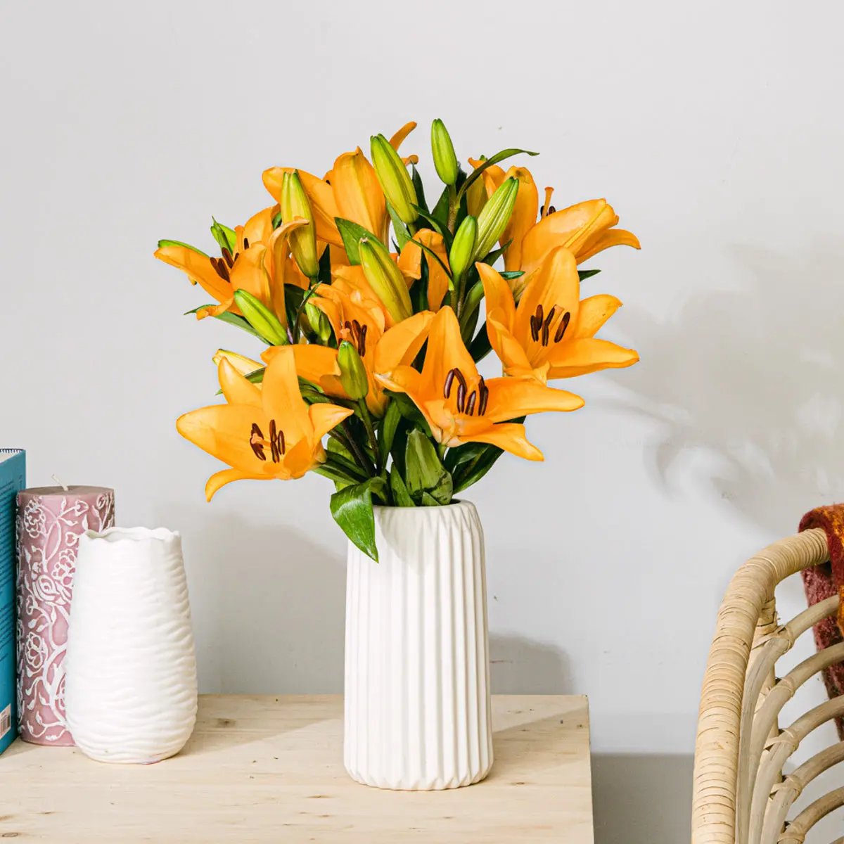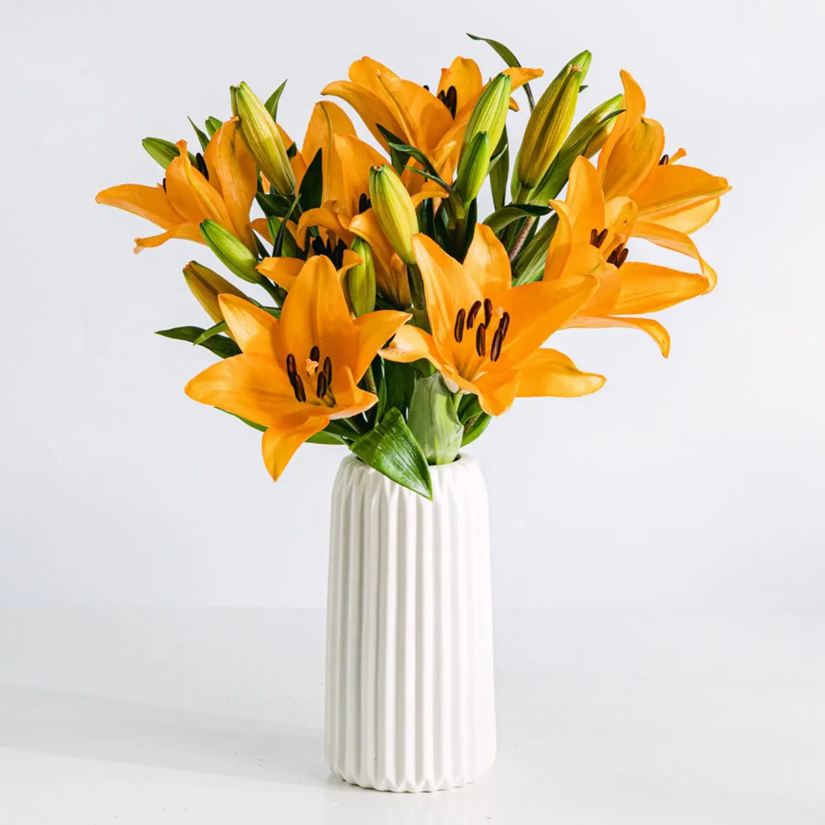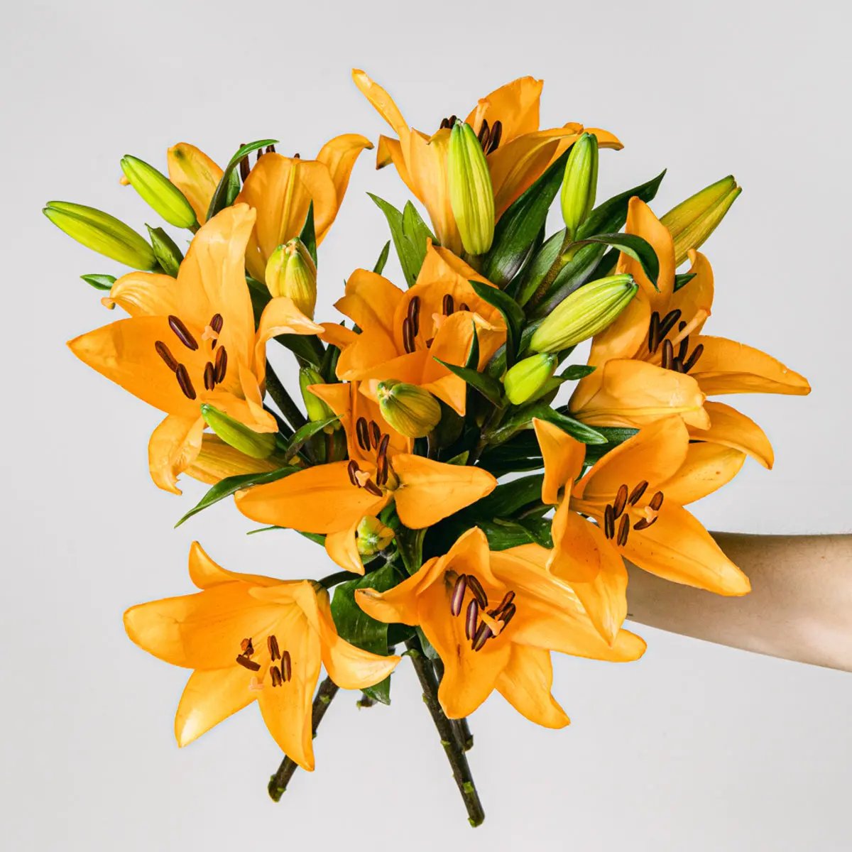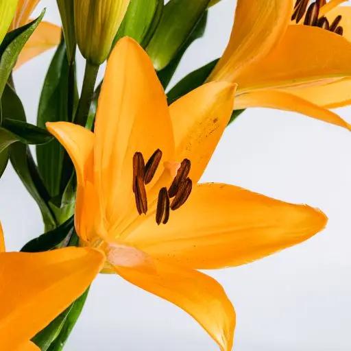Festeggiate qualsiasi momento importante della vostra vita con i vostri cari e in compagnia dei grandi fiori del lilium asiatico arancione, i cui ampi petali parlano di amore, impegno e dell'intensità con cui affrontiamo qualsiasi compito. Perfetto per... Riconoscere gli sforzi fatti.