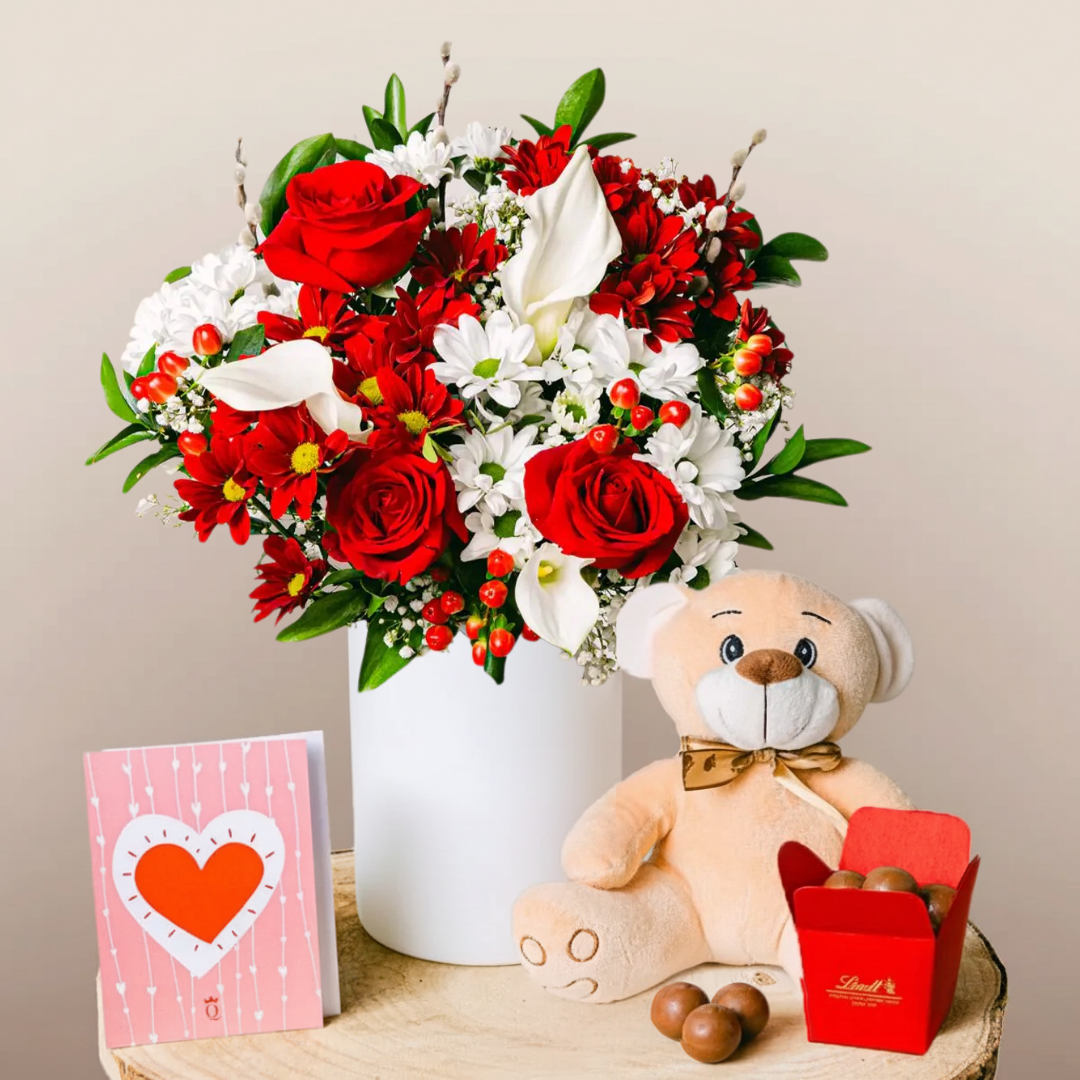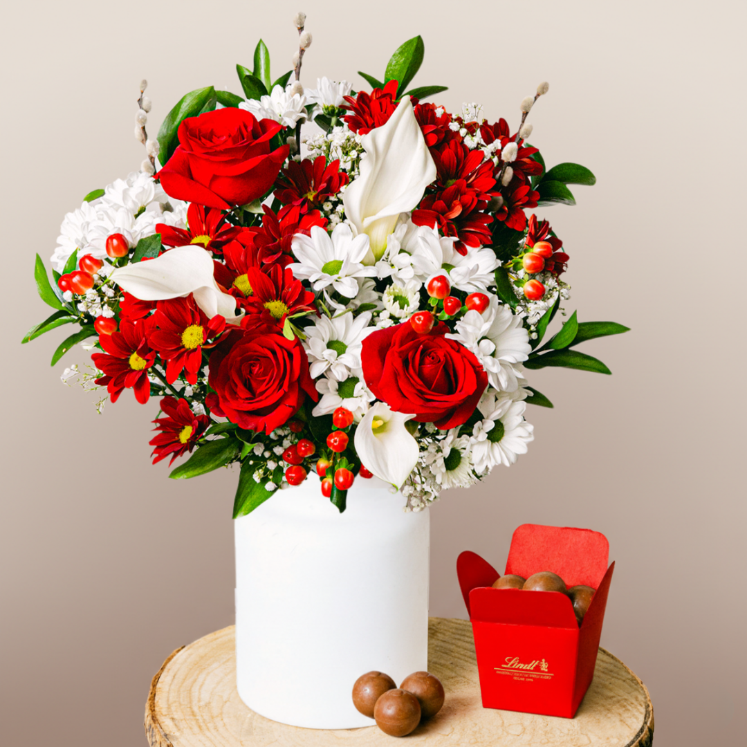I gigli Calla prendono il nome dalla parola greca per bello - Calla. Si dice che siano un portafortuna per avere felicità tutto l'anno. La loro sacralità e purezza sono completate da classiche e appassionate rose rosse, rendendo questo un bouquet yin-yang straordinario.