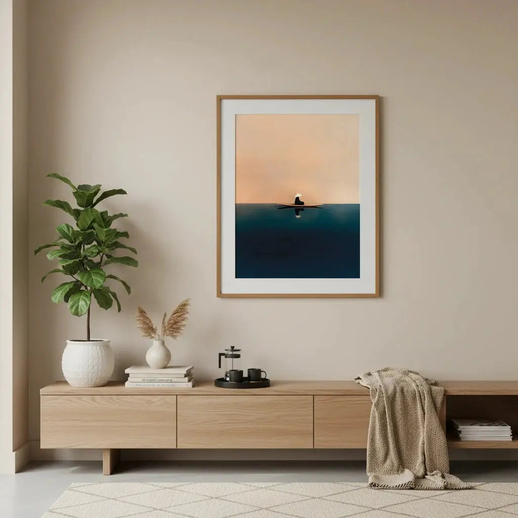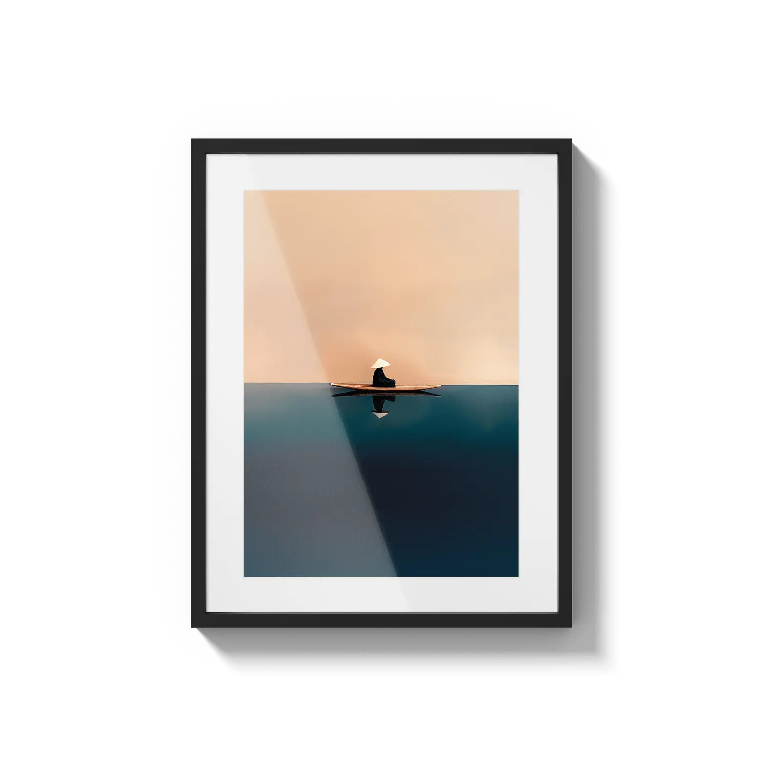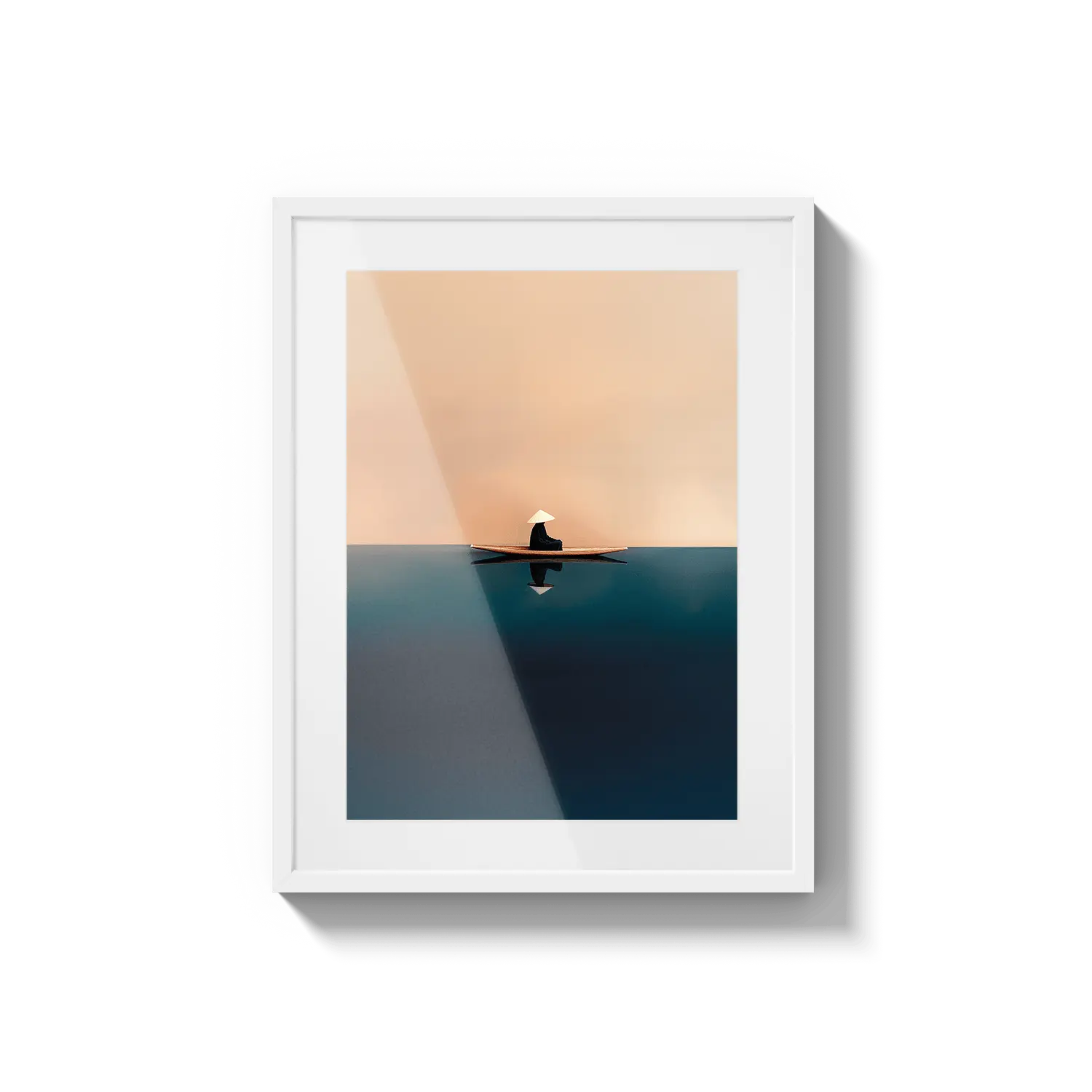 Una tranquilla barca a vela che naviga su dolci acque arancioni e blu, offrendo calma e contemplazione. Un regalo pacifico e rassicurante.