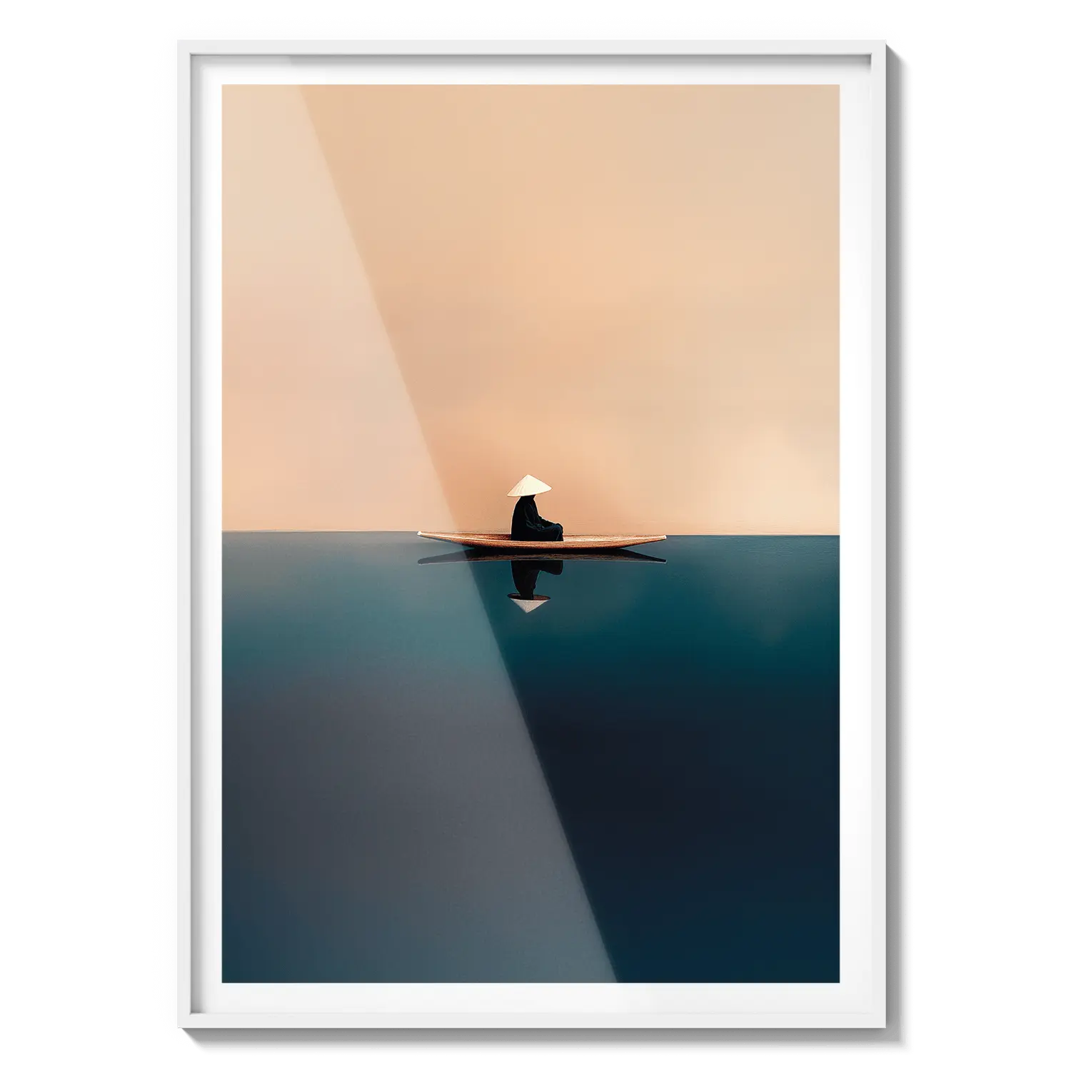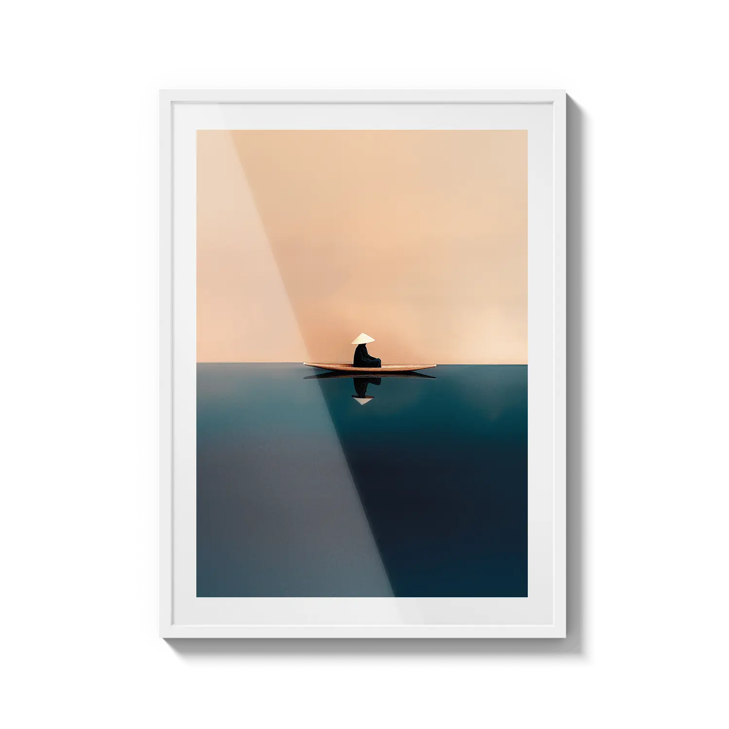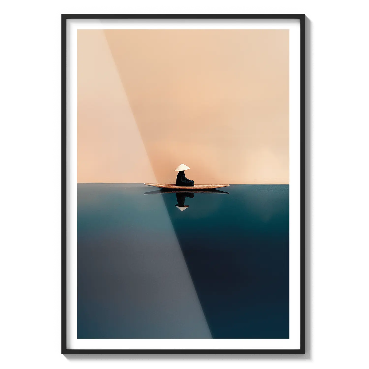 Una tranquilla barca a vela che naviga su dolci acque arancioni e blu, offrendo calma e contemplazione. Un regalo pacifico e rassicurante.