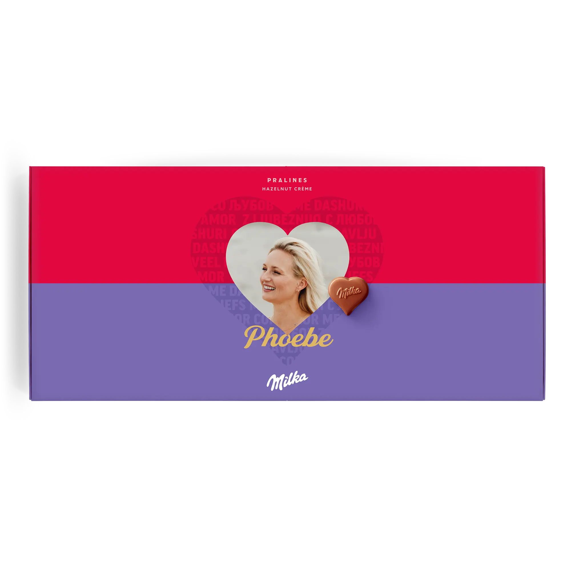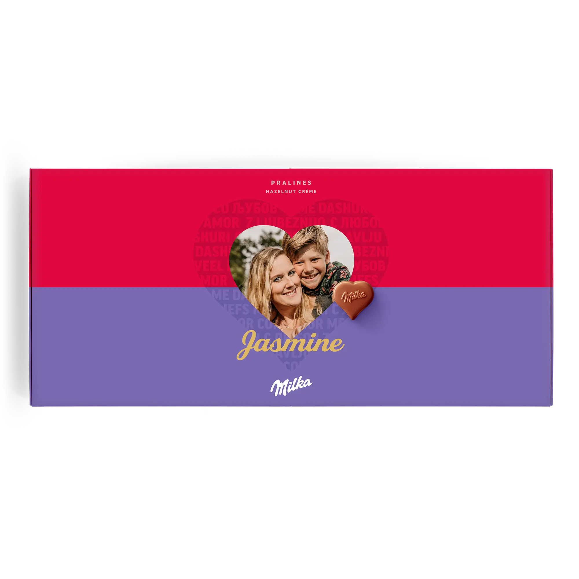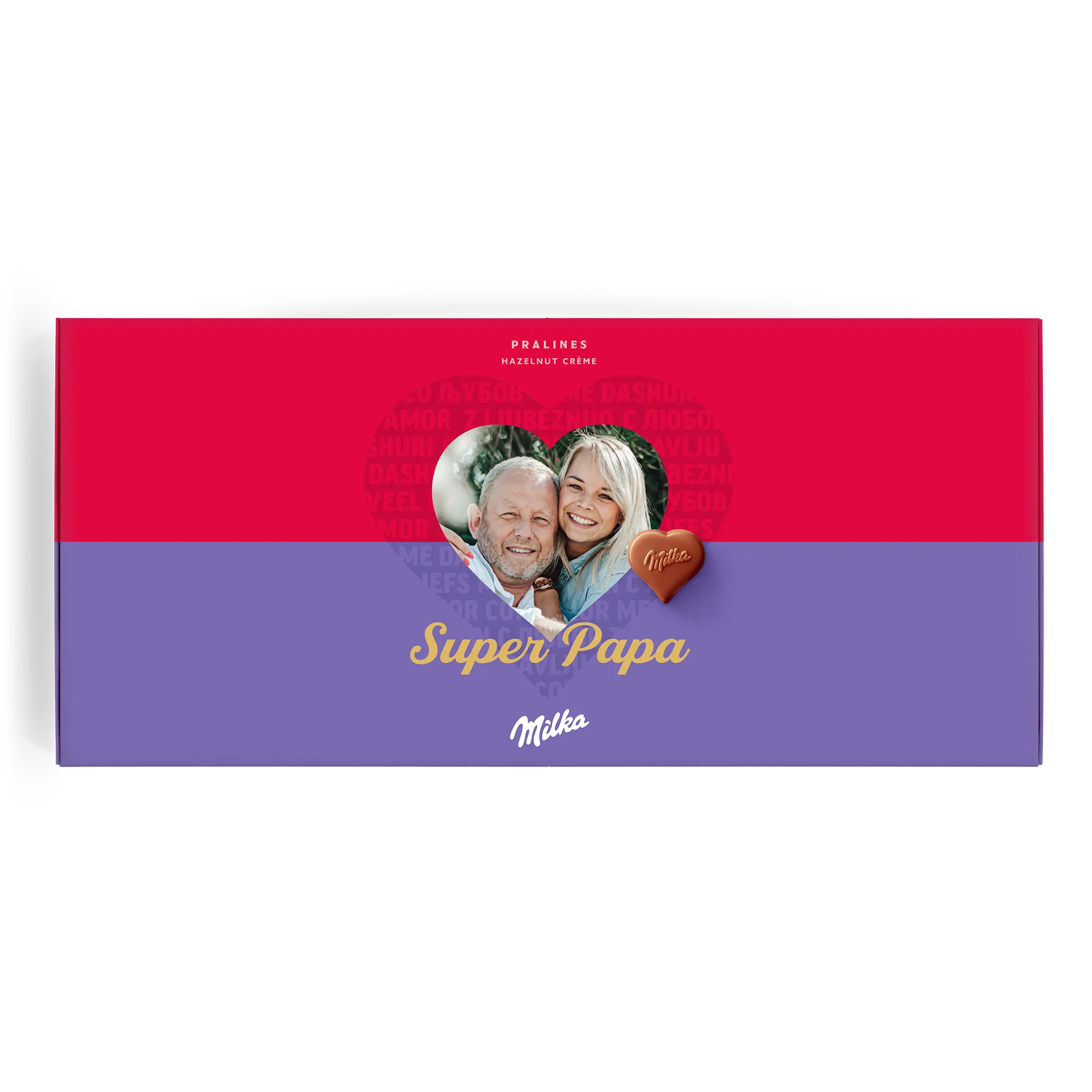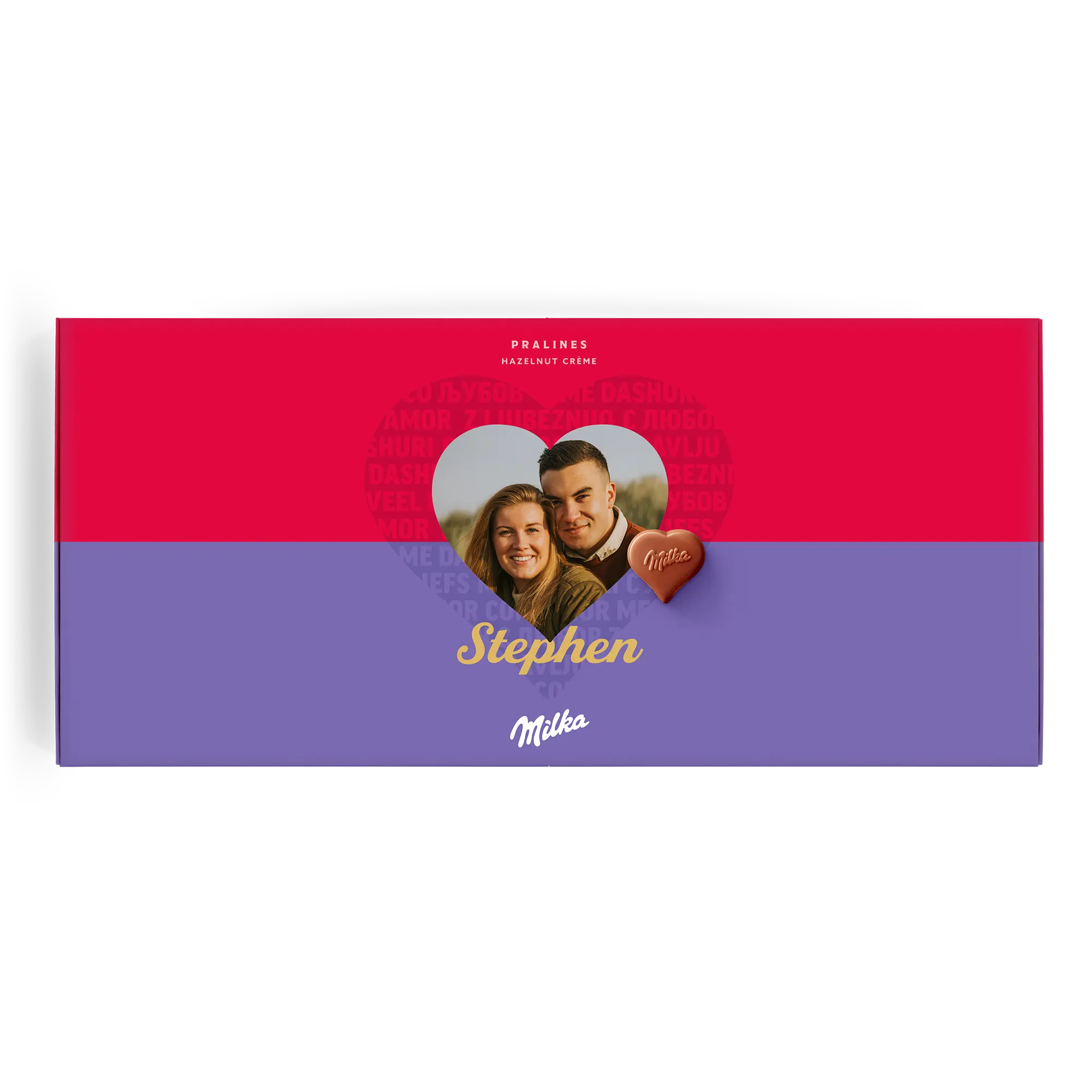 Confezione regalo speciale Say it with Milk per la persona che ami. Deliziose praline con nome, foto e un messaggio romantico Sorprendi la tua dolce metà!Ulteriori informazioni sulla confezione regalo amore Milka:Cioccolato: cioccolato al latte alpino con crema di nocciole e torroneForma delle praline: cuoriNumero di praline: 40Peso: 220 grammiDimensioni: 38.70 x 17.60 x 2.40 cmPersonalizzazione: foto, nome e messaggio personaleStampa: in impeccabile quadricromia Ingredienti: Zucchero, burro di cacao, olio di palma, pasta di cacao, siero di latte in polvere (da latte), latte scremato in polvere, grasso del latte, 5% di pasta di nocciole, emulsionanti (SOJAlecitina, E476), aromi (contengono latte).Allergeni: Contiene nocciole, latte e soia. Può contenere altra frutta a guscio.Buono a sapersi:Quando la temperatura esterna è di 25 gradi Celsius o superiore, non saremo in grado di garantire la qualità del cioccolato. Per qualunque domanda inerente i tuoi ordini di cioccolato, ti invitiamo a contattare il nostro team del servizio clienti.Per ragioni tecniche, non è possibile utilizzare caratteri cirillici, turchi, arabi, asiatici o speciali.