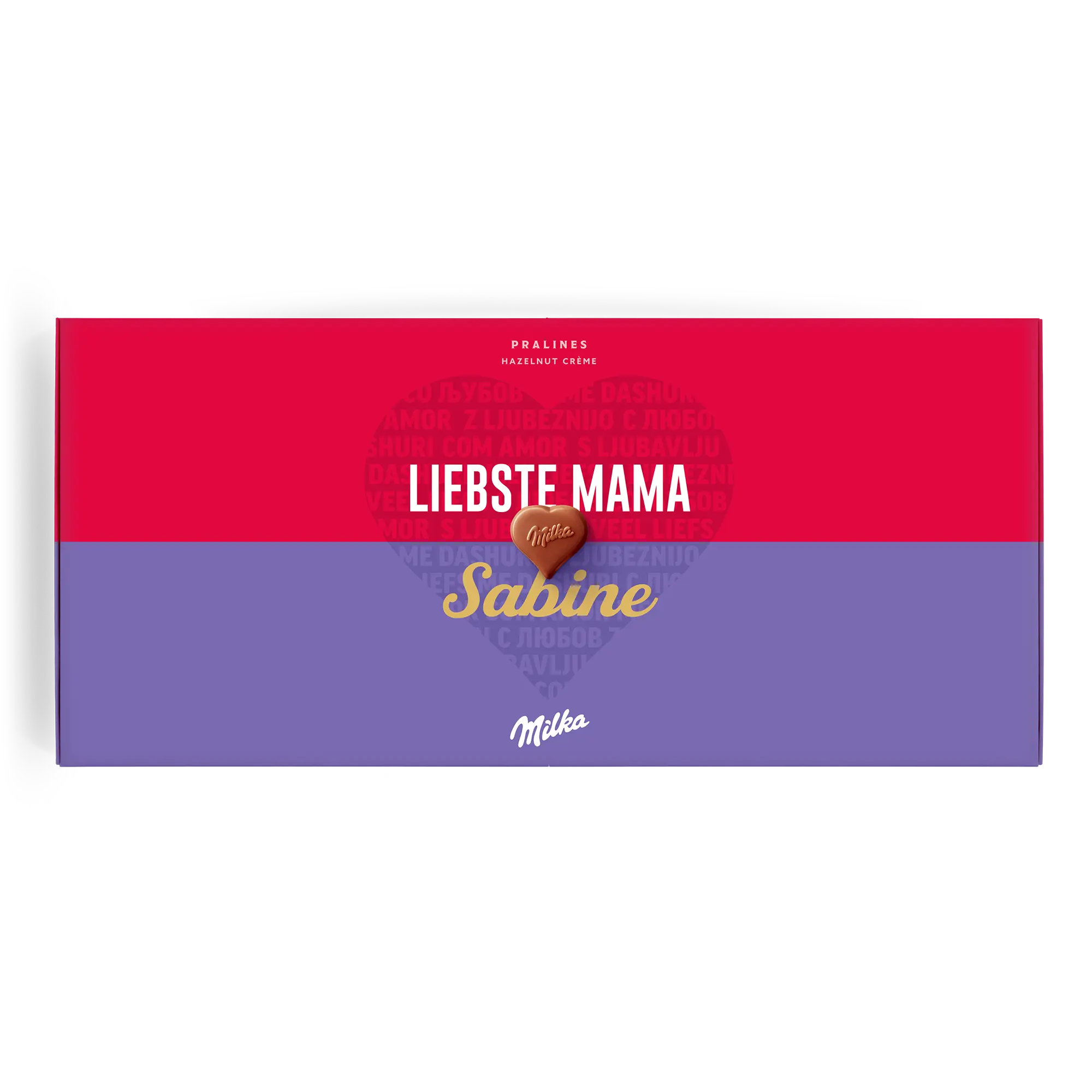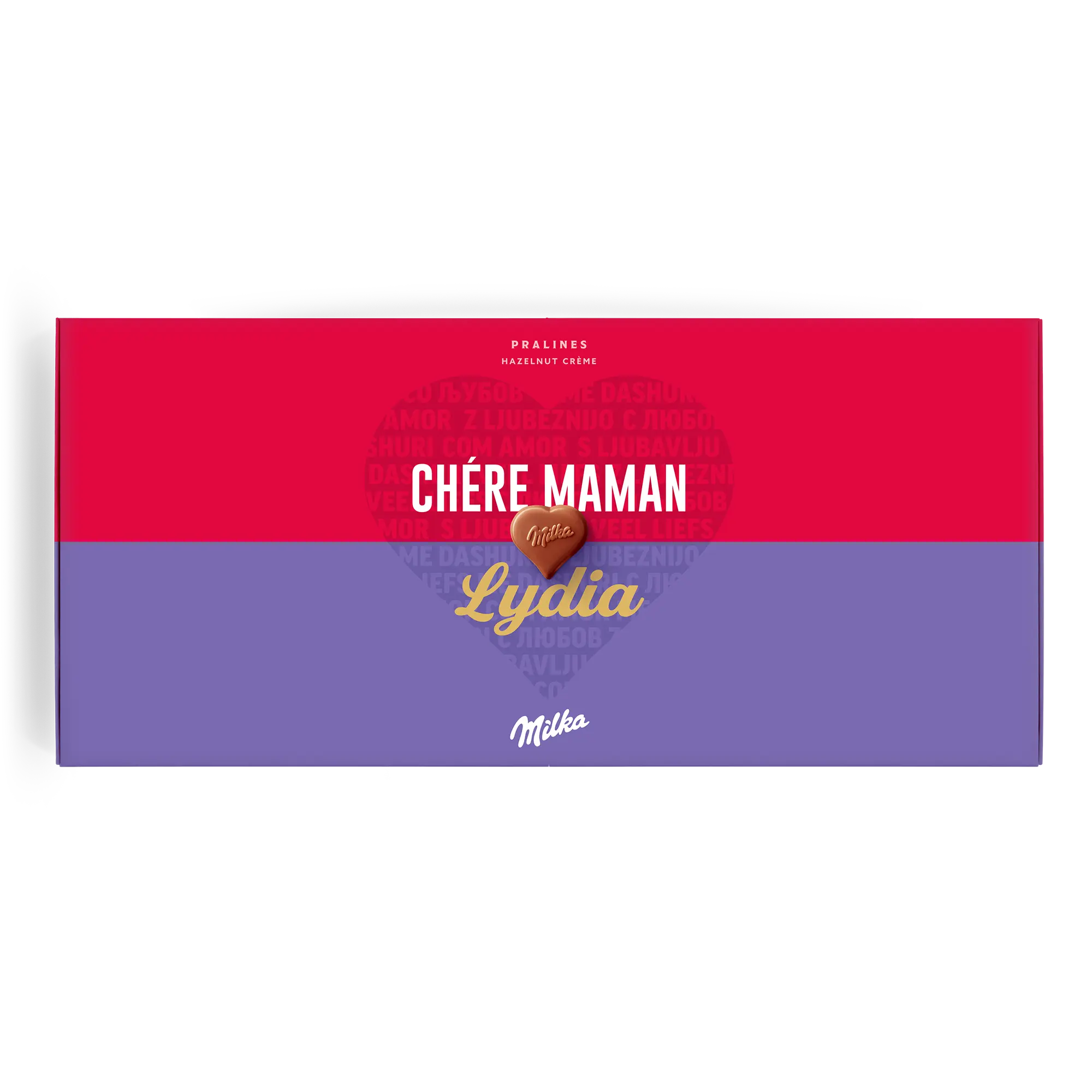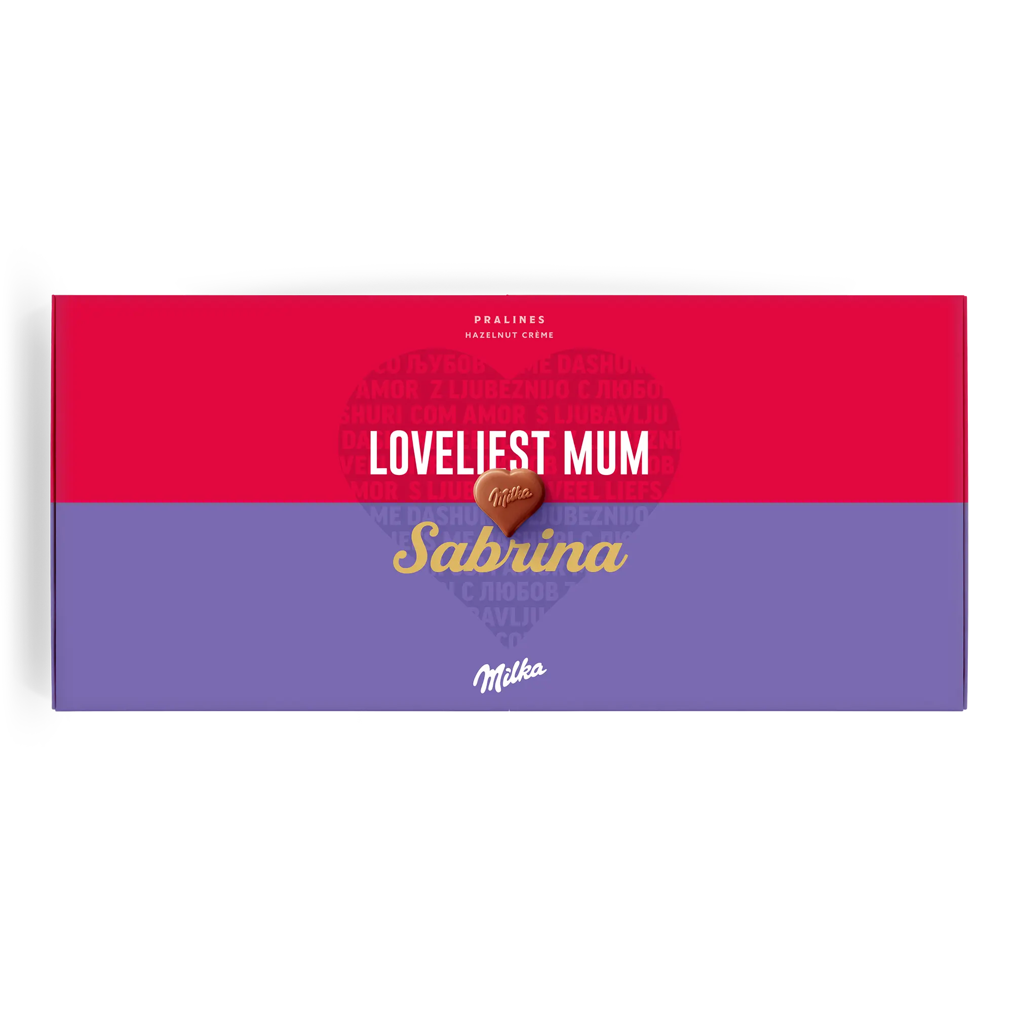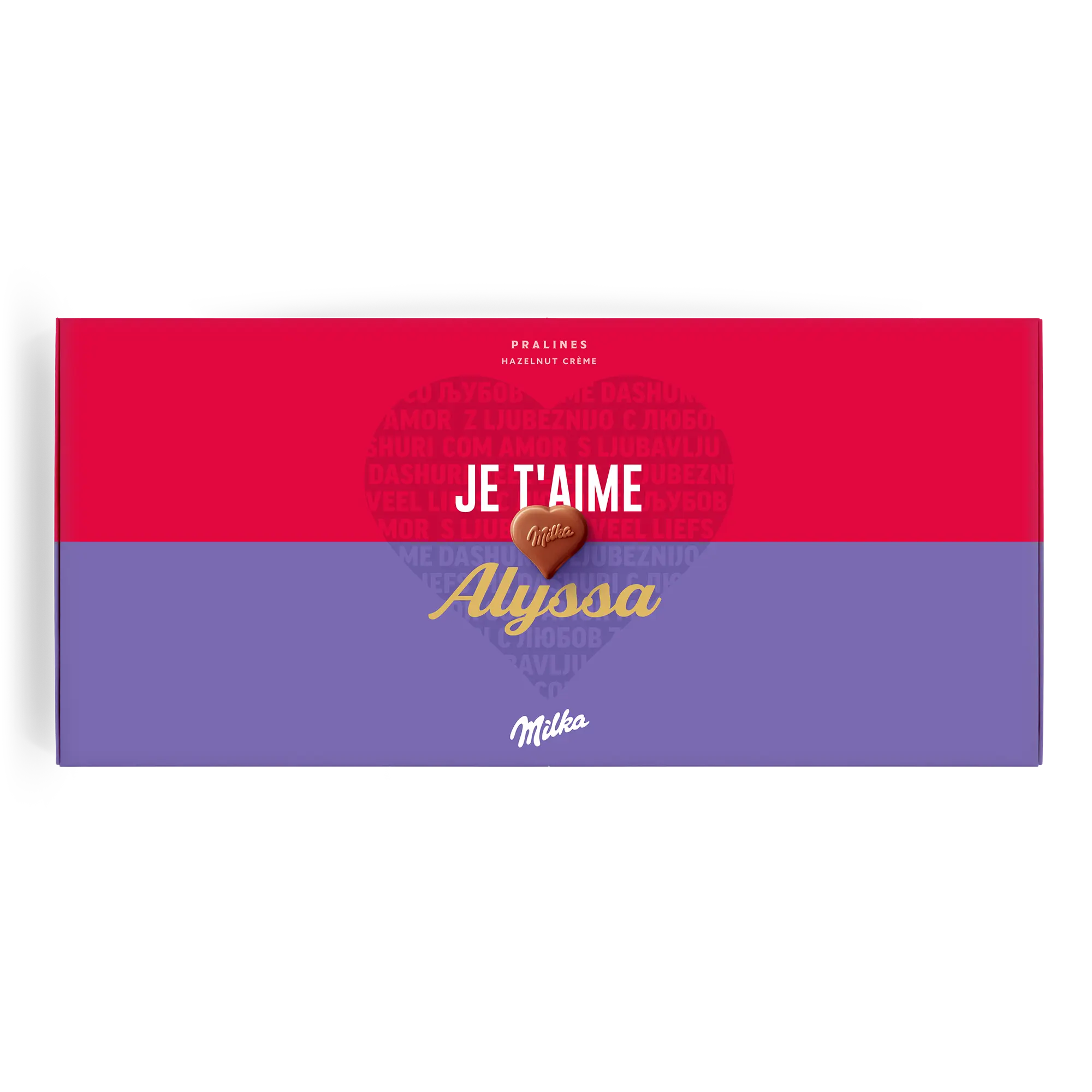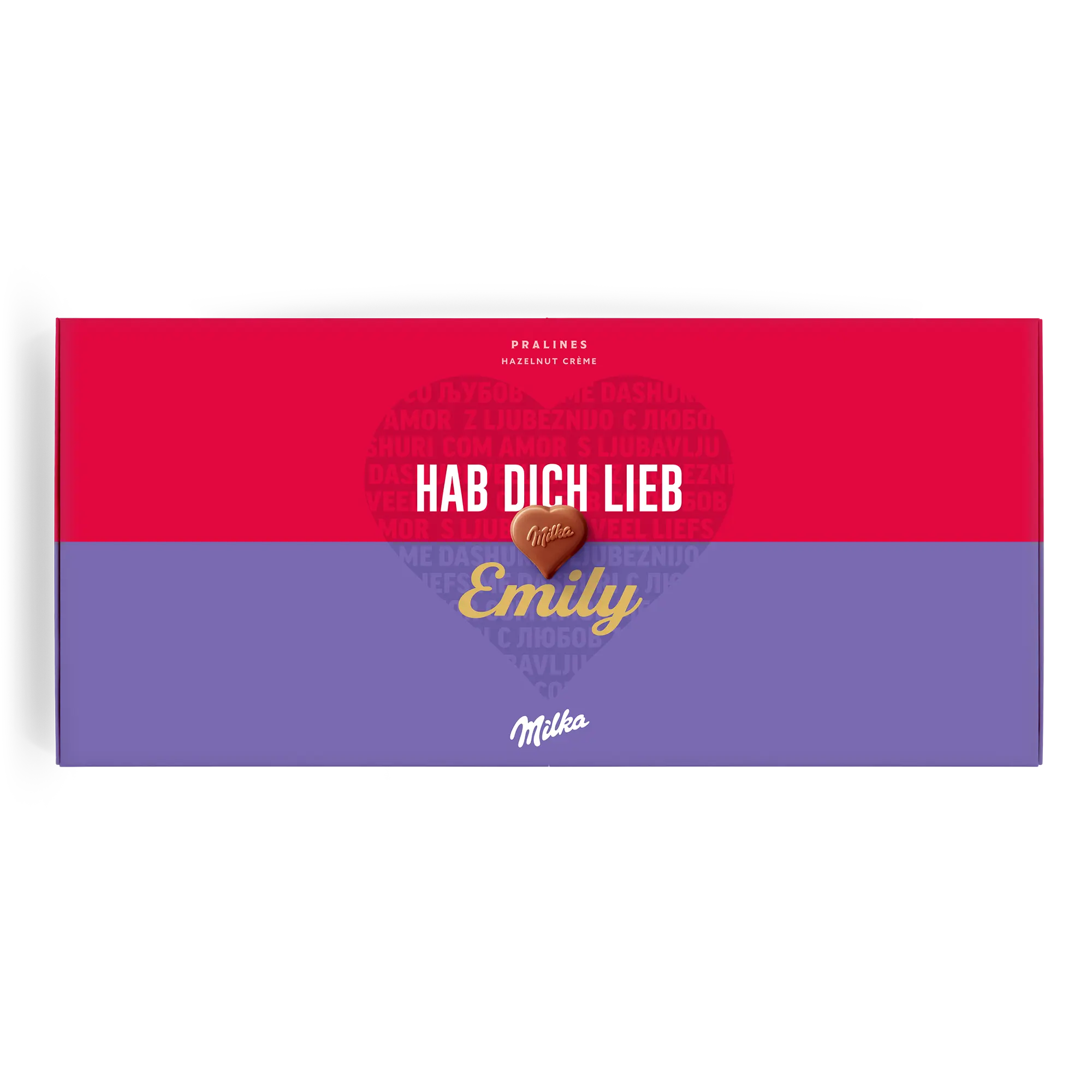 Confezione regalo speciale Say it with Milk per la persona che ami. Deliziose praline con nome, foto e un messaggio romantico Sorprendi la tua dolce metà!Ulteriori informazioni sulla confezione regalo amore Milka:Cioccolato: cioccolato al latte alpino con crema di nocciole e torroneForma delle praline: cuoriNumero di praline: 40Peso: 220 grammiDimensioni: 38.70 x 17.60 x 2.40 cmPersonalizzazione: foto, nome e messaggio personaleStampa: in impeccabile quadricromia Ingredienti: Zucchero, burro di cacao, olio di palma, pasta di cacao, siero di latte in polvere (da latte), latte scremato in polvere, grasso del latte, 5% di pasta di nocciole, emulsionanti (SOJAlecitina, E476), aromi (contengono latte).Allergeni: Contiene nocciole, latte e soia. Può contenere altra frutta a guscio.Buono a sapersi:Quando la temperatura esterna è di 25 gradi Celsius o superiore, non saremo in grado di garantire la qualità del cioccolato. Per qualunque domanda inerente i tuoi ordini di cioccolato, ti invitiamo a contattare il nostro team del servizio clienti.Per ragioni tecniche, non è possibile utilizzare caratteri cirillici, turchi, arabi, asiatici o speciali.