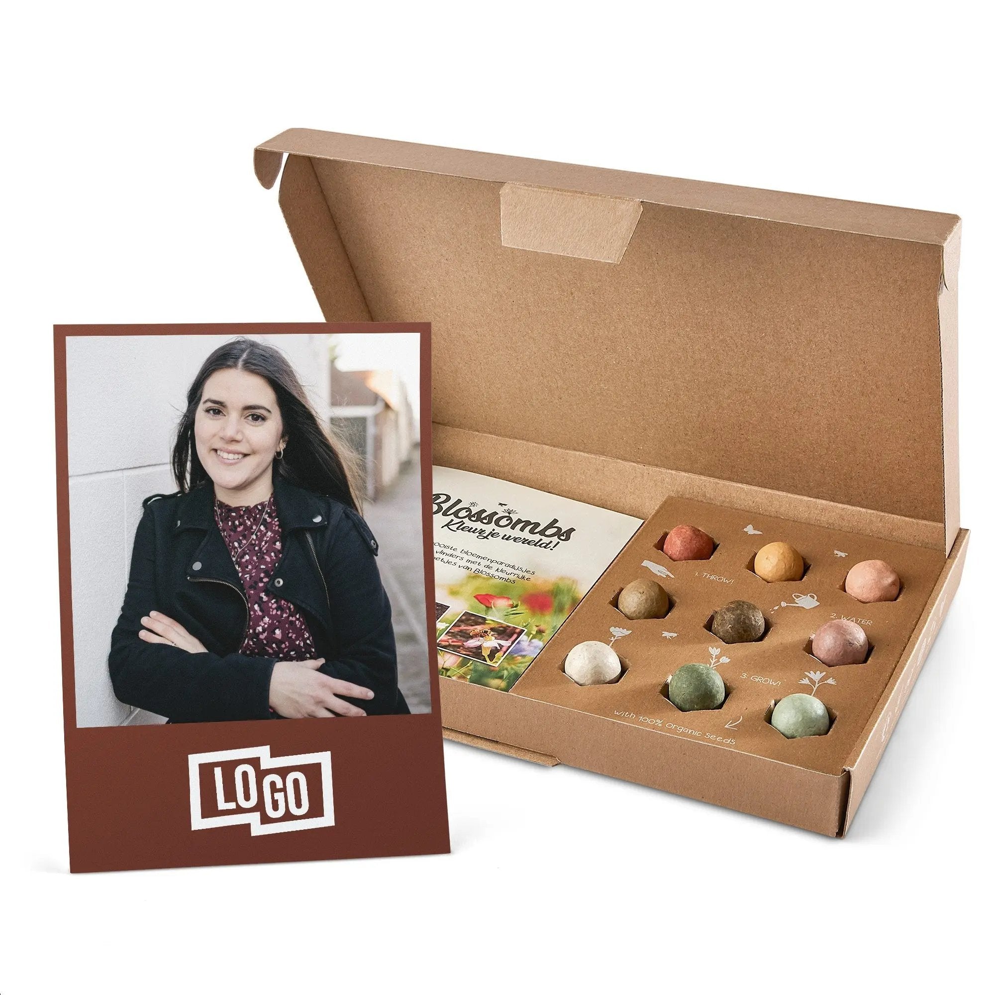 Maggiori informazioni sulle bombe di semi:Marchio: BlossombsNumero di bombe di semi incluse: 9 Uso: esterno, il periodo migliore dell'anno sono i mesi tra Marzo e Settembre.Peso: 150 grDimensioni della confezione: 24 x 16 x 2.6 cm Maggiori informazioni: i semi impiegano dai 2 ai 3 mesi di tempo per crescere. Maggiori infomazioni sul biglietto personalizzato: Tipo di biglietto: stile "cartolina"Dimensioni: 14.8 x 10.5 cm Finitura: opacaStampa: a colori, di ottima qualitàPersonalizzazione: con foto e/o testo Busta: 1 busta inclusa Per ragioni tecniche, non è possibile utilizzare caratteri cirillici, arabi, asiatici, greci o speciali.