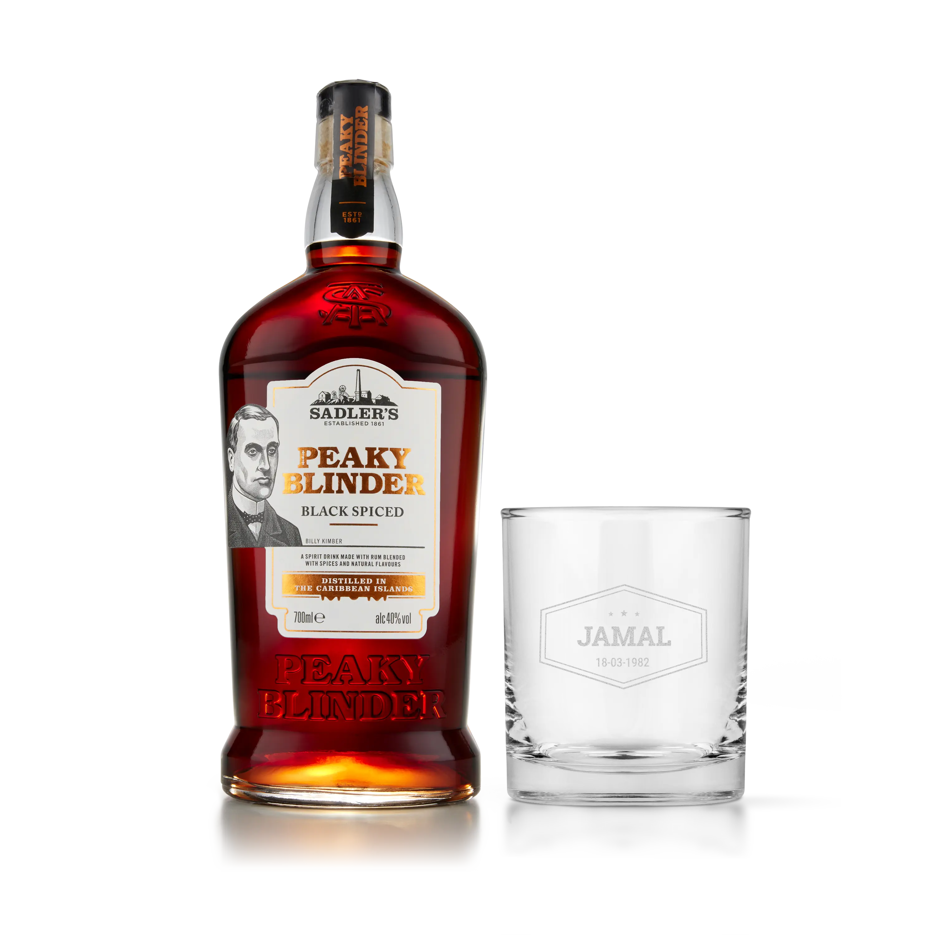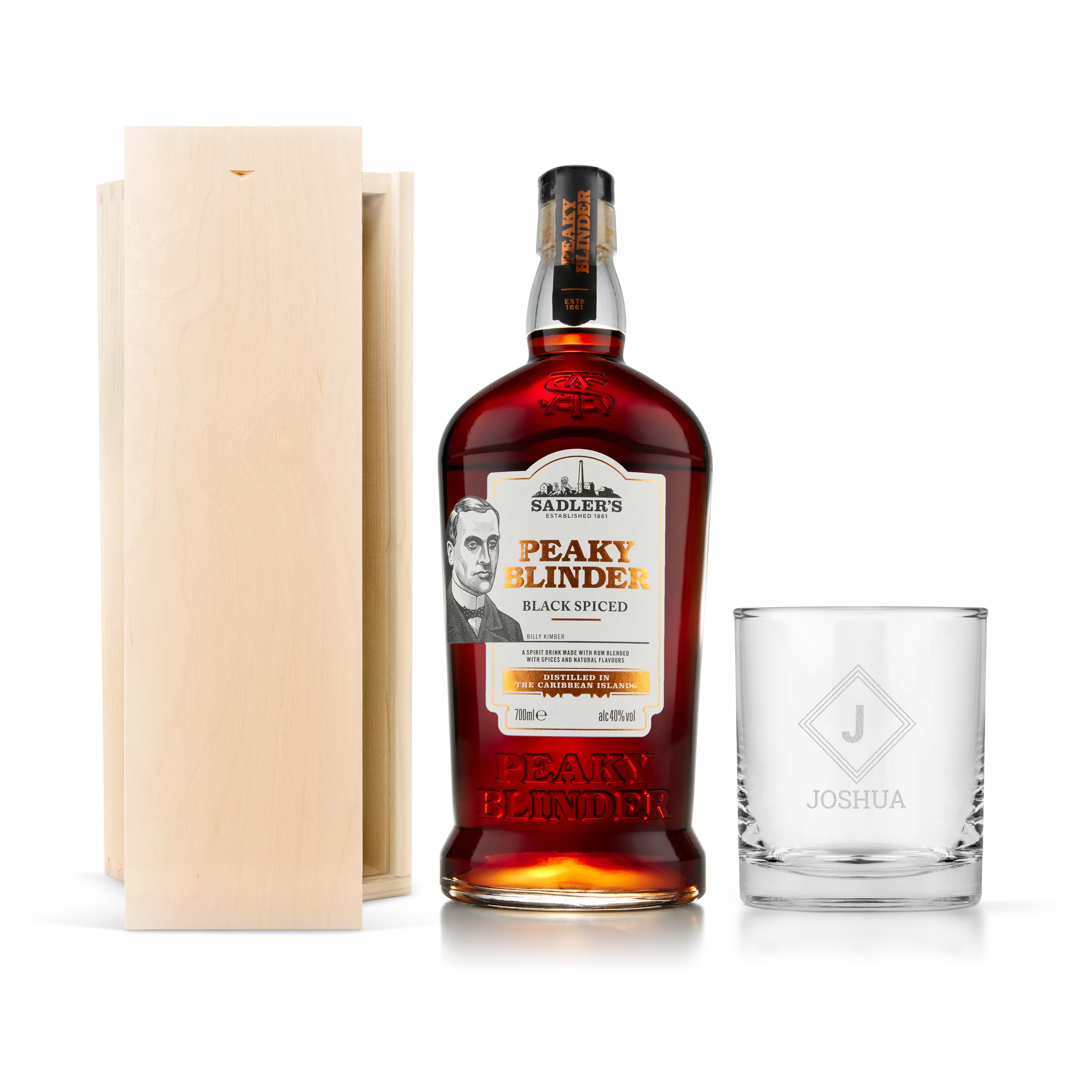 Ispirata alla famosa serie televisiva. Chi sorprenderai con una confezione di gin Peaky Blinders? Comprende un bicchiere da rum inciso.Ulteriori informazioni sulla personalizzazionePersonalizzazione: con nome o testo Finitura: incisione al laser di alta qualitàColore dell'incisione: bianco Dimensioni della cassetta: 36,5 x 12 x 11 cmDettagli: la cassetta in legno reca il marchio di omologazione FSCUlteriori dettagli sul rumNome: Sadler's Peaky BlinderTipo di rum: nero speziatoContenuto: 700 mlPaese d'origine: Inghilterra Percentuale alcolica: 40% Carattere: Il rum Peaky Blinder viene distillato con varie spezie. Con sentori di arancia e noce moscata. Assaggi deliziose note o chiodi di garofano, vaniglia e ananas.