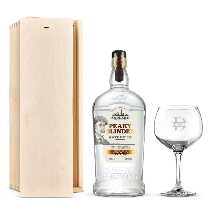 Ispirata alla famosa serie televisiva. Chi sorprenderai con una confezione di gin Peaky Blinders? Comprende un lussuoso bicchiere da gin-tonic con incisione.Ulteriori informazioni sulla personalizzazionePersonalizzazione: con nome o testo Finitura: incisione al laser di alta qualitàColore dell'incisione: bianco Dimensioni della cassetta: 36,5 x 12 x 11 cmDettagli: la cassetta in legno reca il marchio di omologazione FSCUlteriori dettagli sul ginNome: Sadler's Peaky BlinderTipo di gin: secco speziatoContenuto: 700 mlPaese d'origine: Inghilterra Percentuale alcolica: 40% Carattere: il gin Peaky Blinder è un gin secco con erbe e spezie esotiche, come zenzero, pepe nero e cassia.