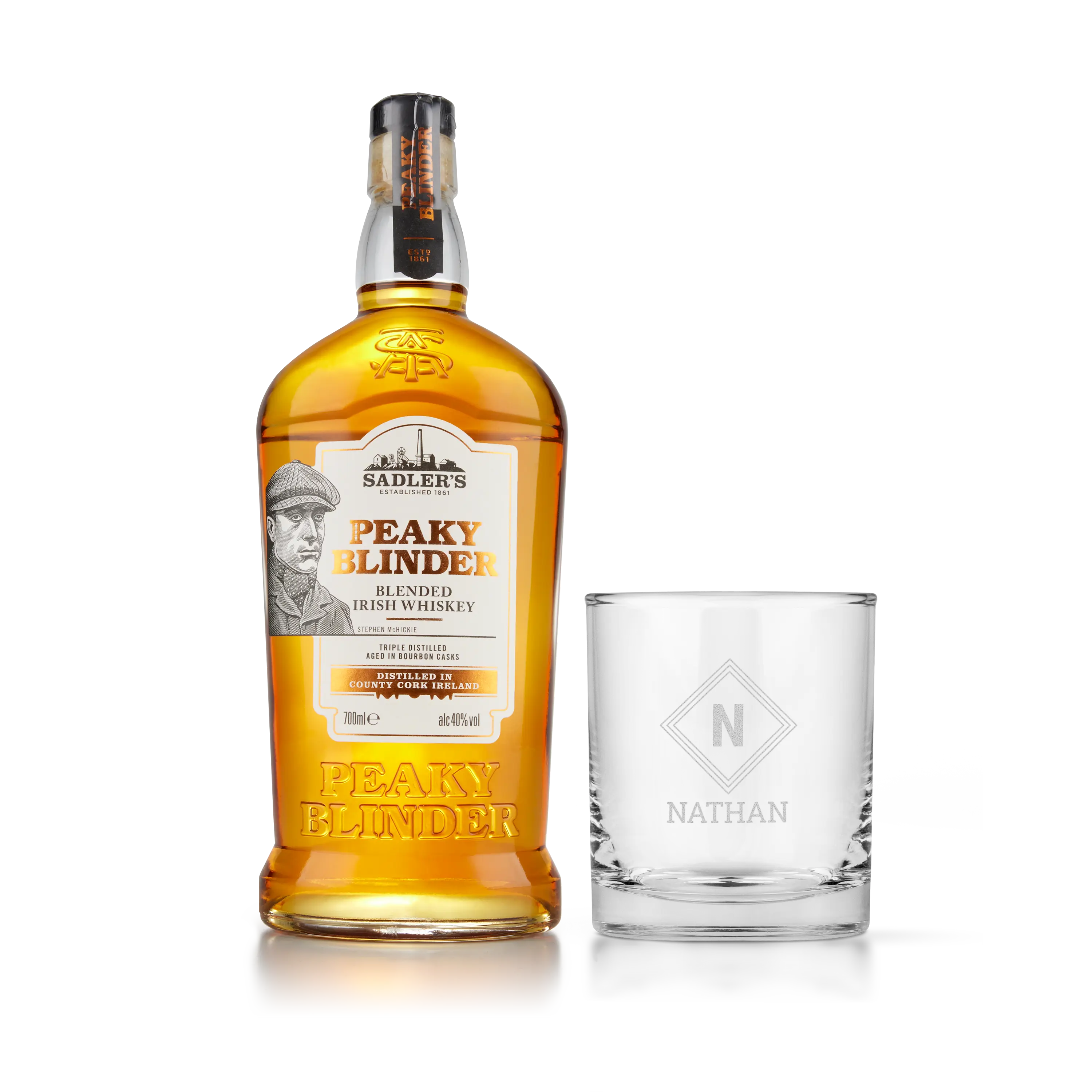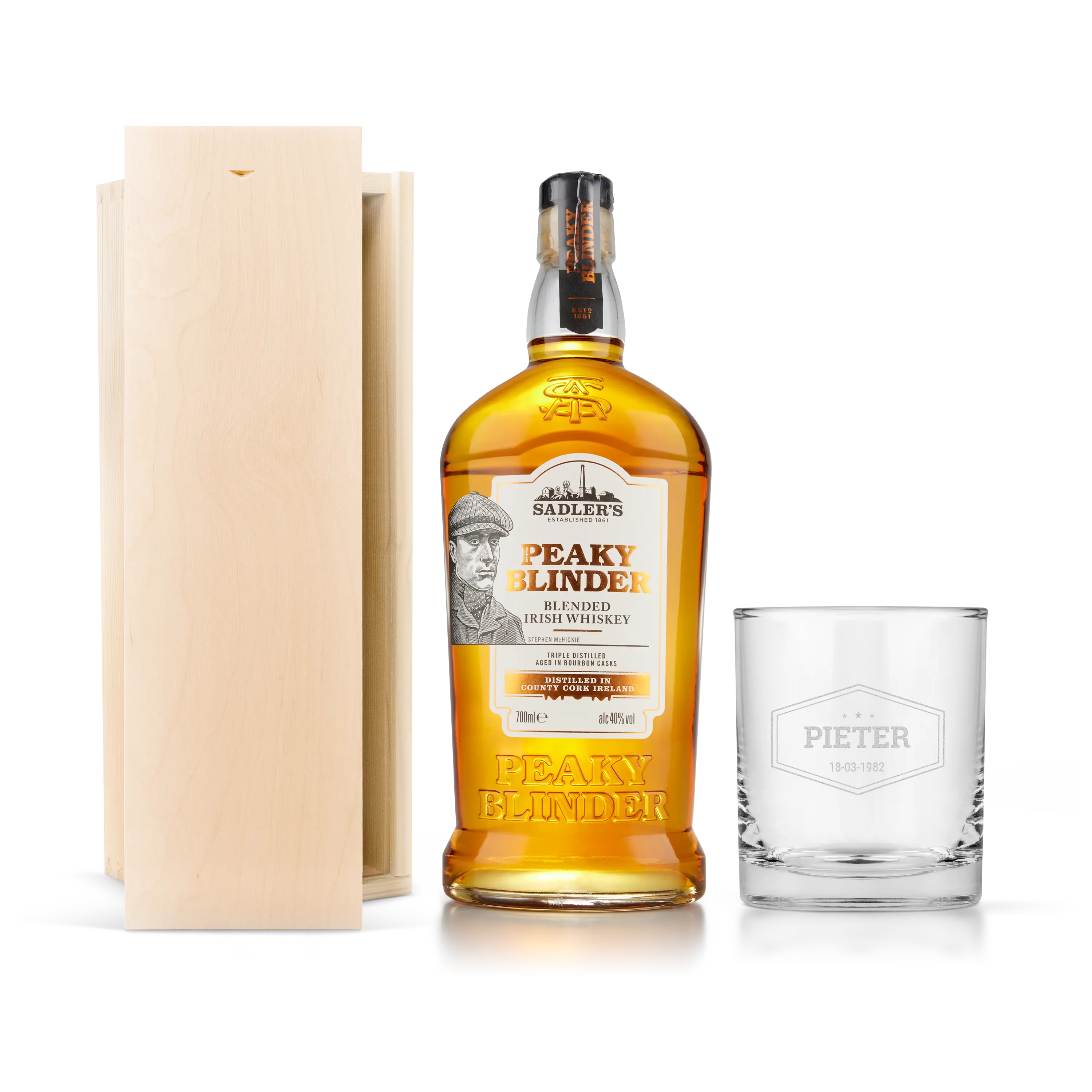 Ispirata alla famosa serie televisiva. Chi sorprenderai con una confezione di whisky Peaky Blinders? Comprende un lussuoso bicchiere da whisky con incisione.Ulteriori informazioni sulla personalizzazionePersonalizzazione: con nome o testo Finitura: incisione al laser di alta qualitàColore dell'incisione: bianco Dimensioni della cassetta: 36,5 x 12 x 11 cmDettagli: la cassetta in legno reca il marchio di omologazione FSCUlteriori dettagli sul whiskyNome: Sadler's Peaky BlinderTipo di whisky: blended Contenuto: 700 mlPaese d'origine: Inghilterra Percentuale alcolica: 40% Carattere: Il whisky irlandese Peaky Blinder è triplo distillato e invecchiato in botti di sherry. È caratterizzato da note di ribes nero, mela e toffee. È possibile assaporare seducenti sfumature di cioccolato, albicocca e arancio.