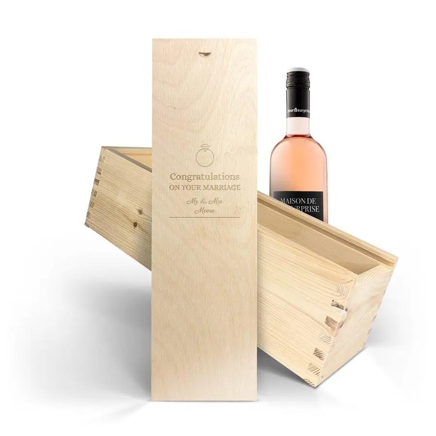 Ulteriori informazioni sulla lussuosa cassa del vino: Personalizzazione: con nome o testo Posizionamento della personalizzazione: sul coperchio della custodia in legno Incisione: incisione laser di alta qualità Dimensioni della cassa: 36,5 x 12 x 11 cm Dimensioni del coperchio: 35,6 x 10,2 x 0,3 cm Il legno è certificato FSC Ulteriori informazioni sul vino: Nome: Maison de la Surprise SyrahPaese: Francia Colore: Rosè Uva: 100% SyrahCaratteristiche: Corposo e bilanciato. SaporeAromi di bacche rosse, rinfrescante e dal sapore pieno.AbbinamentoQuesto vino è perfetto come vino da tutto pasto.