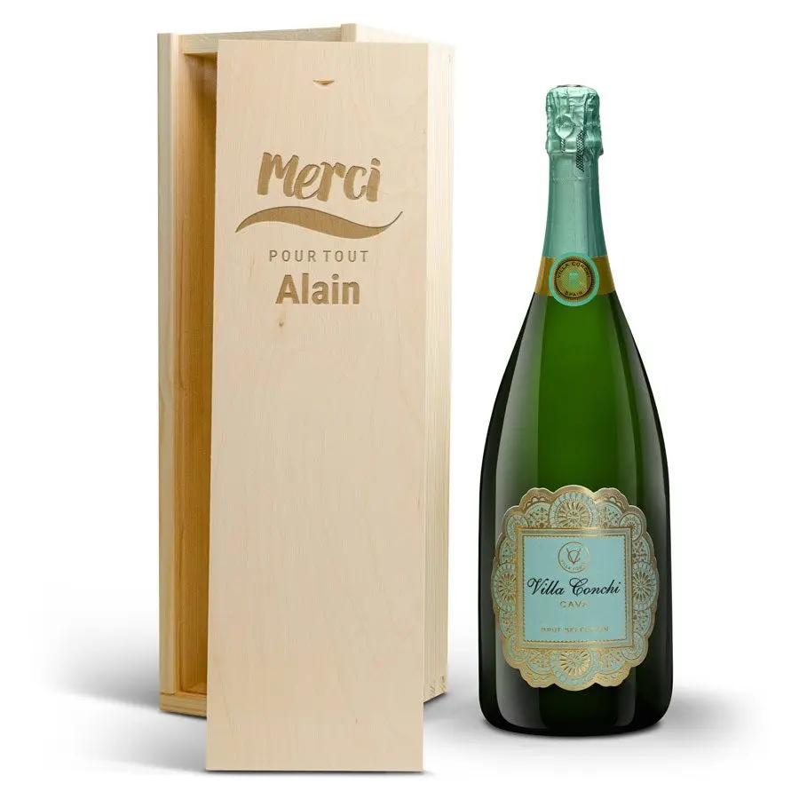 Una deliziosa bottiglia di cava di Villa Conchi in una confezione regalo in legno con il tuo design. Immagine perfetta e a colori!
