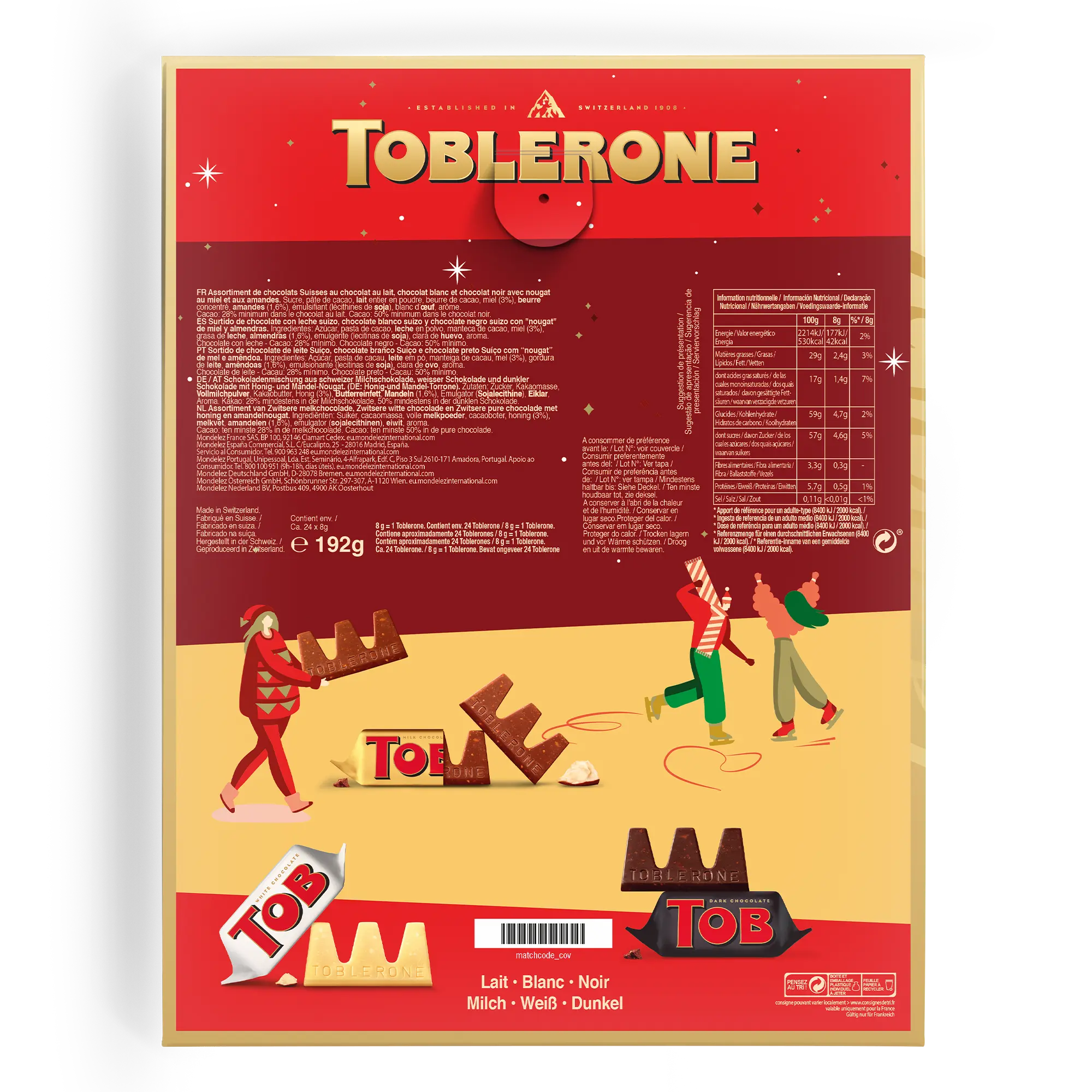 - Edizione Invernale: Cioccolati al latte, bianco e fondente nella iconica forma triangolare di Toblerone.
