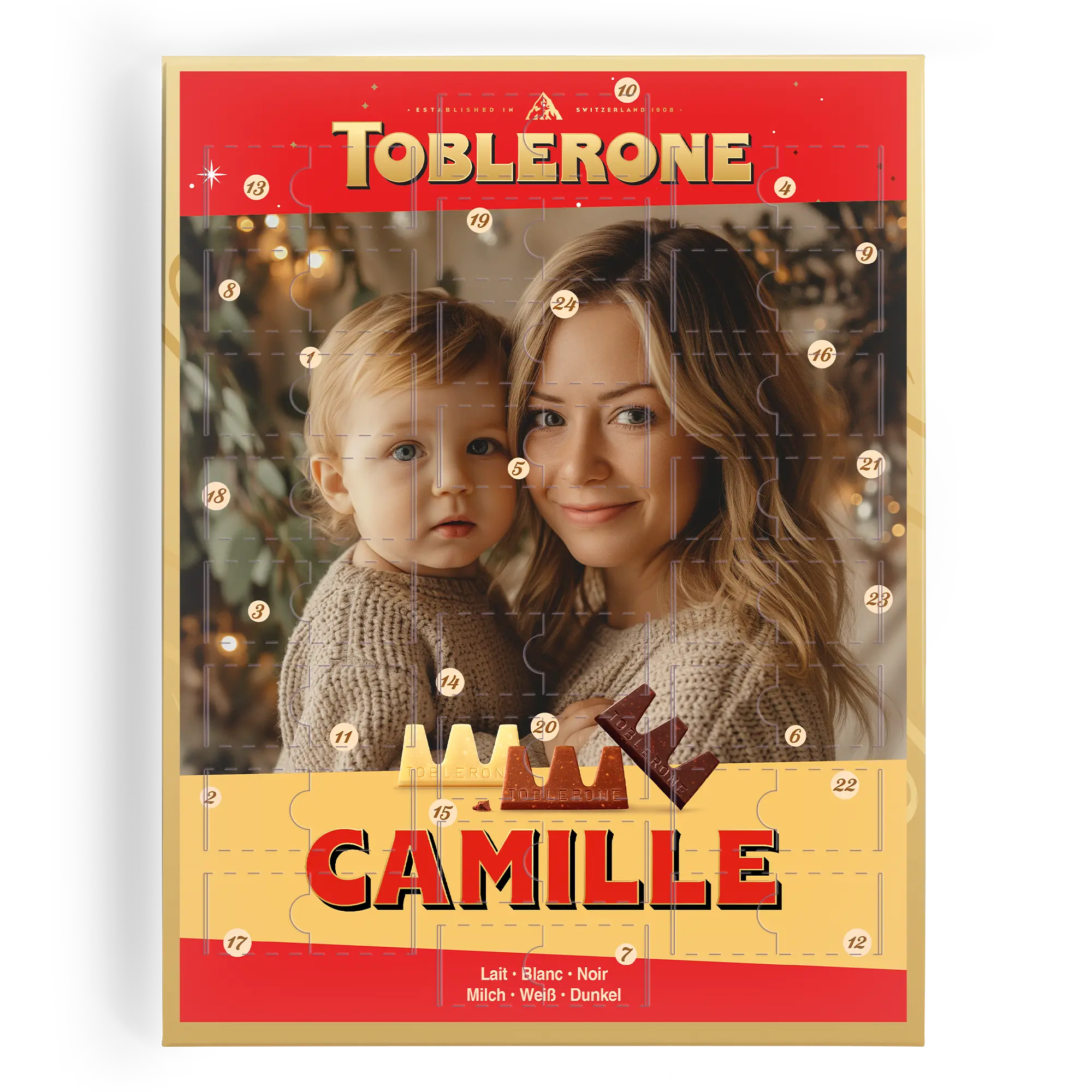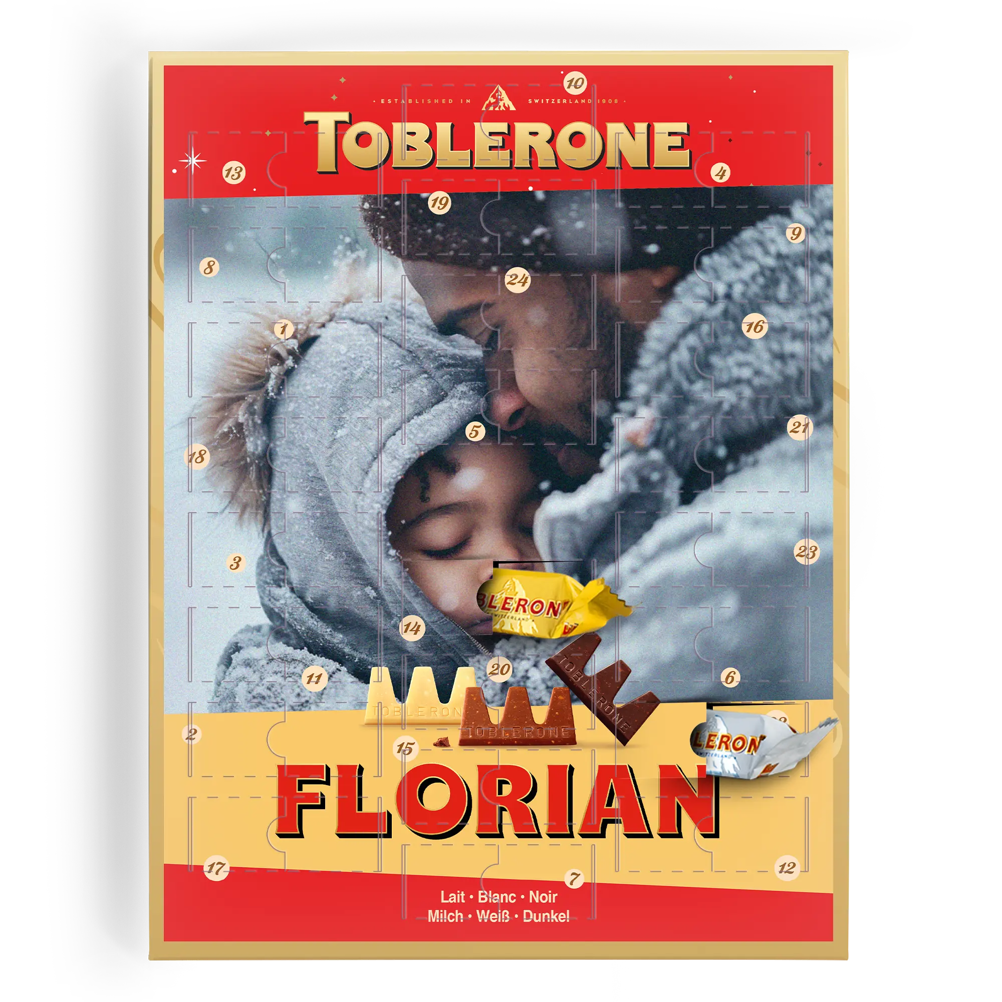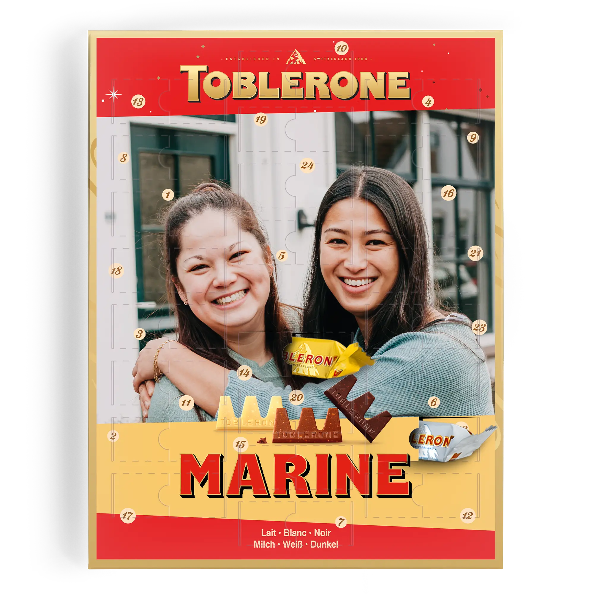 Per chi ama un tocco personalizzato, il Calendario dell'Avvento Toblerone ti permette di contare i giorni fino a Natale con 24 deliziosi cioccolatini. Aggiungi un nome, una foto o un logo per creare un regalo davvero unico.