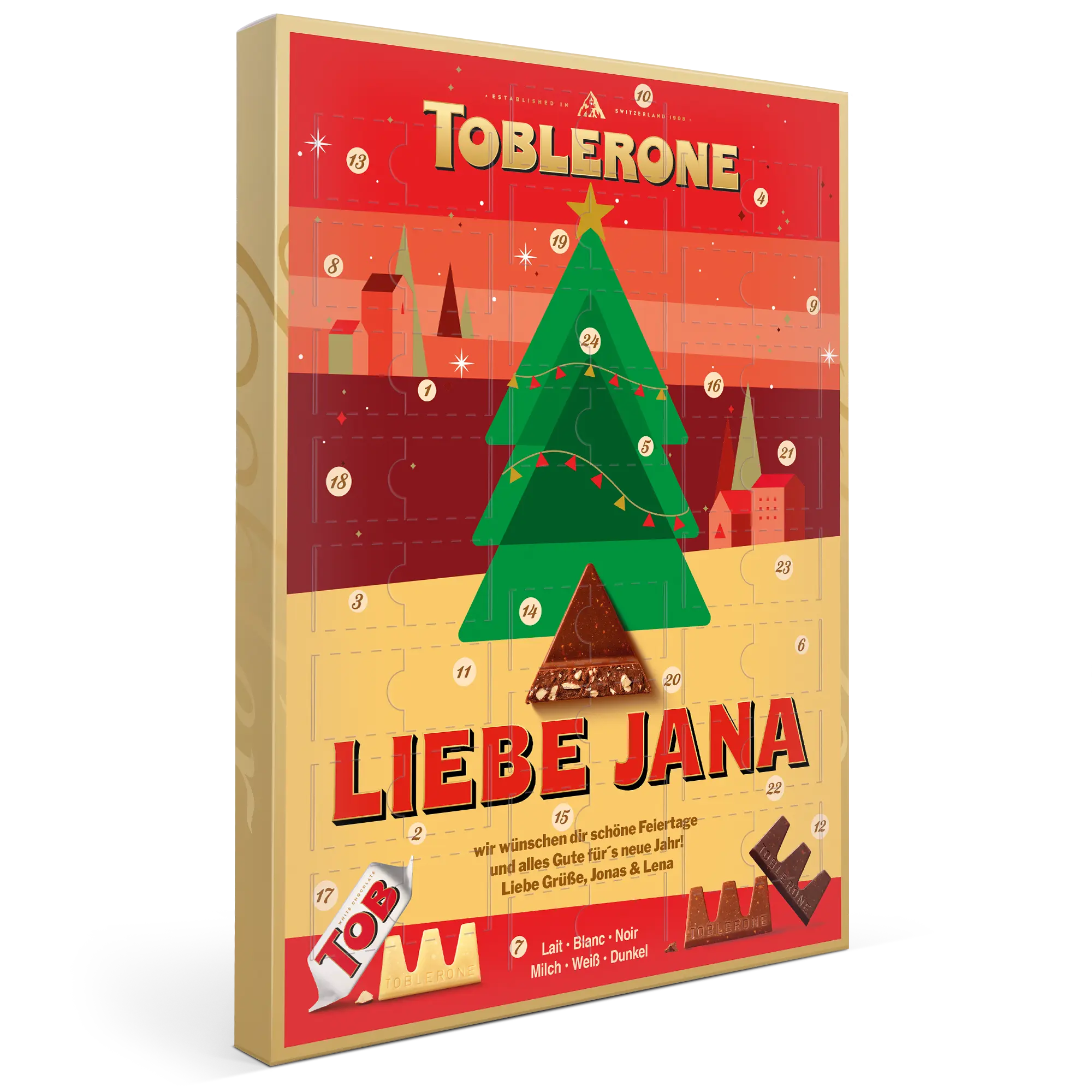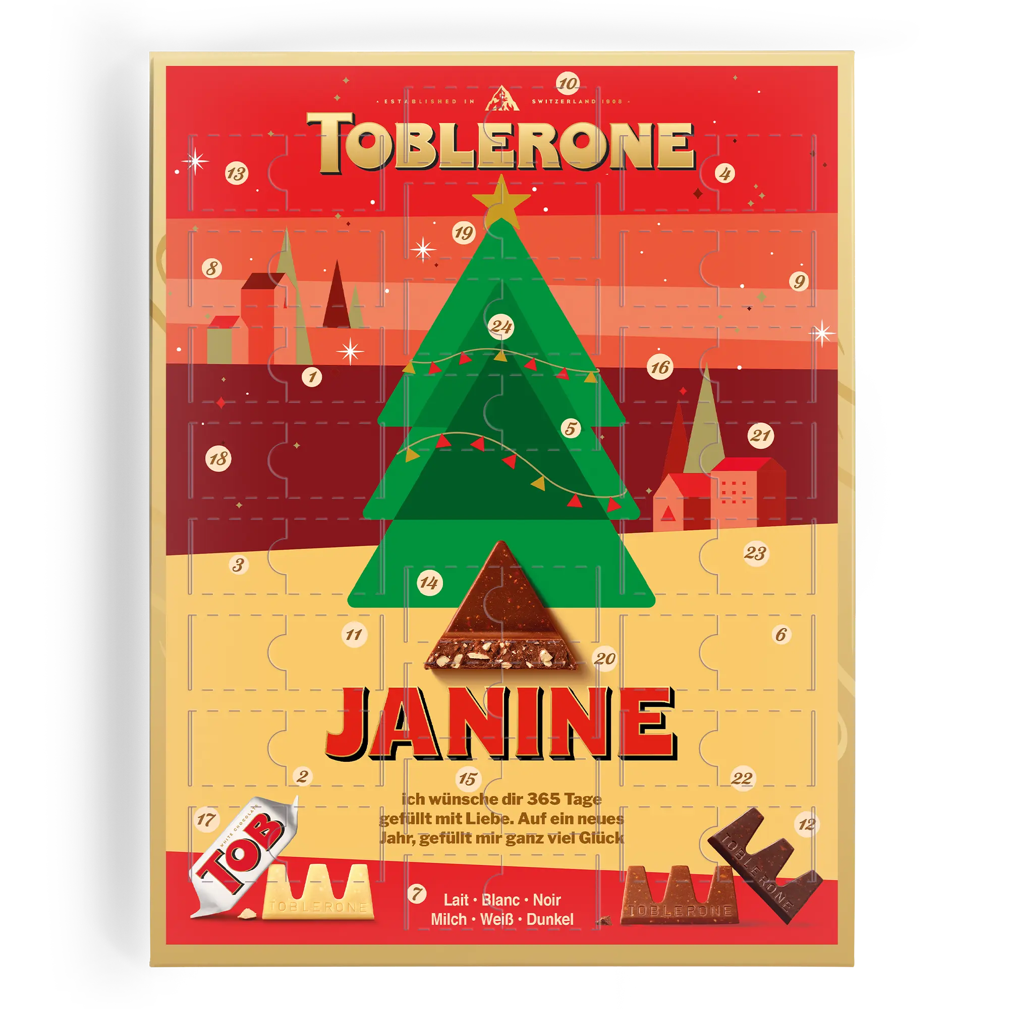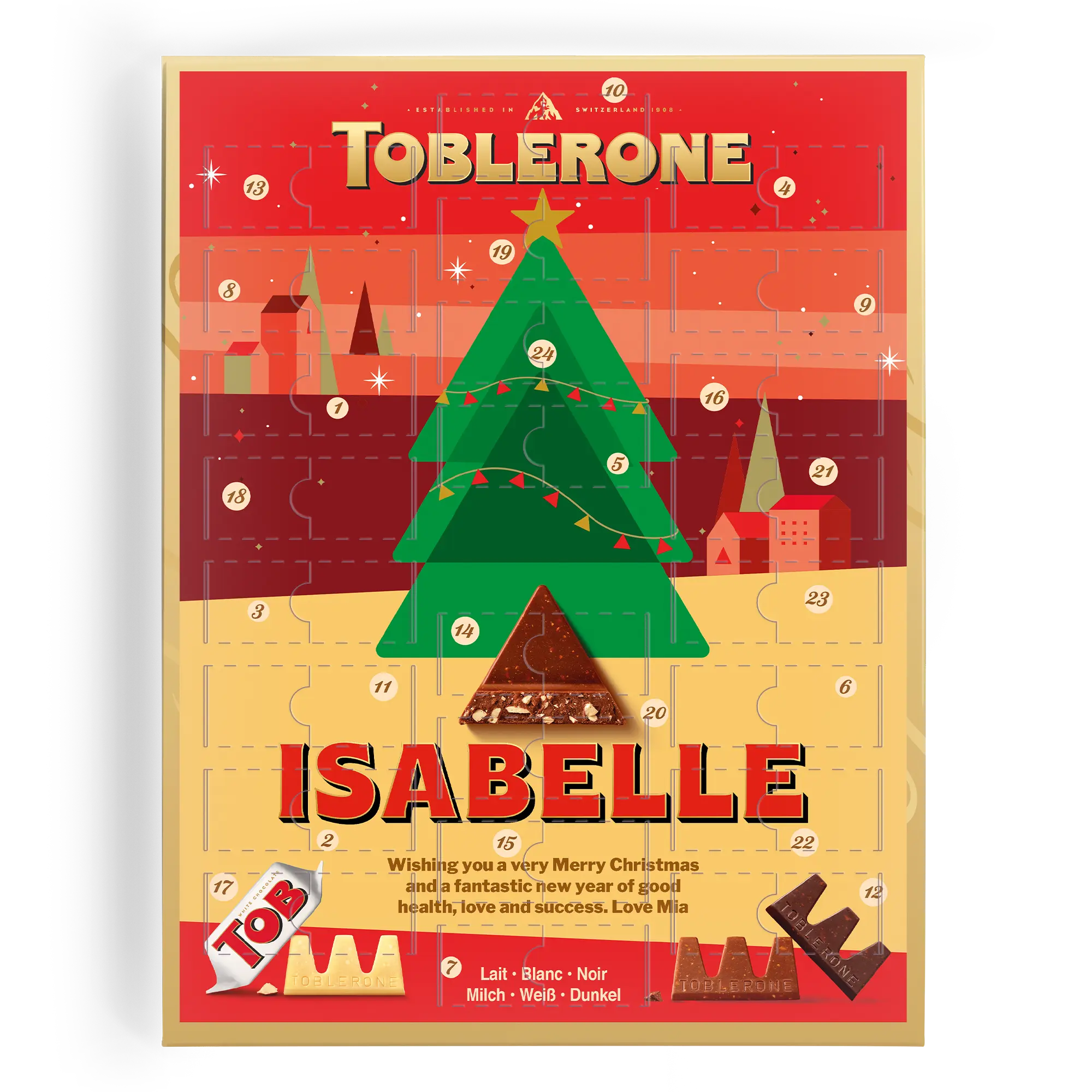 Per chi ama un tocco personalizzato, il Calendario dell'Avvento Toblerone ti permette di contare i giorni fino a Natale con 24 deliziosi cioccolatini. Aggiungi un nome, una foto o un logo per creare un regalo davvero unico.