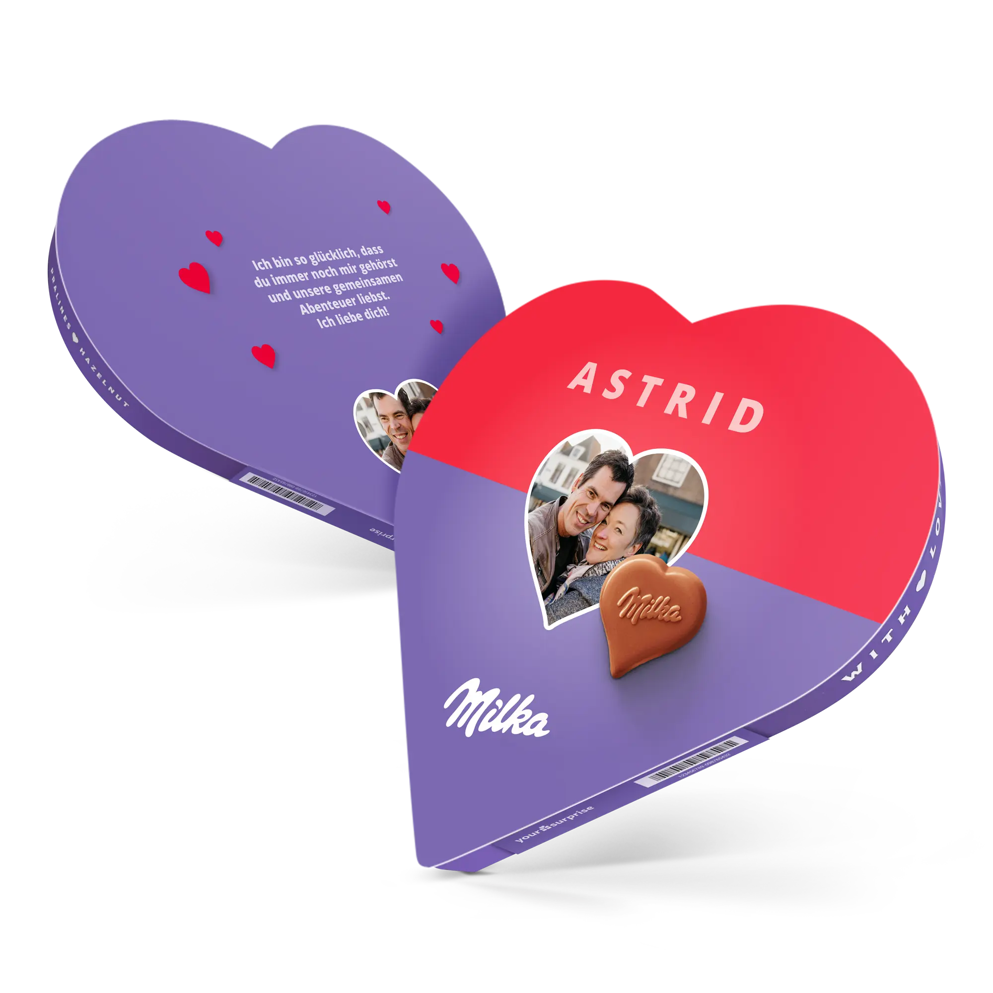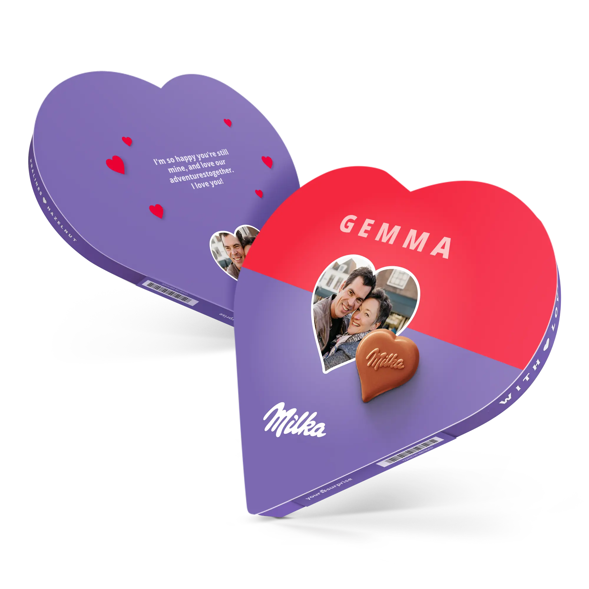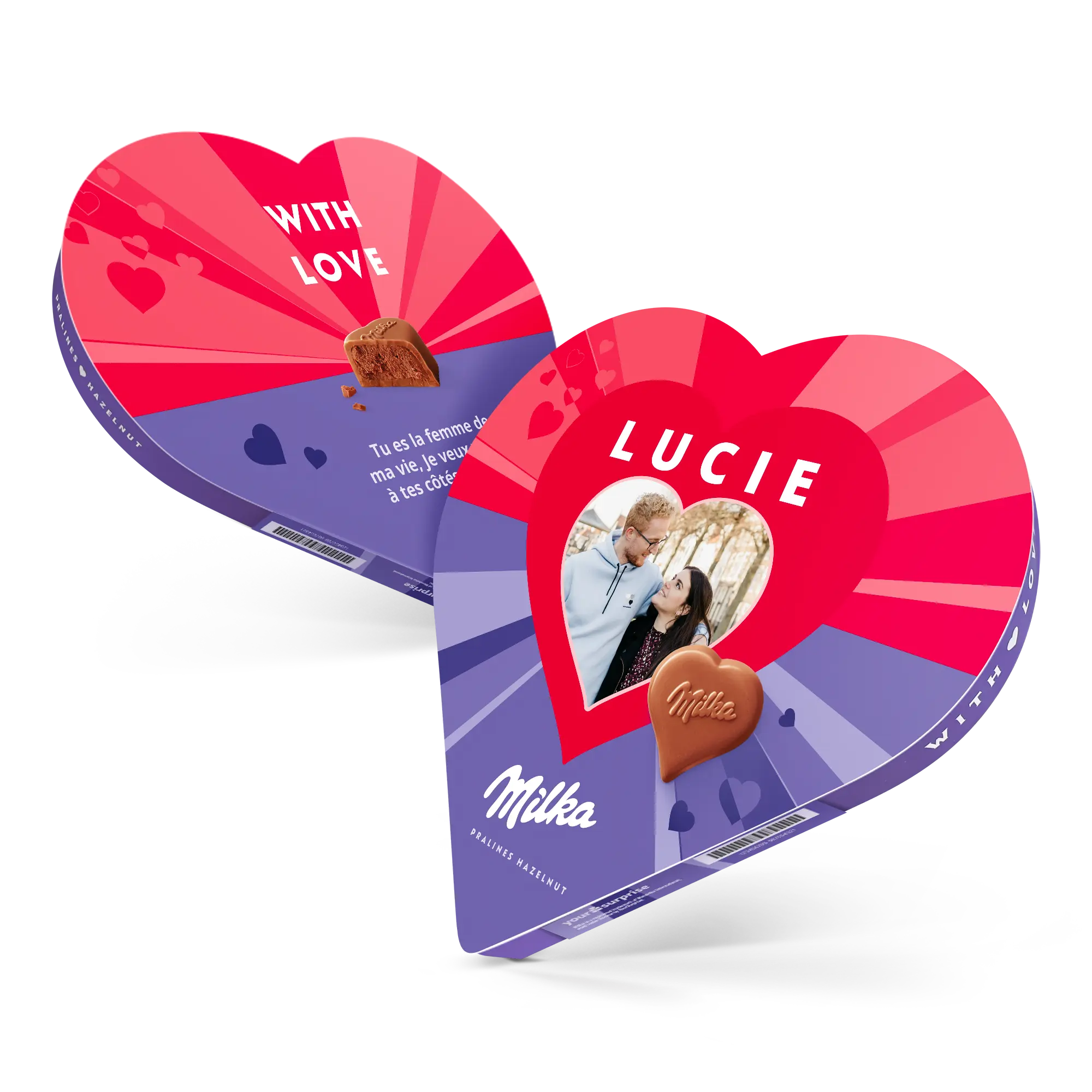 Delizioso cuore Milka con nome. ¡Include 30 praline di cioccolato con morbido ripieno di crema di nocciole!