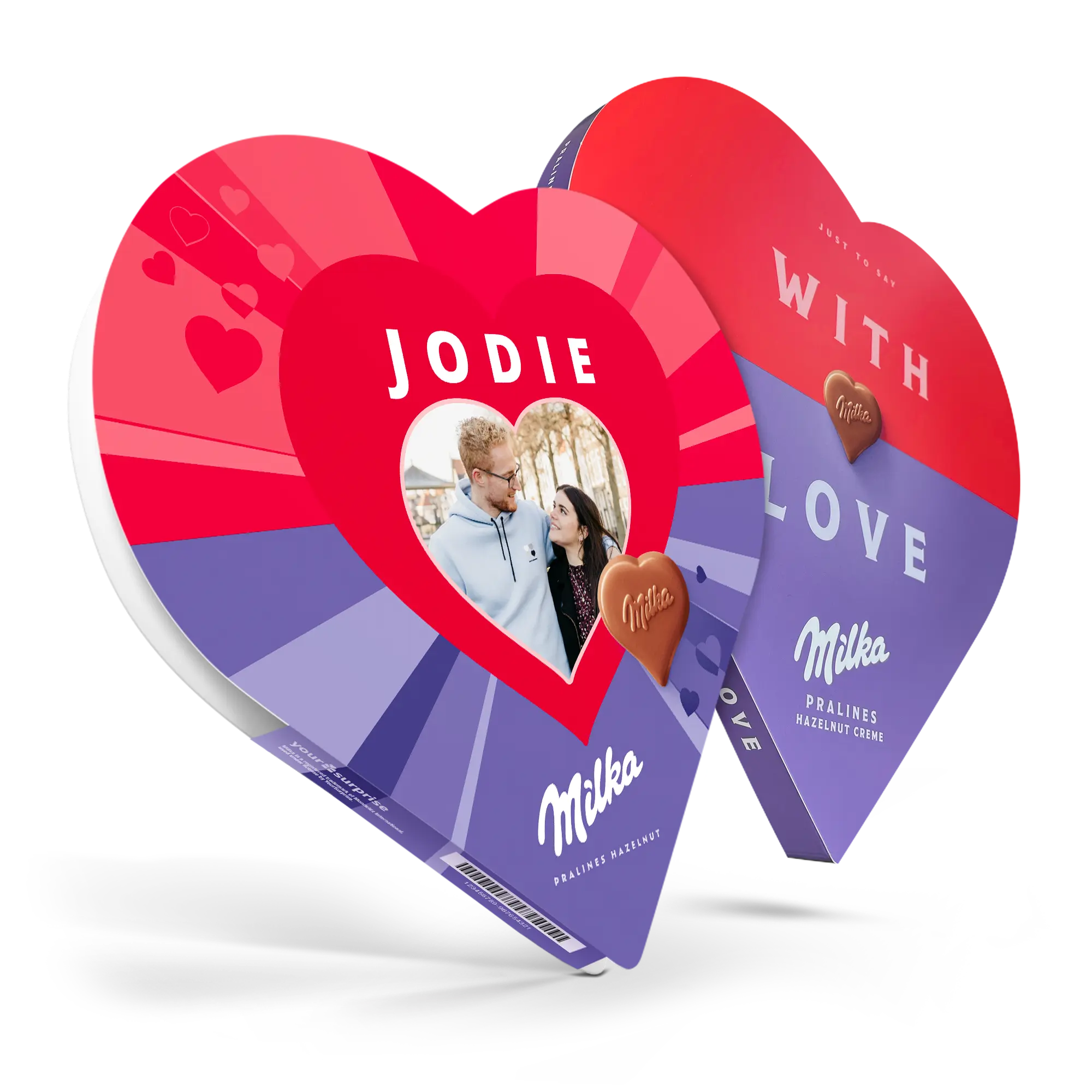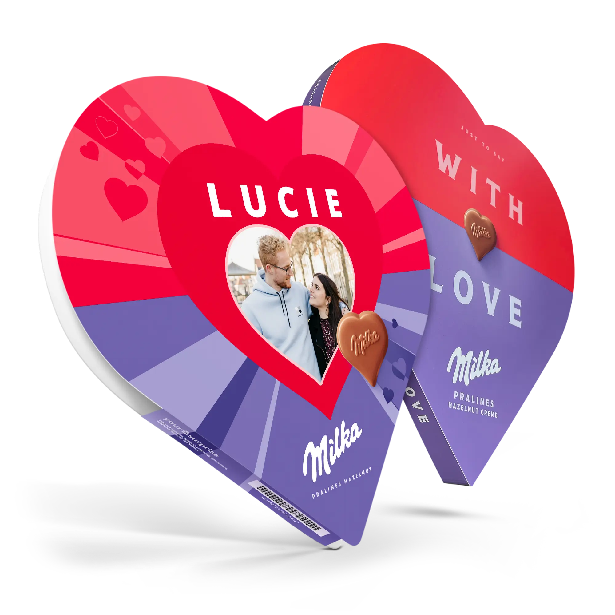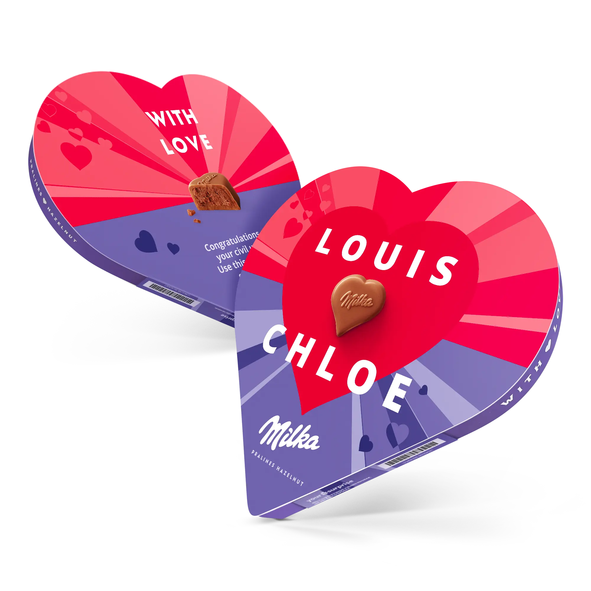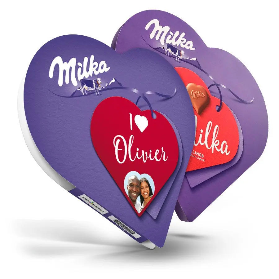 Delizioso cuore Milka con nome. ¡Include 30 praline di cioccolato con morbido ripieno di crema di nocciole!