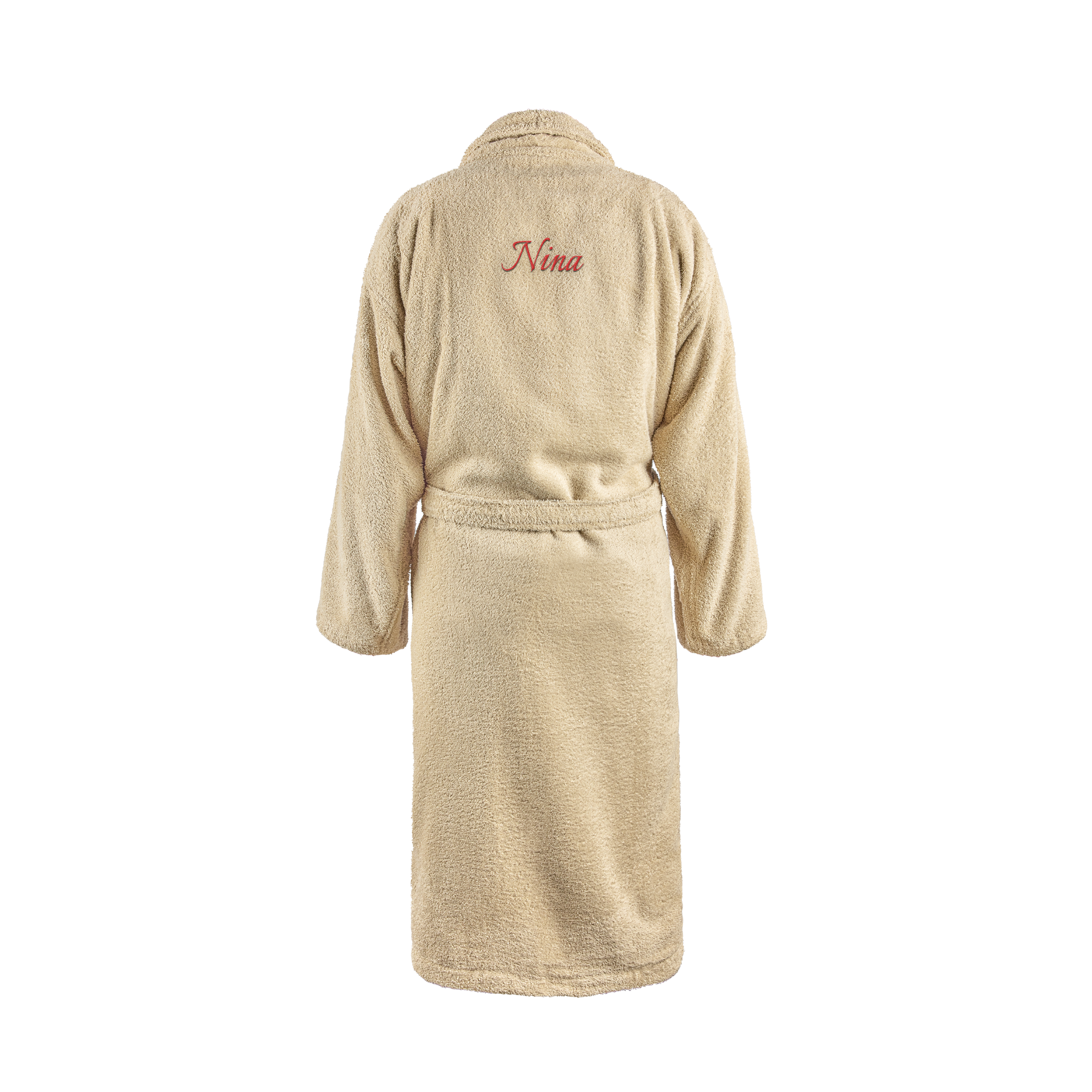 Maggiori informazioni sull'accappatoio: Colore: beigeDimensione: L/XL Materiale: 100% spugna super morbida (cotone)Qualità: 380 gr/m2Modello; standardLunghezza: 120 cm Larghezza della spalle: 21 cm Larghezza della schiena: 65 cm Lunghezza delle maniche: 56 cmPersonalizzazione: con nome e/o altro testo sul retro ricamatiExtra: antistatico e traspiranteIstruzioni per il lavaggio: è possibiel lavare l'accappatoio fino a 40°C