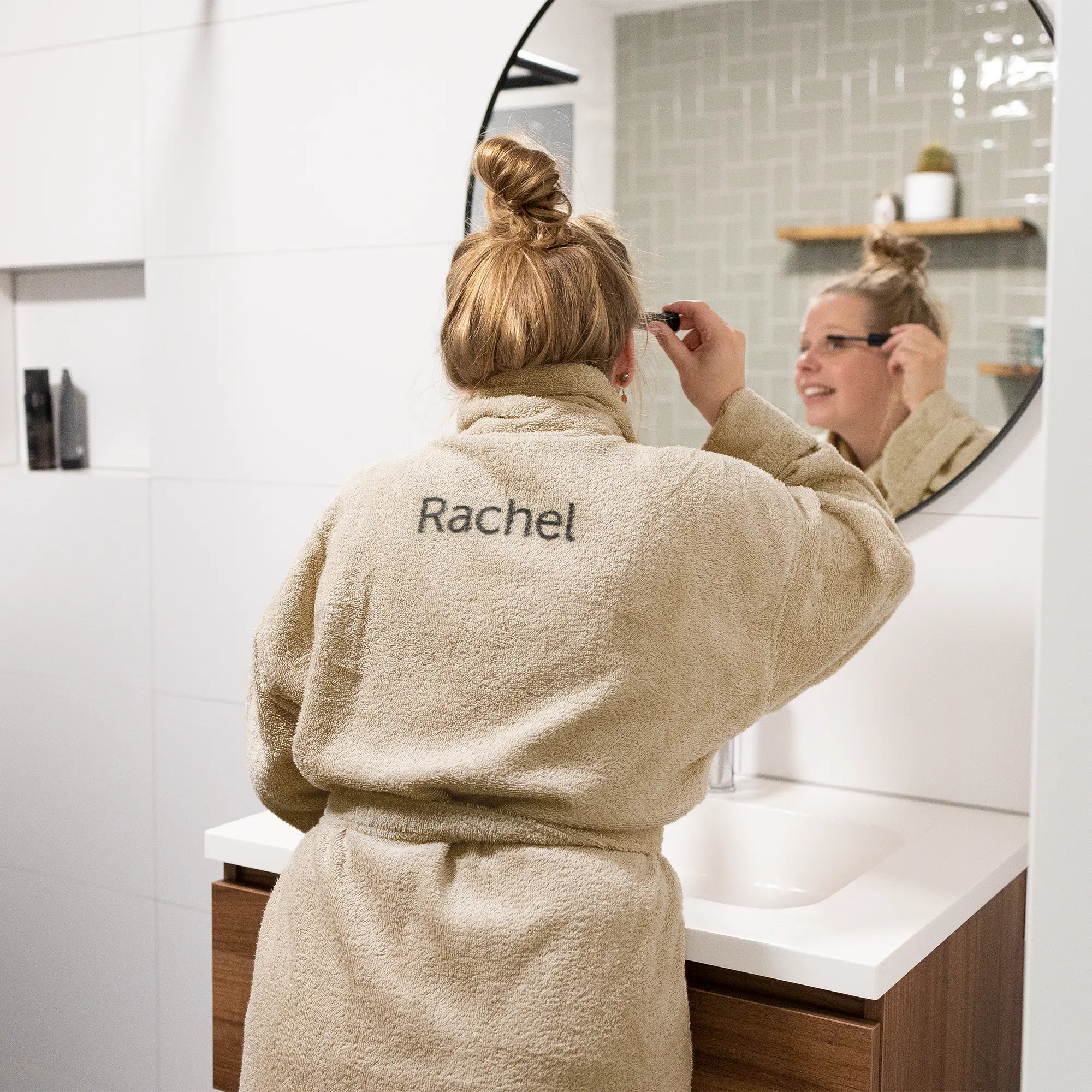 Un classico accappatoio da donna in spugna di cotone 100% (380 gr/m2) con il tuo nome ricamato. Bellissimo e comodissimo da indossare!