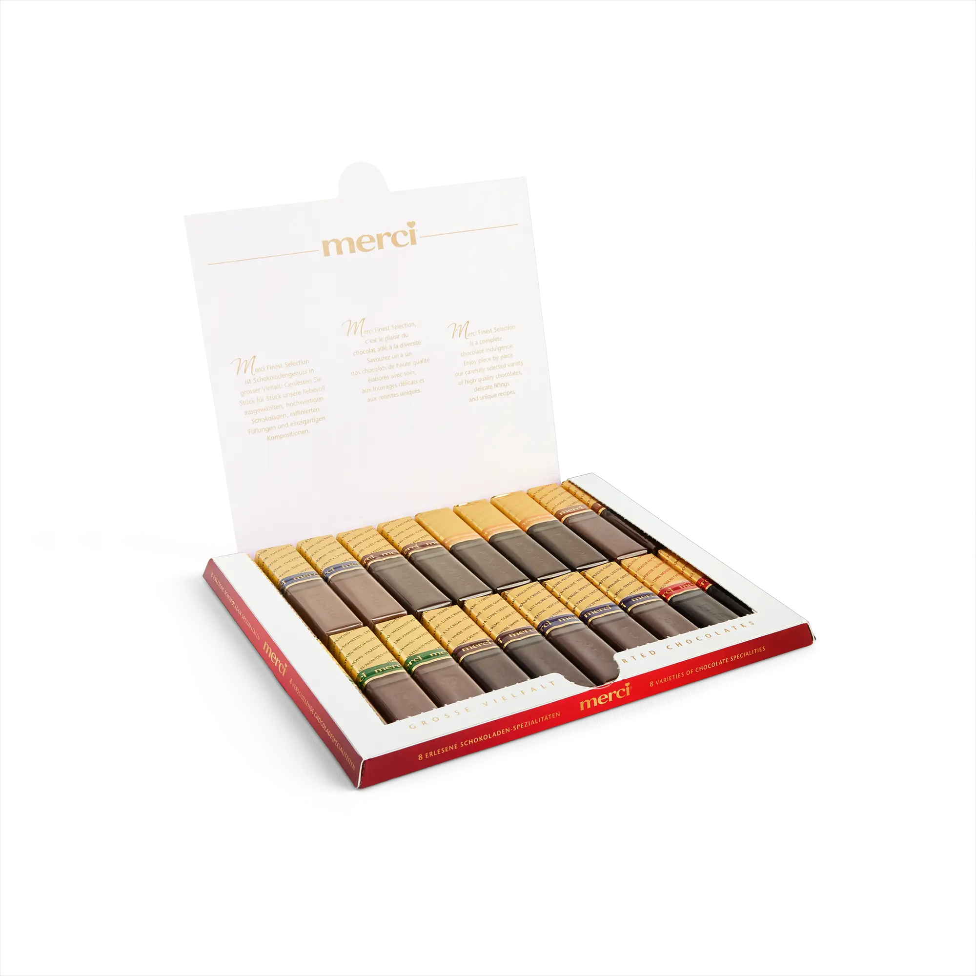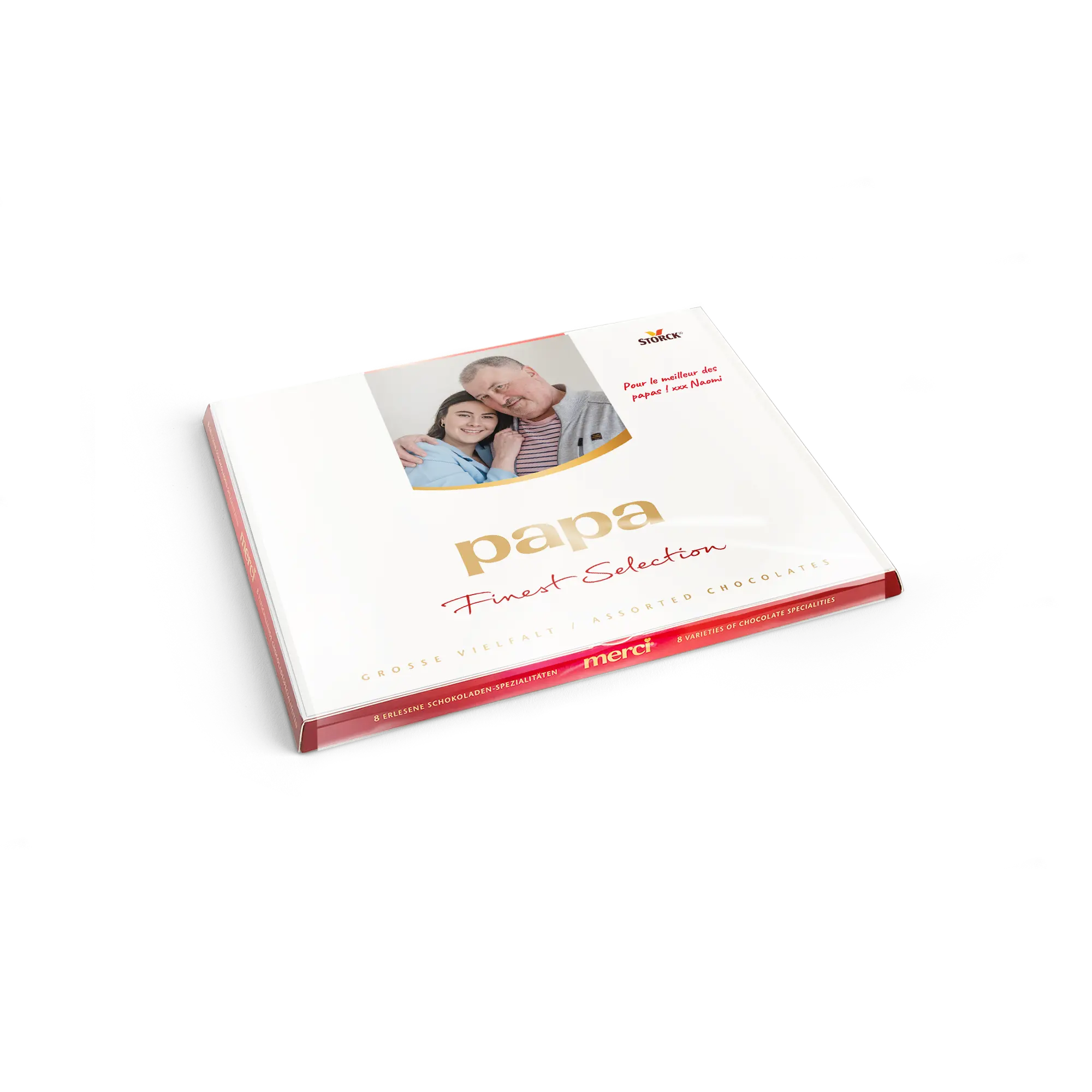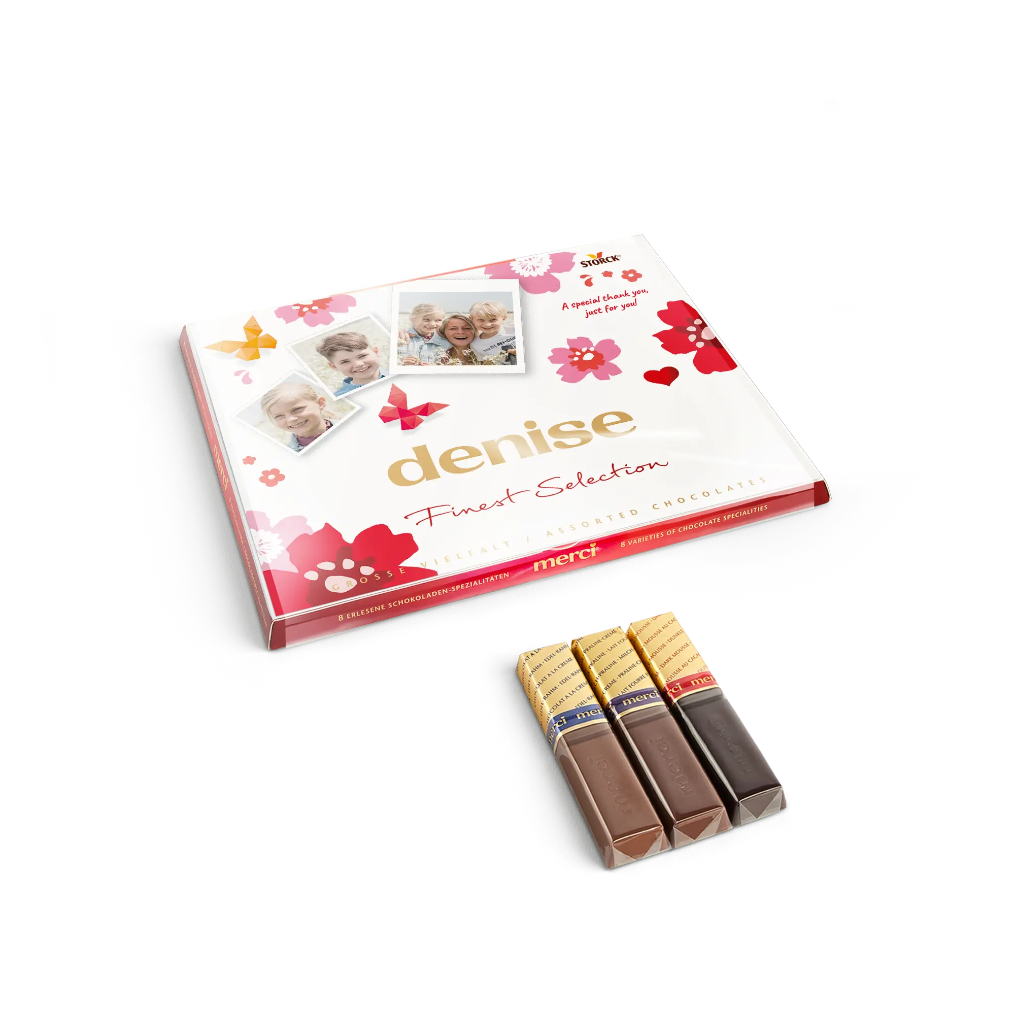 Una scatola di cioccolatini Merci con un biglietto personalizzato che presenta la foto, il nome e/o il testo di tua scelta. Design classico Merci!Ulteriori informazioni sui cioccolatini Merci: Cioccolato: Un mix di cioccolato al latte, pralina di latte, cioccolato alle nocciole e mandorle, pralina di nocciole, cioccolato fondente, crema al caffè, mousse al cioccolato fondente, marzapane Numero di cioccolatini: 20 Peso: 250 grammi Dimensioni della scatola: 19,5 x 16 x 1,5 cm Dimensioni del biglietto piegato: 18,5 x 14,8 cm Personalizzazione: con nome, foto e messaggio personale Stampa: perfetta e a colori vivaci Quando la temperatura esterna è di 25 gradi Celsius o superiore non possiamo garantire la qualità del cioccolato. Se hai domande riguardo ai tuoi ordini di cioccolato, ti preghiamo di contattare il nostro servizio clienti. Per motivi tecnici, non è possibile utilizzare caratteri cirillici, turchi, asiatici, arabi, greci o caratteri speciali.